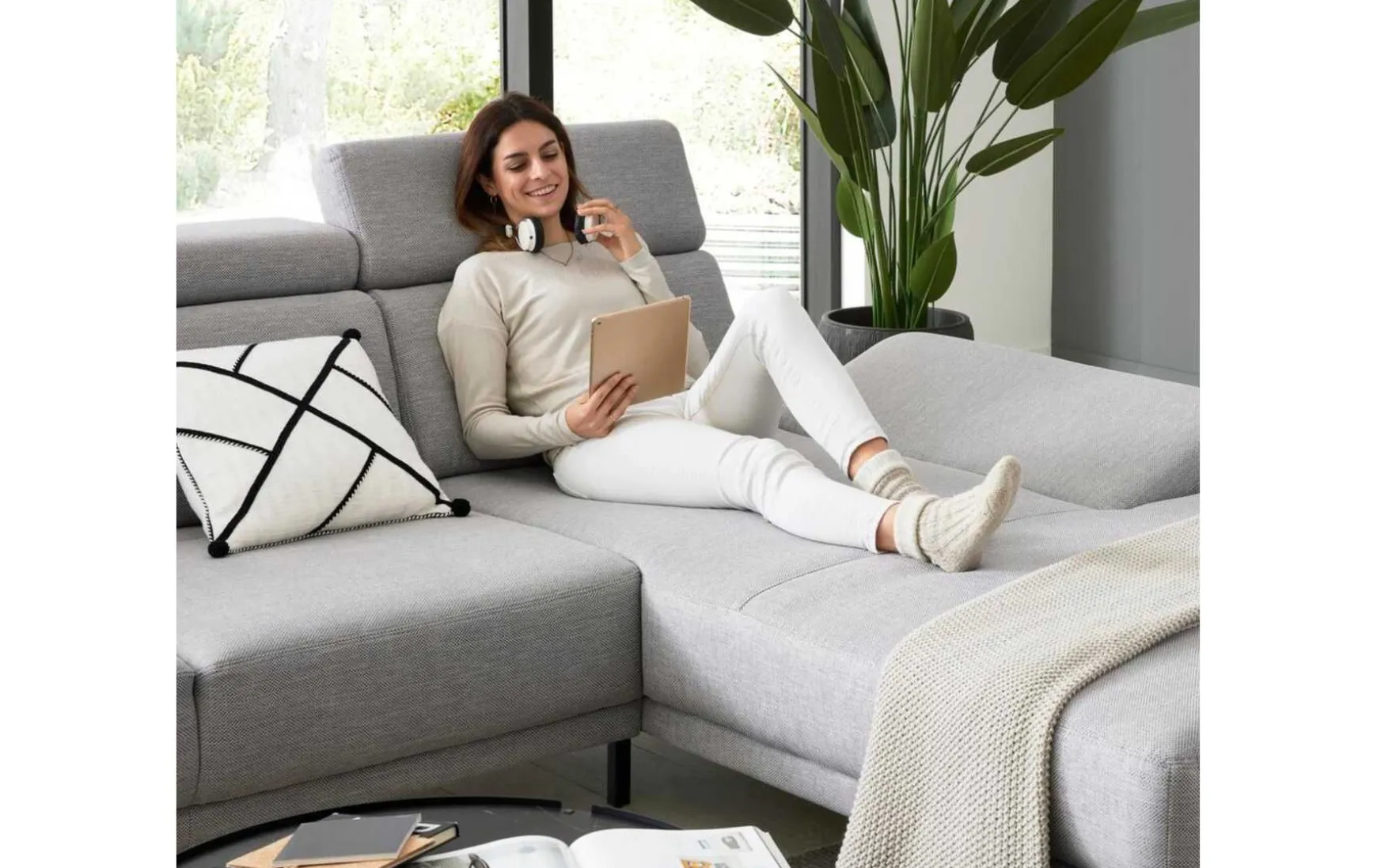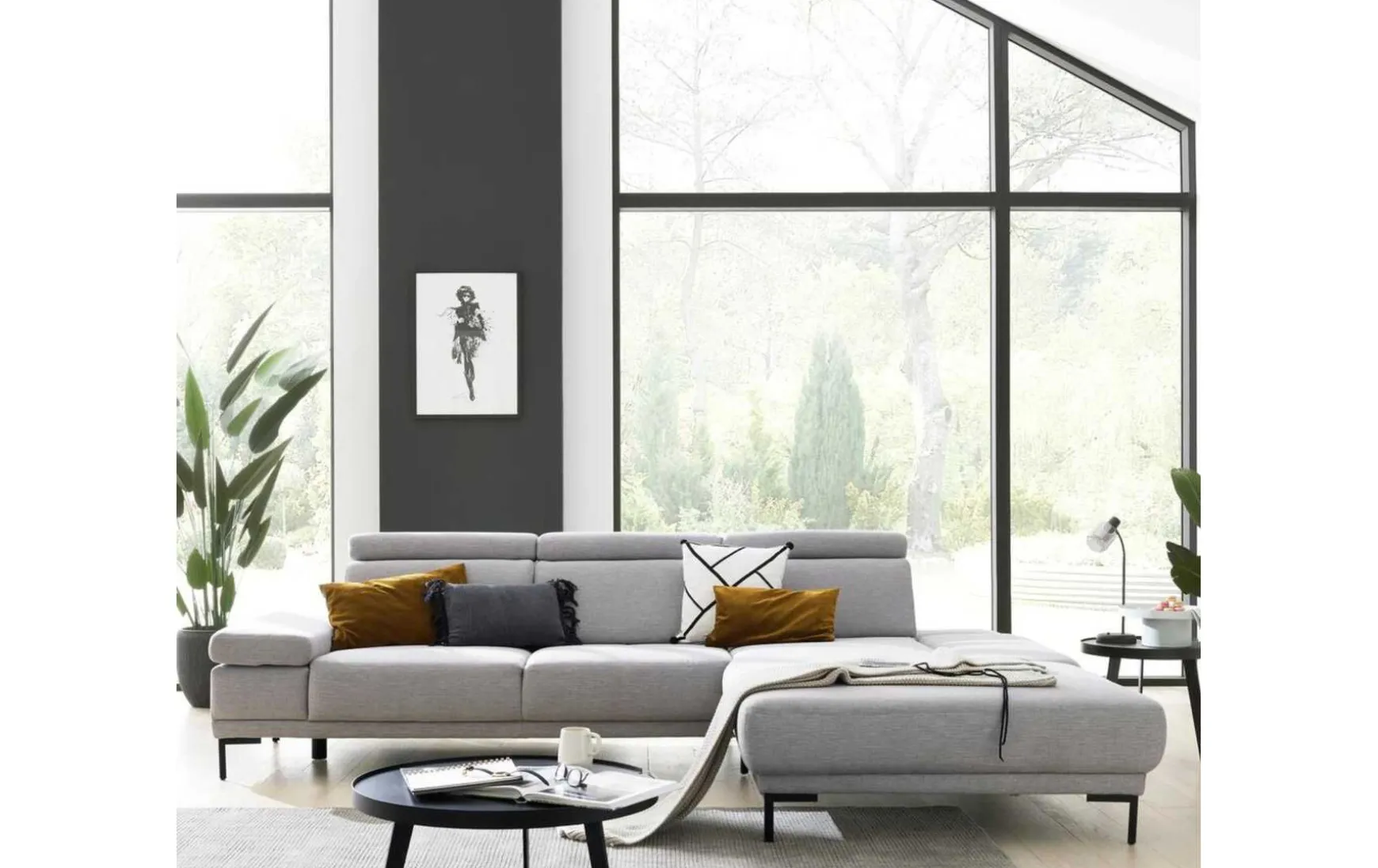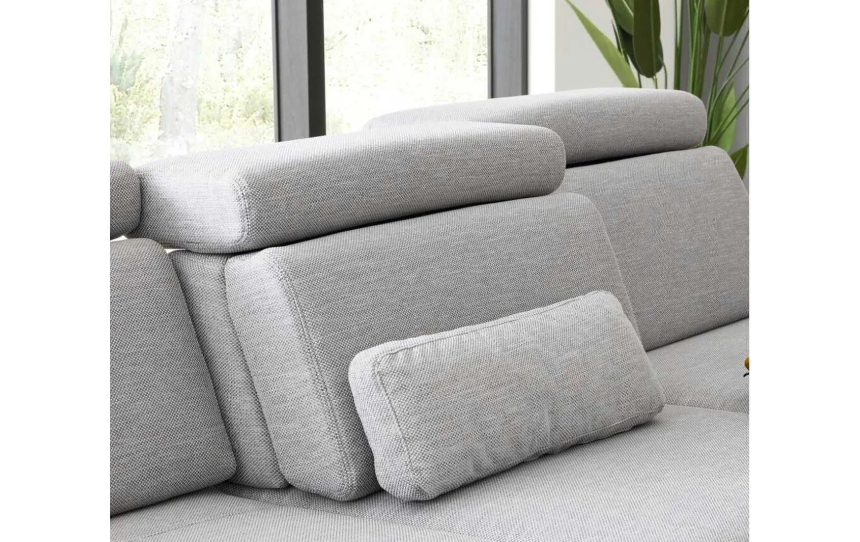 Diese Polsterecke mit platinfarbenem Bezug besteht zum einen aus dem 2-Sitzer mit fester Armlehne links und Sitztiefenverstellung und zum anderen aus dem Longchair mit klappbarer Armlehne und ohne Sitztiefenverstellung. Die Stellfläche der Polstergarnitur beträgt ca. 300 x 225 cm (BxL, von links nach rechts). Abgerundet wird das Sitzmöbel mit mattschwarzen Metallfüßen