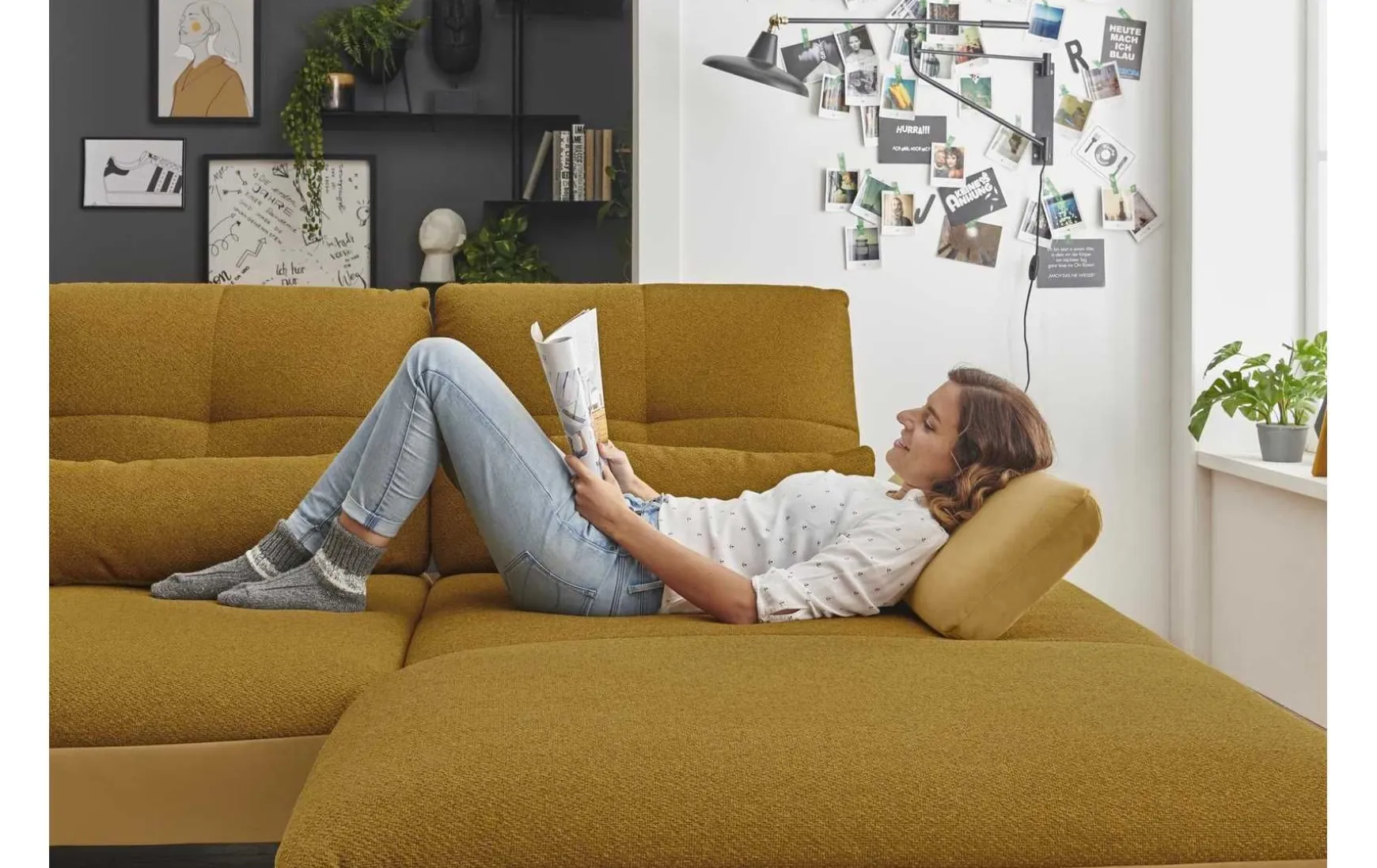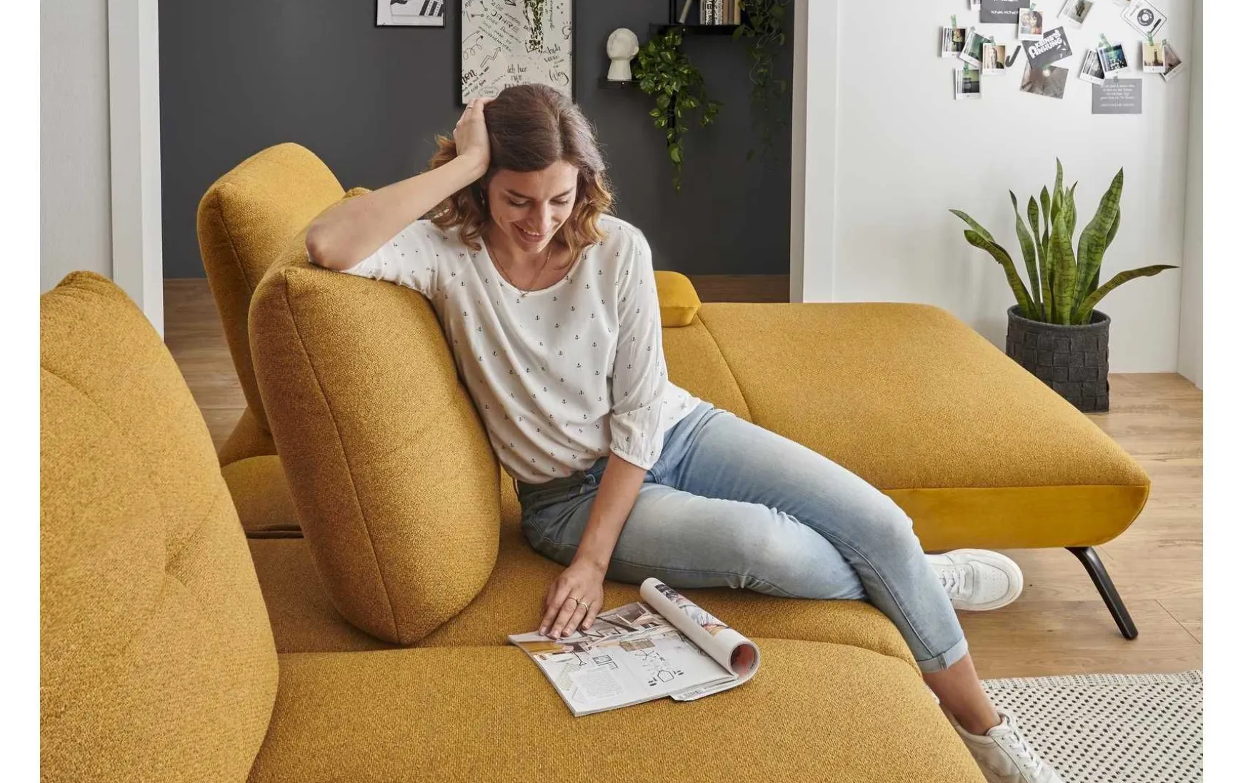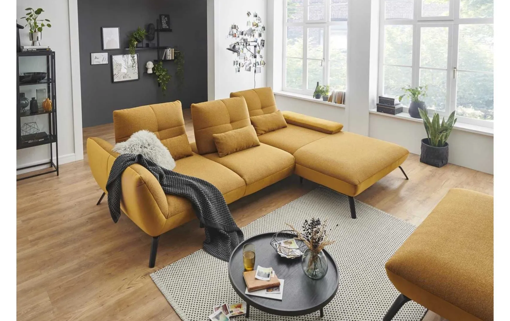 Diese moderne Polsterecke mit 3-Sitzer und Longchair verbindet stilvolles Design mit hohem Sitzkomfort und flexibler Funktionalität. Der edle Stoffbezug in Riviera Gold setzt einen eleganten Akzent und macht die Couch zum echten Blickfang im Wohnraum. Dank L-Form eignet sie sich ideal für großzügige Wohnkonzepte und lädt zum Entspannen ein. Für individuellen Komfort sorgen die drei verstellbaren Schwenkrücken, die sich flexibel an Ihre Sitz- und Liegeposition anpassen lassen. Zusätzlich erhöhen die inkludierten Nierenkissen den ergonomischen Sitzkomfort – perfekt für lange Abende auf dem Sofa. Der Kaltschaumsitz bietet eine angenehme Balance aus Weichheit und Unterstützung, während der echt bezogene Rücken eine freie Platzierung im Raum ermöglicht. Das stabile Metallgestell mit schwarzen, matten Füßen unterstreicht den modernen Look und sorgt für sicheren Stand. Die Polsterecke wird vormontiert geliefert und ist somit schnell einsatzbereit. Optional lässt sie sich gegen Mehrpreis individuell erweitern, z. B. mit Armteilverstellung, Rückenneigung oder einem passenden Hocker.
