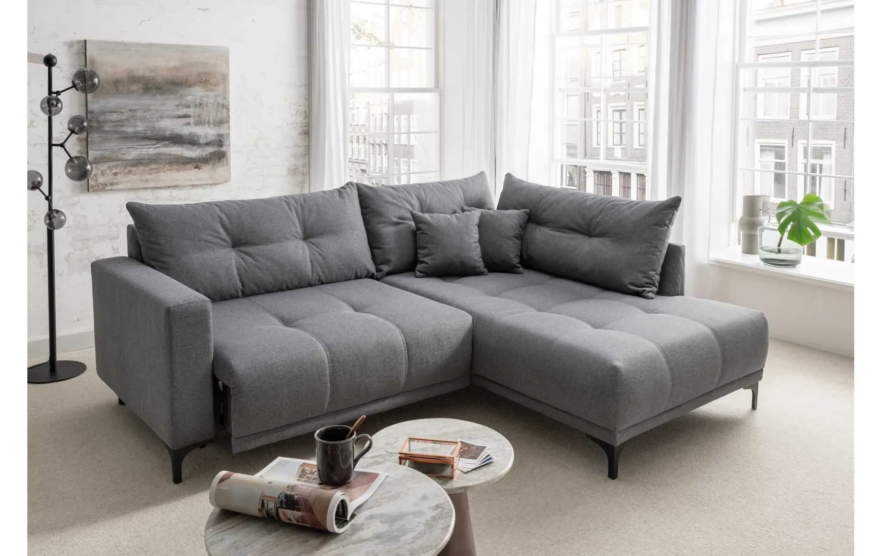 Die moderne Polsterecke in Anthrazit Grau vereint Komfort und stilvolles Design in einem eleganten 2-Sitzer. Mit elektrischer Sitzverstellung und Ottomane auf der rechten Seite passt sie perfekt in moderne Wohnzimmer. Der Sitzkomfort wird durch hochwertigen Komfortschaum auf Wellenunterfederung gewährleistet, während die Sitzhöhe von 43 cm ein bequemes Ein- und Aussteigen ermöglicht. Die schwarzen Metallfüße unterstreichen das zeitgemäße Design und sorgen für Stabilität. Ob als entspannter Rückzugsort oder Mittelpunkt des Wohnbereichs – diese Polsterecke verbindet Funktionalität mit ästhetischem Anspruch.