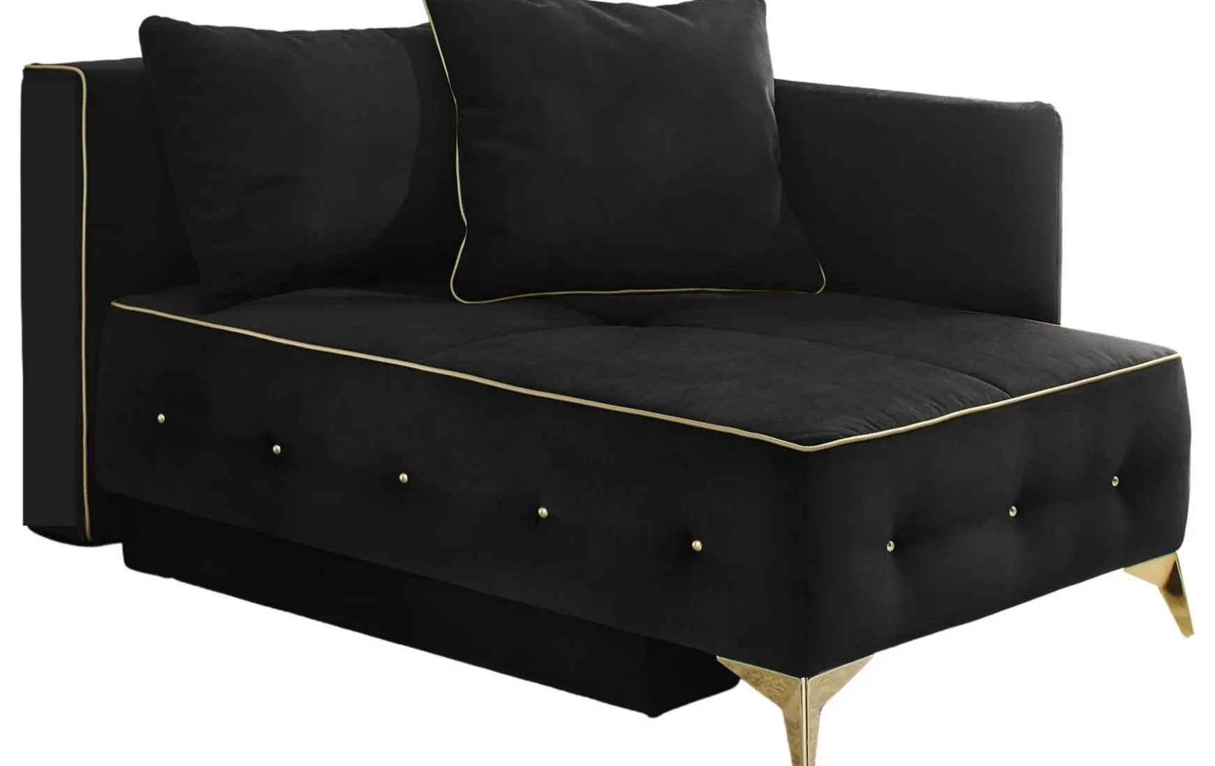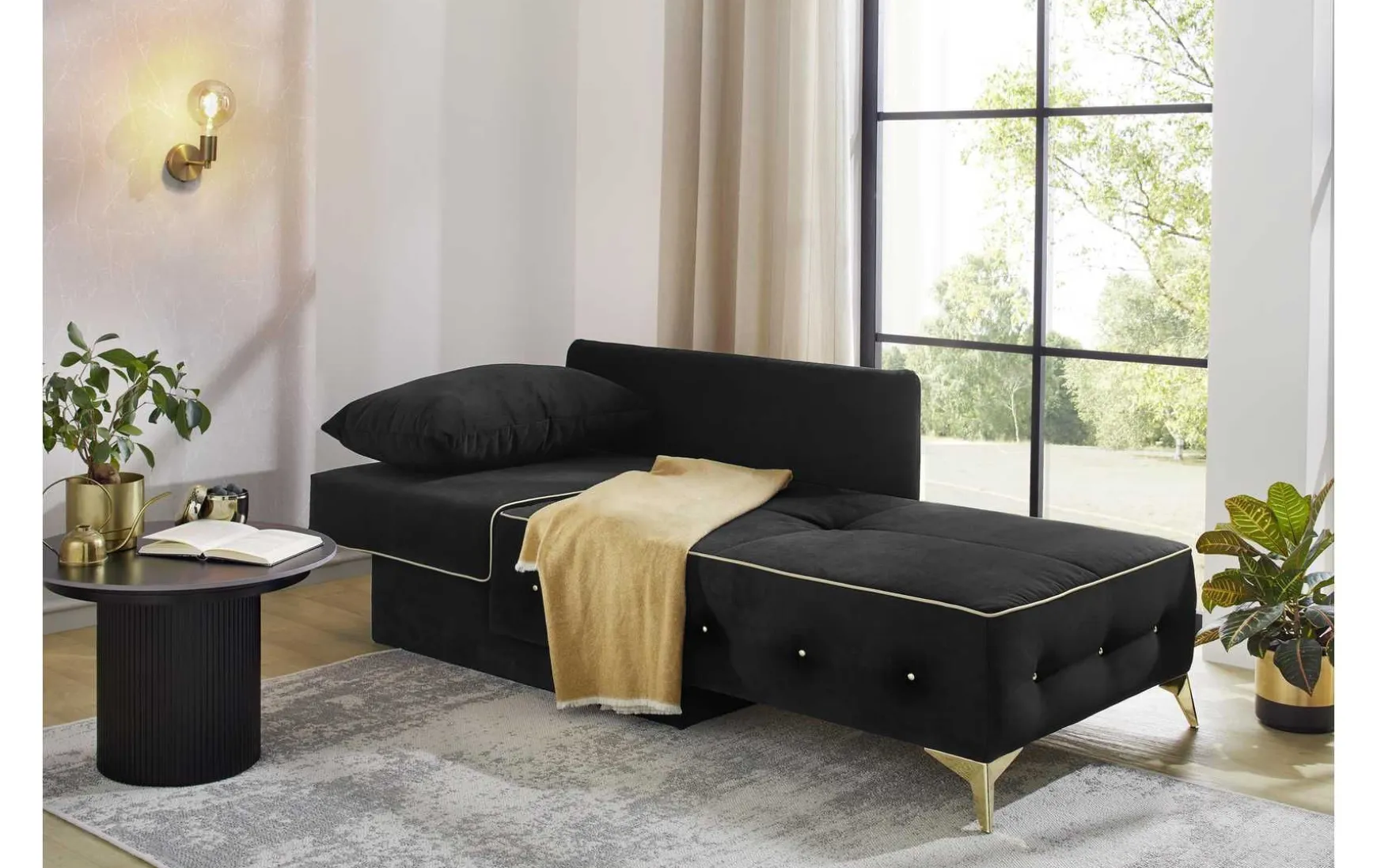 Diese moderne Recamiere in elegantem Schwarz überzeugt durch ihr stilvolles Design und hohen Komfort. Der samtartige Stoffbezug verleiht dem Möbelstück eine besonders edle Optik und sorgt gleichzeitig für ein angenehmes Sitz- und Liegegefühl. Dank der integrierten Schlaffunktion lässt sich die Recamiere im Handumdrehen in eine komfortable Liegefläche von ca. 82 x 203 cm verwandeln – ideal für Gäste oder entspannte Ruhepausen. Die goldfarbenen Metallfüße setzen einen luxuriösen Akzent und runden das moderne Gesamtbild perfekt ab.
