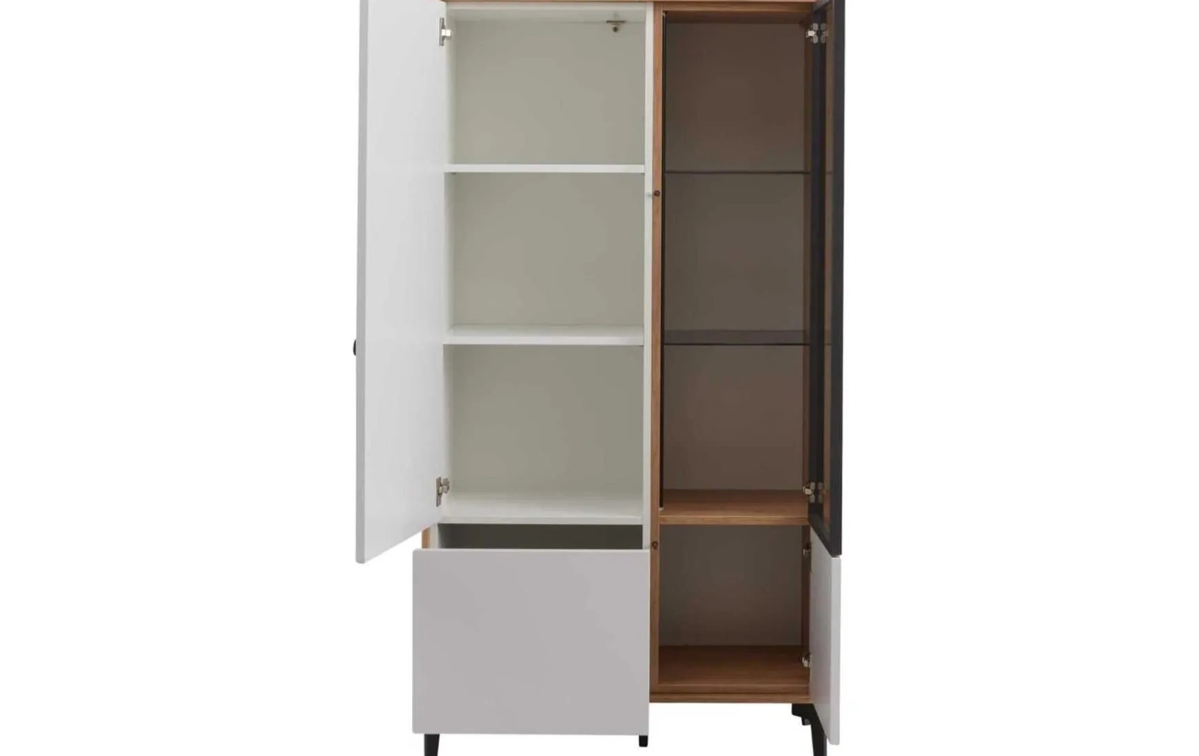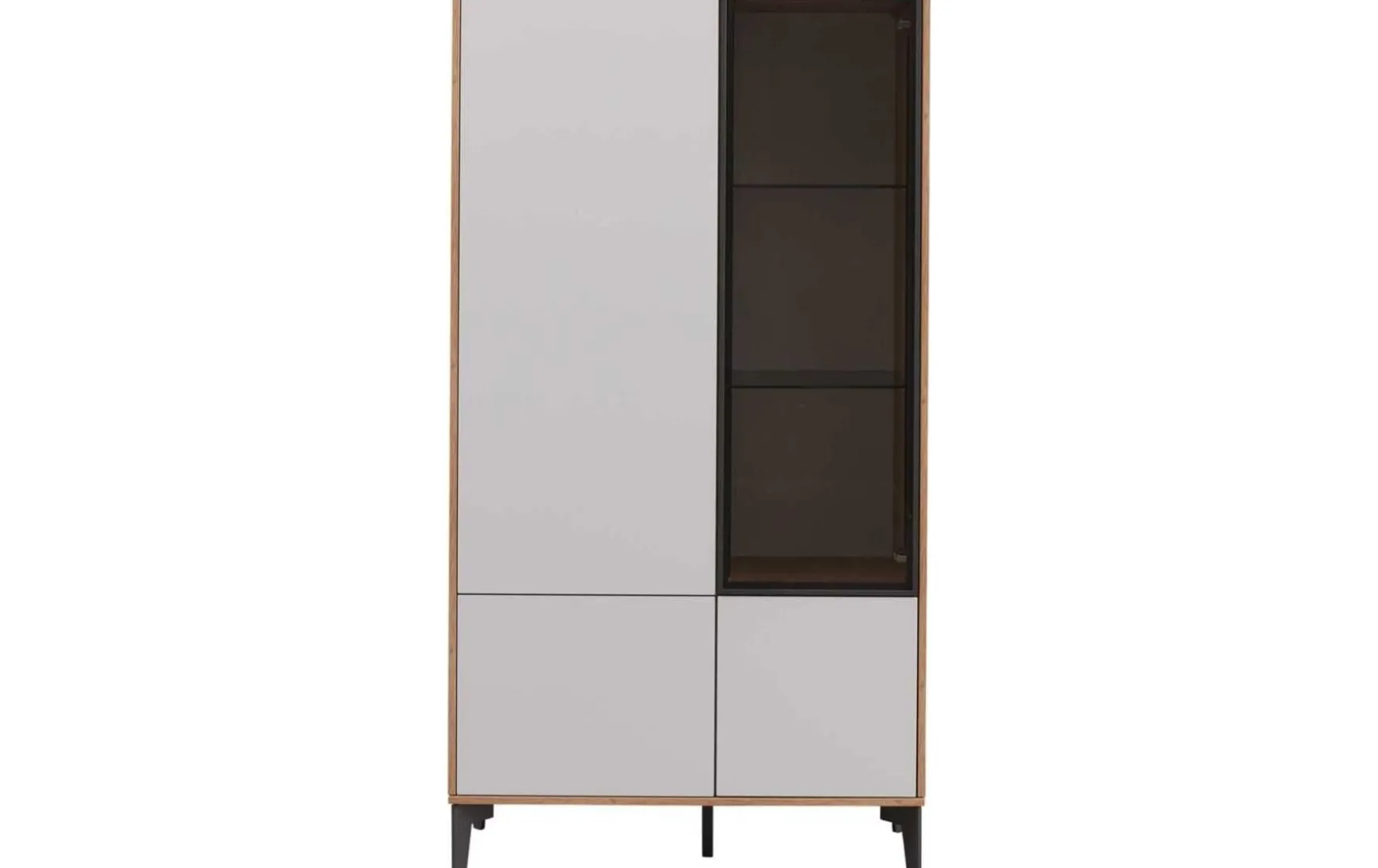 Die hochwertige Vitrine kombiniert quarzgraue Mattlackfronten mit Eiche Artisan-Nachbildung, deren robuste Melaminoberfläche in puncto Kratz- und Stoßfestigkeit überzeugt. Auch der weiße Innenkorpus ist melaminbeschichtet und damit besonders widerstandsfähig und pflegeleicht. Puristisch schieferschwarz pulverbeschichtete Design-Metallfüße runden die moderne Einzelvitrine stilsicher ab. Für das gewisse Etwas sorgt der Parsolglaseinsatz mit schieferschwarzem Aluminiumrahmen.