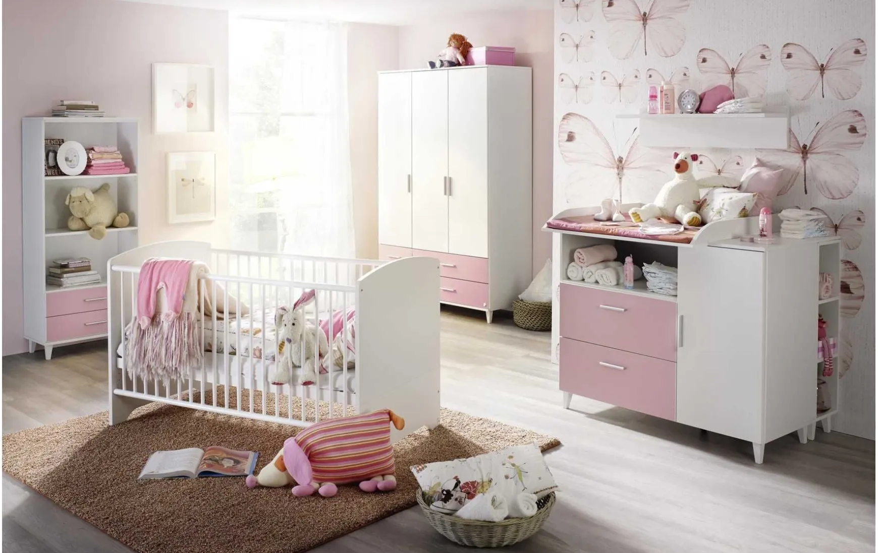 Diese moderne Wickelkommode in zeitlosem Design verbindet Funktionalität mit liebevollen Farbakzenten. Der Korpus in Alpinweiß wird durch dezente Absetzungen in Rosa ergänzt und verleiht dem Babyzimmer eine freundliche, warme Atmosphäre. Mit zwei geräumigen Schubladen, zwei offenen Fächern und einer Tür mit Rechtsanschlag bietet die Wickelkommode vielseitigen Stauraum für Windeln, Kleidung und Pflegeprodukte. Der integrierte Wickelaufsatz sorgt für Komfort im Alltag und kann ideal mit passenden Beimöbeln wie Kinderbett, Schrank oder Regalen kombiniert werden. Pflegeleicht, praktisch und individuell konfigurierbar – perfekt für den täglichen Einsatz.