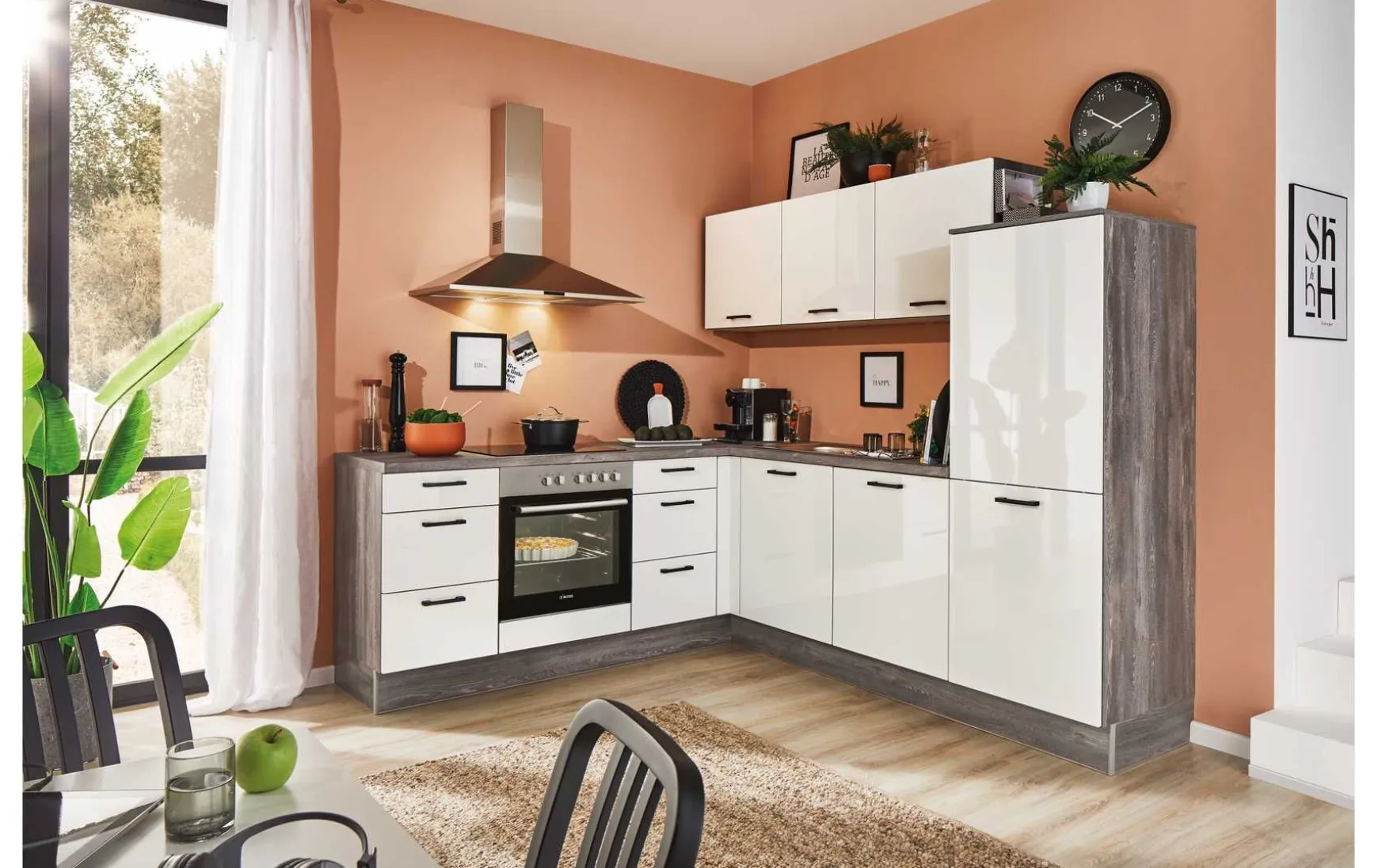 Moderne Winkelküche in Steineiche Nachbildung mit Fronten in weiß Hochglanz ca. 215 x 245 cm inkl. Elektrogeräte-Set und Einbauspüle. Geschirrspüler und Armatur gegen Mehrpreis. Andere Größen, Farben und Zusammenstellungen zum individuellen Preis planbar.