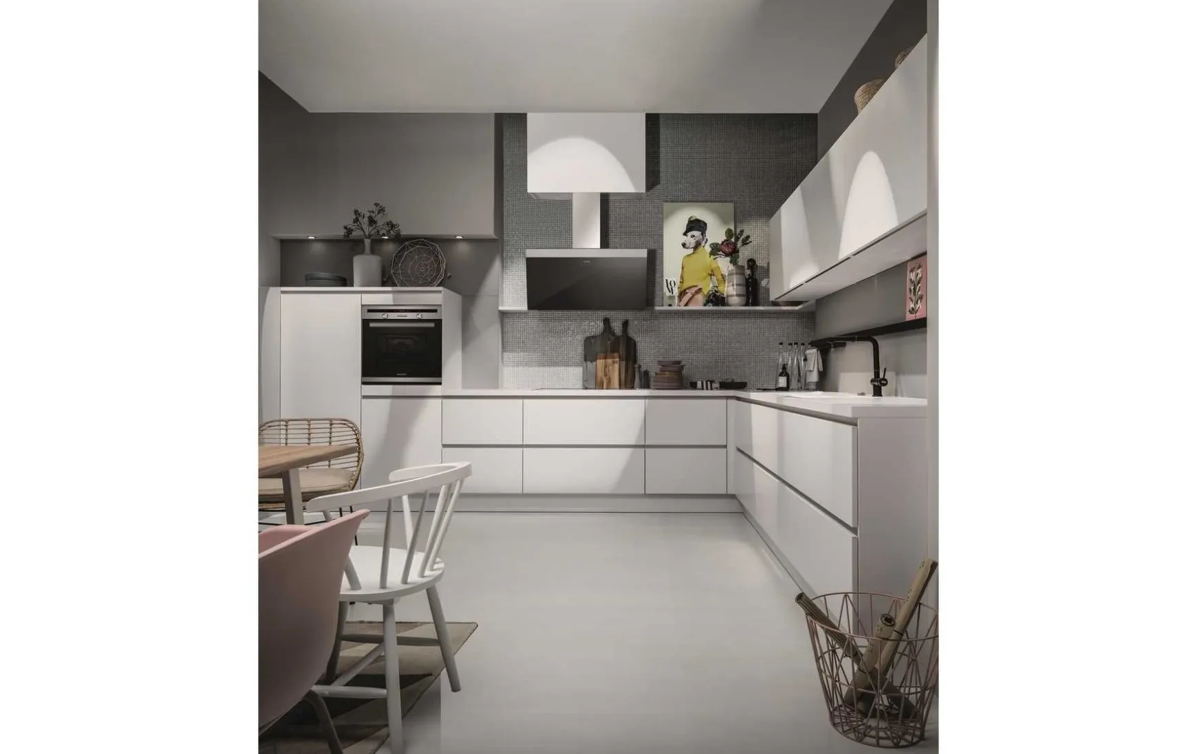 Moderne Grifflose Einbauküche in Lack weiß matt ca. 414×354 cm inkl. Hochwertigem Blaupunkt Elektrogeräte-Set und Einbauspüle. Geschirrspüler, Beleuchtung, Nischenrückwand, Utensilienwandboard und Armatur gegen Mehrpreis. Andere Größen und Zusammenstellungen zun individuellen Preis planar.