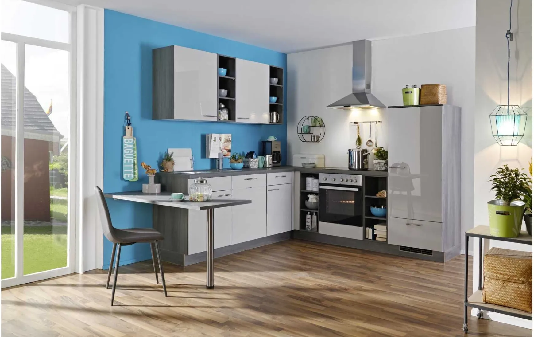 Moderne Winkelküche in hellgrau Hochglanz kombineirt mit Eiche grau Nachbildung, ca. 295x245cm inkl. Elektrogeräte-Set und Einbauspüle. Geschirrspüler, Relingset, Beleuchtung, Stuhl und Armatur gegen Mehrpreis. Andere Größen und Zusammenstellungen zum individuellen Preis.