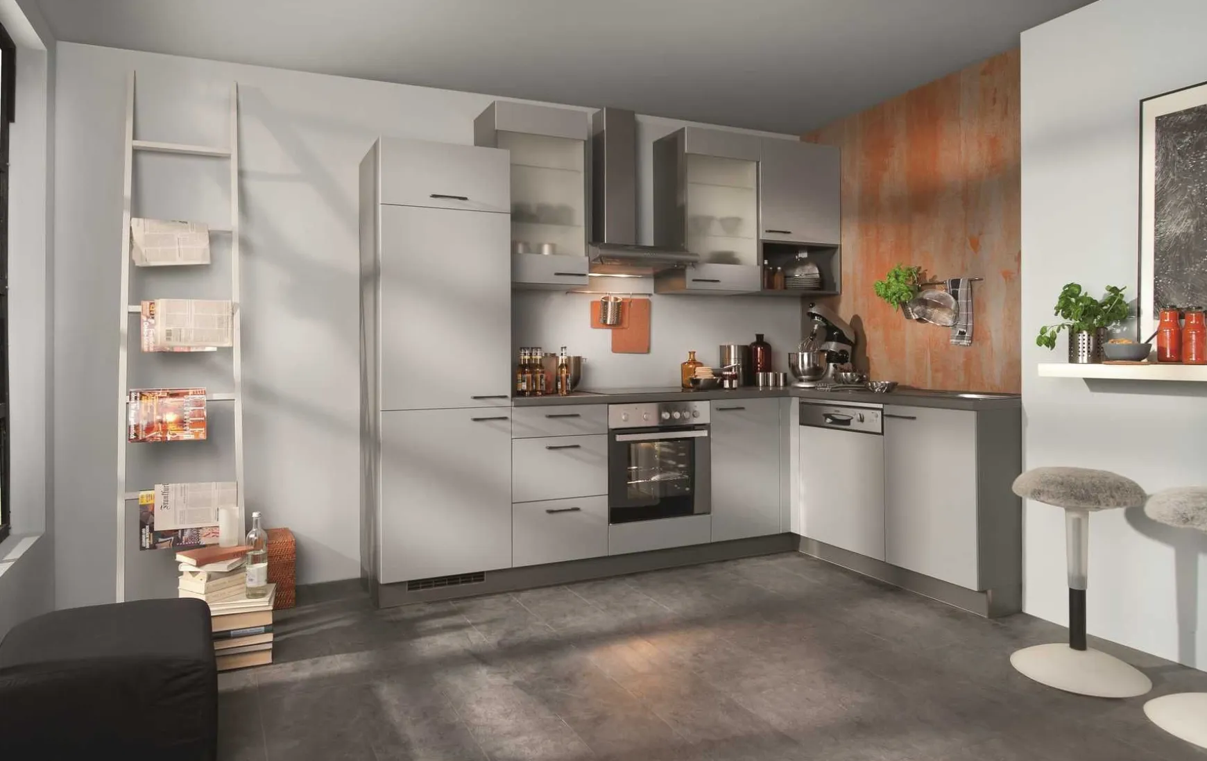 Diese Winkelküche ist ganz in der Trendfarbe der Saison gehalten und gleichzeitig funktional ausgestattet. Die Fronten von Unter- und Oberschränken sind in mattem Betongrau designt und durch die Lichtspiegelungen ein richtiger Blickfang. Korpus, Arbeitsplatte und offene Zwischenbauregale präsentieren sich in Anthrazit. Verarbeitet wurde hochwertiges Lacklaminat mit umlaufender Dickkante. Metallgriffe in Edelstahloptik vervollständigen das Design. Zudem ist ein Ansatztisch integriert, an dem Sie mit zwei Personen zusammensitzen können. Neben einer kompletten E-Geräte-Ausstattung begeistert die Winkelküche mit einem geräumigen Stauraumraumangebot.