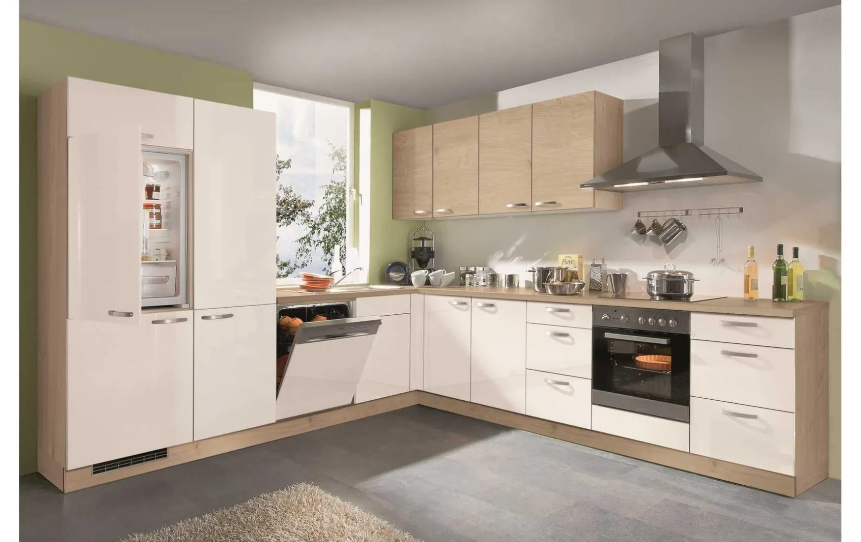 Kompromisslos glücklich werden Sie mit dieser Winkelküche, welche Funktionalität und Design verbindet. Die zarte Magnolia Front wird durch die Farbe Bergeiche, welche in der Arbeitsplatte und in den Hängeschränken vorhanden ist, hervorragend in Szene gesetzt. Ein Geschirrschrank, etliche Laden und Auszüge runden das mehr als reichliche Angebot an Stauraum ab. Die Melaminharz beschichteten Oberflächen sorgen für einen sorgenfreien Umgang bei der Pflege Ihrer Küche.