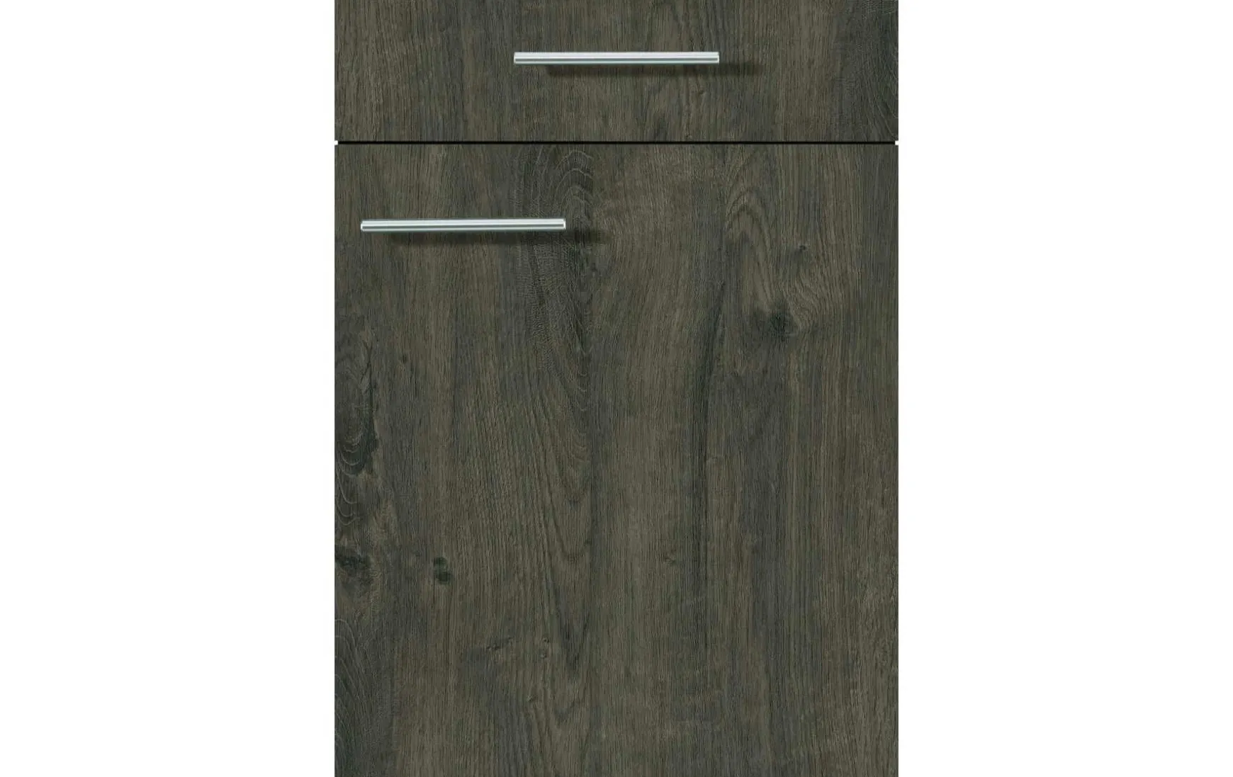 Diese L-Küche beweist, wie zeitgemäß Holzoptik in der Küche wirken kann. Ein geradliniges Design mit vielen modernen Details trifft auf eine natürlich gemaserte Holzoptik, kein Wunder dass Ihre neue Küche die Blicke auf sich ziehen wird. Konzipiert ist die Trendküche mit einem geräumigen und funktional ausgestattetem Seitenschrank und ansprechend gestalteten Hängeschränken. Die Unterschränke sind komplett in Seeahorn Nachbildung gehalten. Authentische Farbunterschiede sowie eine lebendige Maserung prägen ein facettenreiches Bild. Für einen tollen Kontrast sorgen die Fronten der Oberschränke, die sich in mattem Graphit deutlich abheben. Zwischenbauregale in Holzoptik lockern den Look der oberen Küchenelemente gekonnt auf. Ihre neue Küche punktet nicht nur optisch, sondern auch funktional. Eine umfassende Ausstattung mit Elektrogeräten ist selbstverständlich. Besonderen Komfort im Alltag versprechen vor allem Backofen und Kühlschrank in ergonomischer Höhe. Stauraum steht Ihnen in den geräumigen Auszügen und Schränken ausreichend zur Verfügung. Kurzum, die Küche bereitet Ihnen genussvolle Momente, vom Kochen bis zum gemeinsamen Speisen.