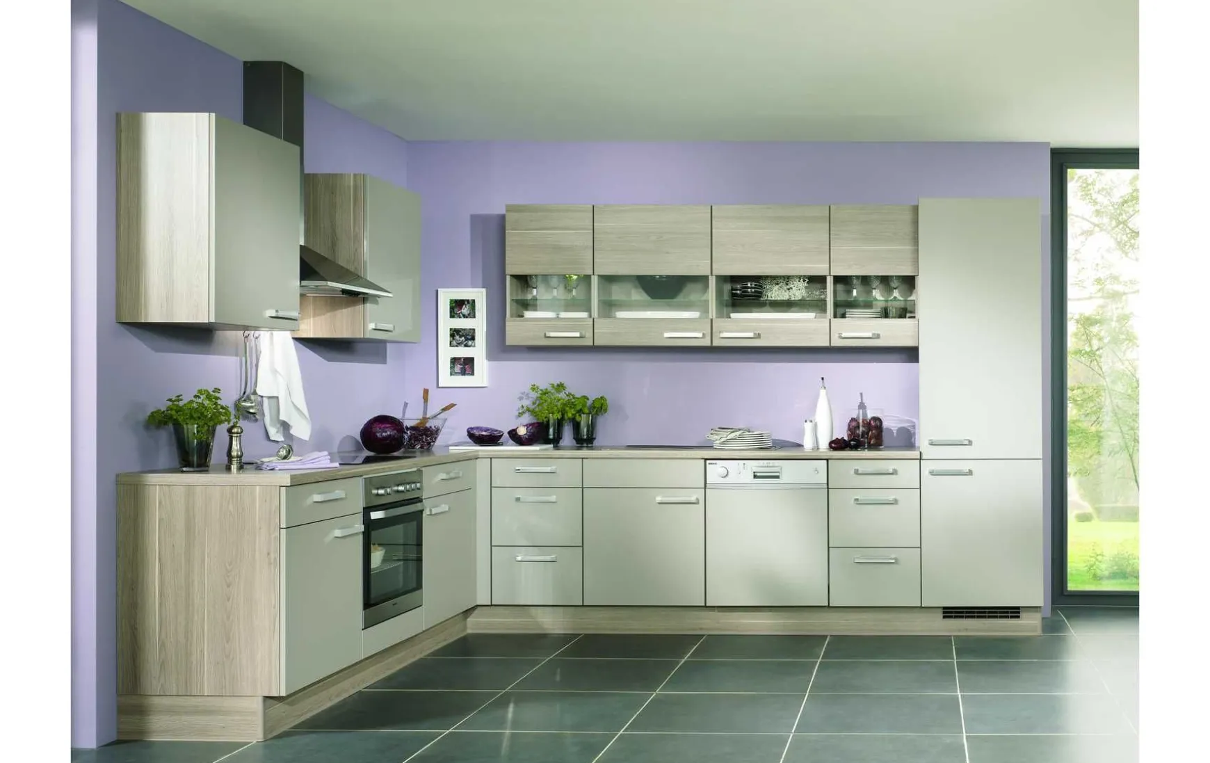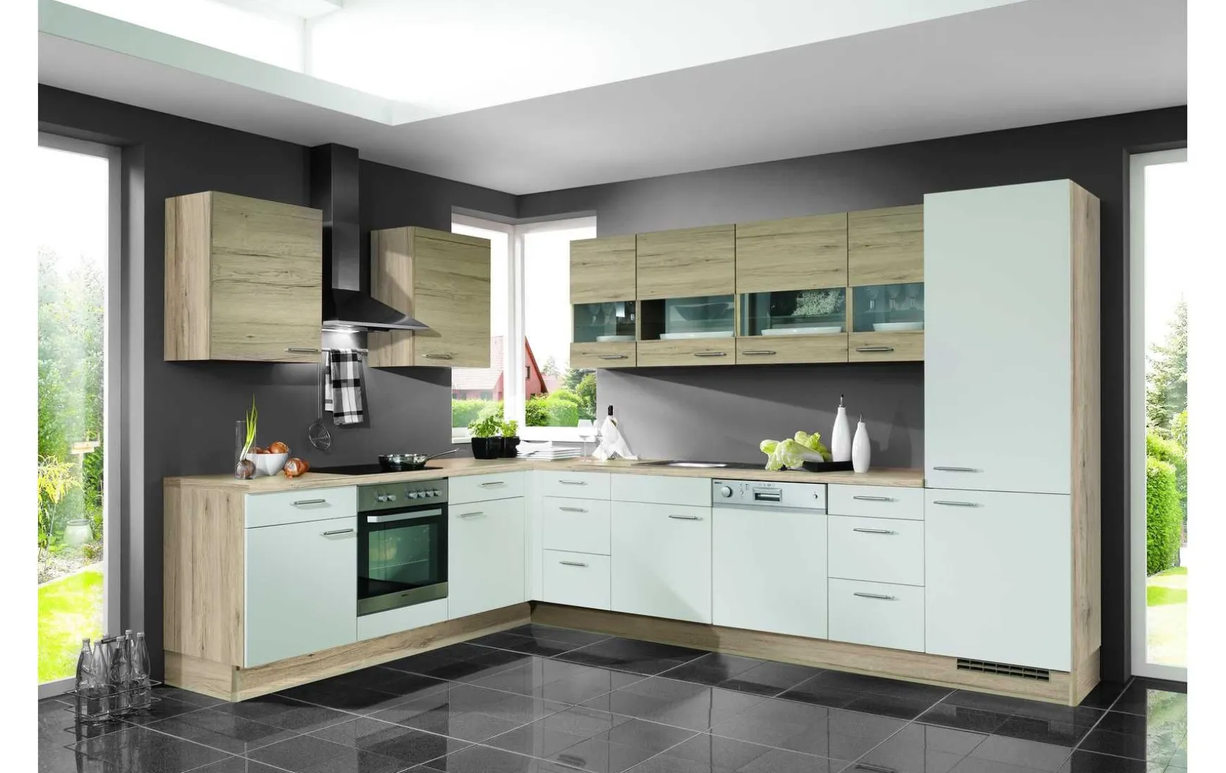 Diese zeitlos moderne Küche ist besonders freundlich und funktional gestaltet. Die in L-Form konzipierte Küche ist ein reines Stauraumwunder, denn in besonders vielen Auszügen, Ober- und Unterschränken finden all Ihre Küchenuntensilien Platz. Vier Hängeschränke lockern das Erscheinungsbild mit einer eleganten Segmentglasfront auf und gewähren einen schönen Einblick.