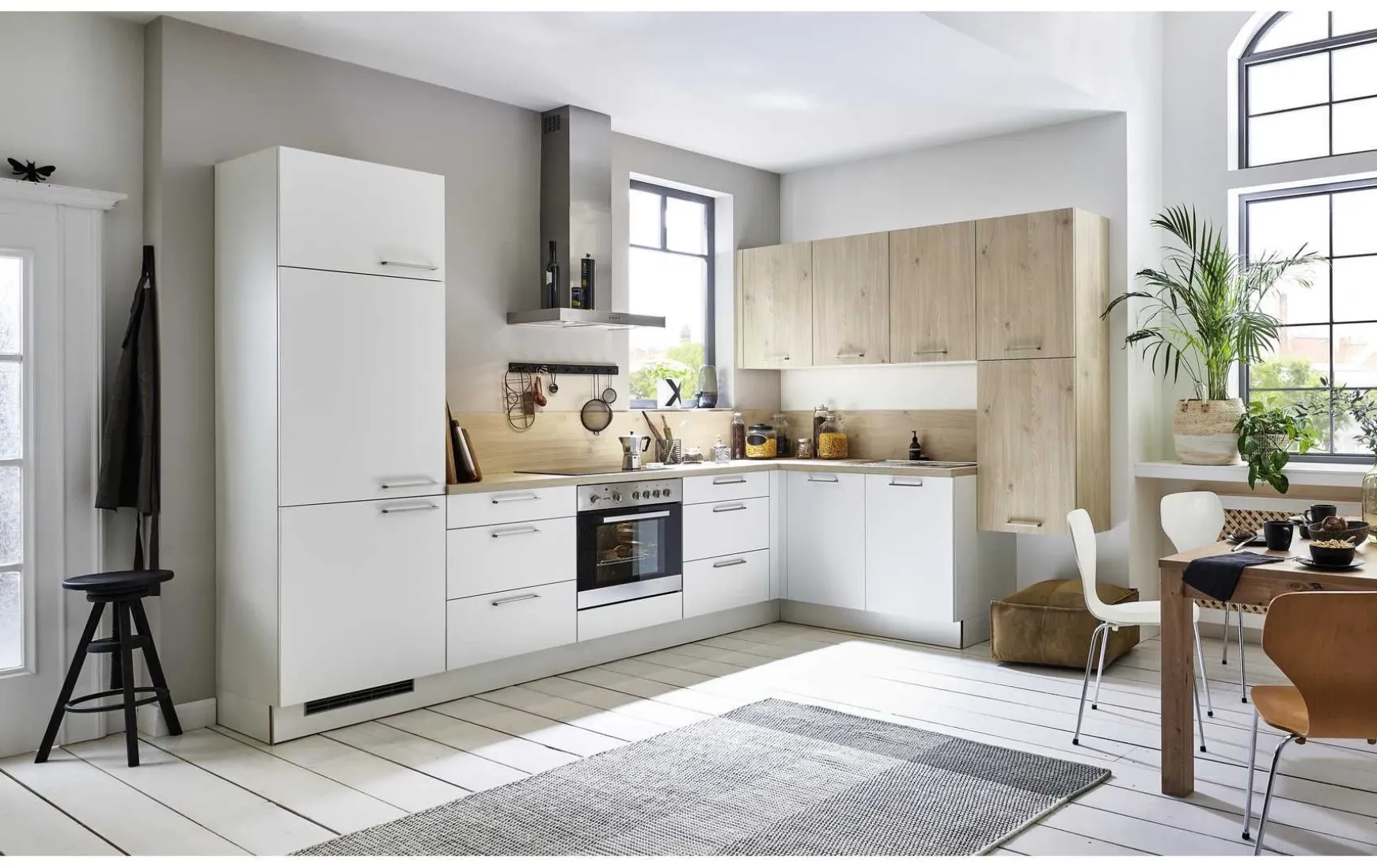 Zeitloses Weiß und wohltuende Eiche bilden eine besonders harmonische Kombination in dieser eleganten Küche. Ein matter Weißer Farbton umhüllt sämtliche Unterschränke und Geräteschränke. Für den wohnlichen Charakter sorgen warme Eichentöne der Oberschränke, Arbeitsplatte und Nischenrückwand. Der Metallgriff in Edelstahloptik ergänzt nicht nur das Design, sondern sorgt auch für eine komfortable Verwendung aller beweglichen Elemente. In den Oberschränken, Schubläden und Auszügen ist ausreichend praktischer Stauraum vorhanden. Die wunderschöne Winkel-Küche ist komplett ausgestattet mit funktionellen Geräten und einer funktionellen Dunstabzugshaube aus Edelstahl. Die kühle Edelstahloptik setzt ein zusätzliches Highlight und unterstreicht das hochwertige Design dieser Küche.