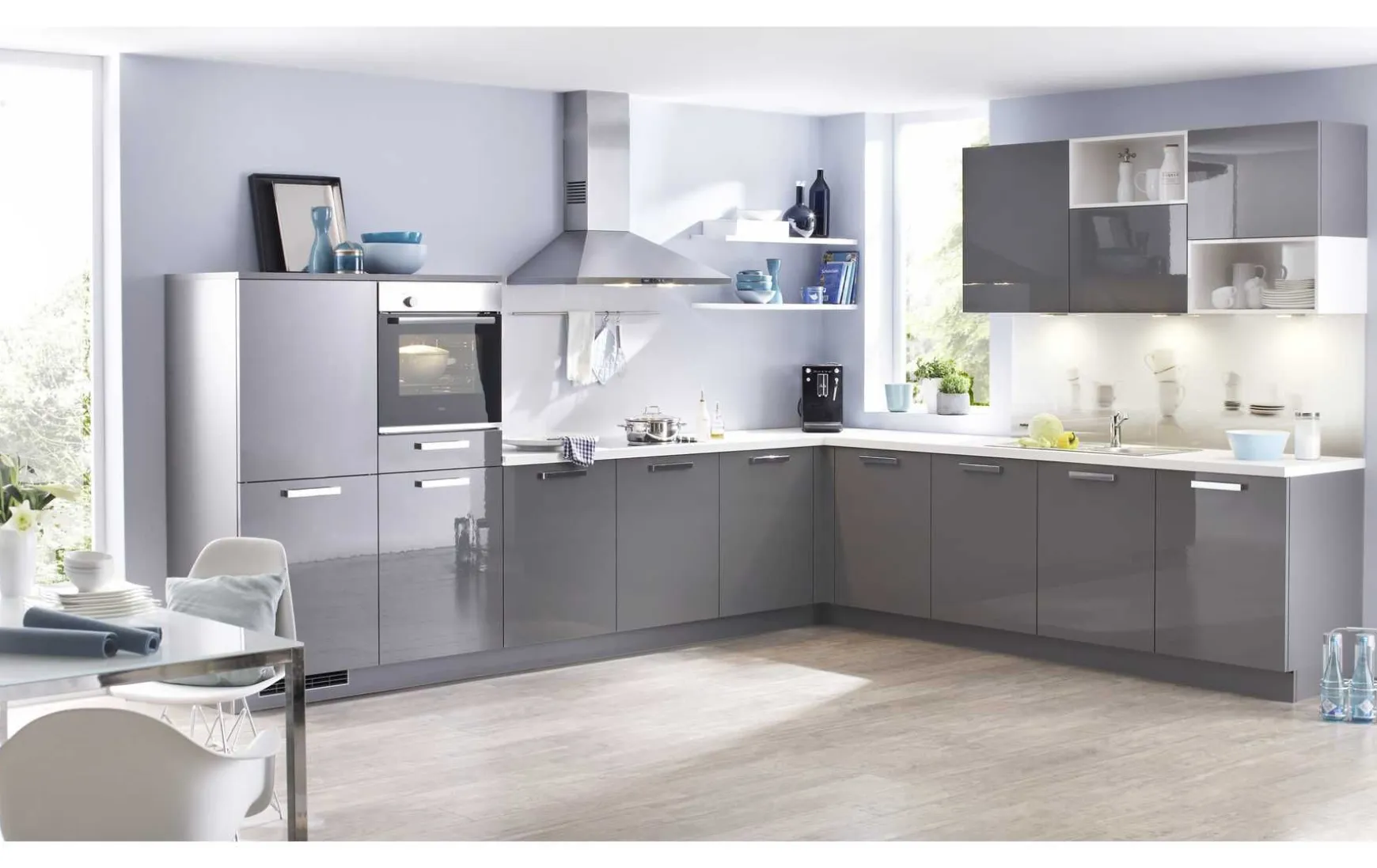 Die Front dieser L-förmigen wunderschönen Küche ist in Quarzgrau glänzend gehalten. Der Edelstahlgriff rundet das schöne Erscheinungsbild ab. Dank der vielen Stauräume für die Aufbewahrung von Küchenutensilien sieht die Küche immer ordentlich und komfortabel aus. Mit dem Backofen auf Komfort-Höhe können Sie den Ofen problemlos Rücken schonend bedienen. Die eingebauten Regale lassen viel Spielraum um eine persönliche Note in Ihre Küche zu bringen.