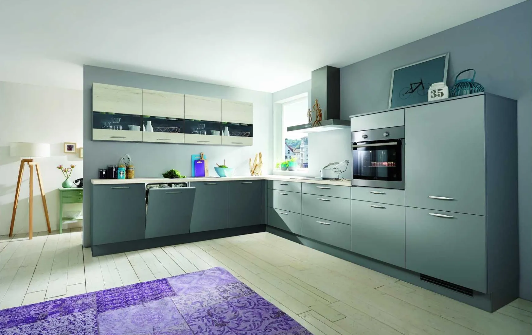 Bei dieser Küche gehen zwei verschiedene Fronten eine gelungene Kombination ein. Das matte Grau wird durch die Hängeschränke in San Remo Eiche unterstützt. Zusätzlich setzen die Glaseinsätze einen Kontrastpunkt zu der glatten Oberfläche. Die Funktionalität wird dadurch keineswegs eingeschränkt, wie der hochgesetzte Backofen oder auch die breiten Laden unter dem Kochfeld beweisen. Die Highboardlösung lässt außerdem Spielraum, um mit Dekoelementen seinen persönlichen Touch in der Küche zu zeigen.