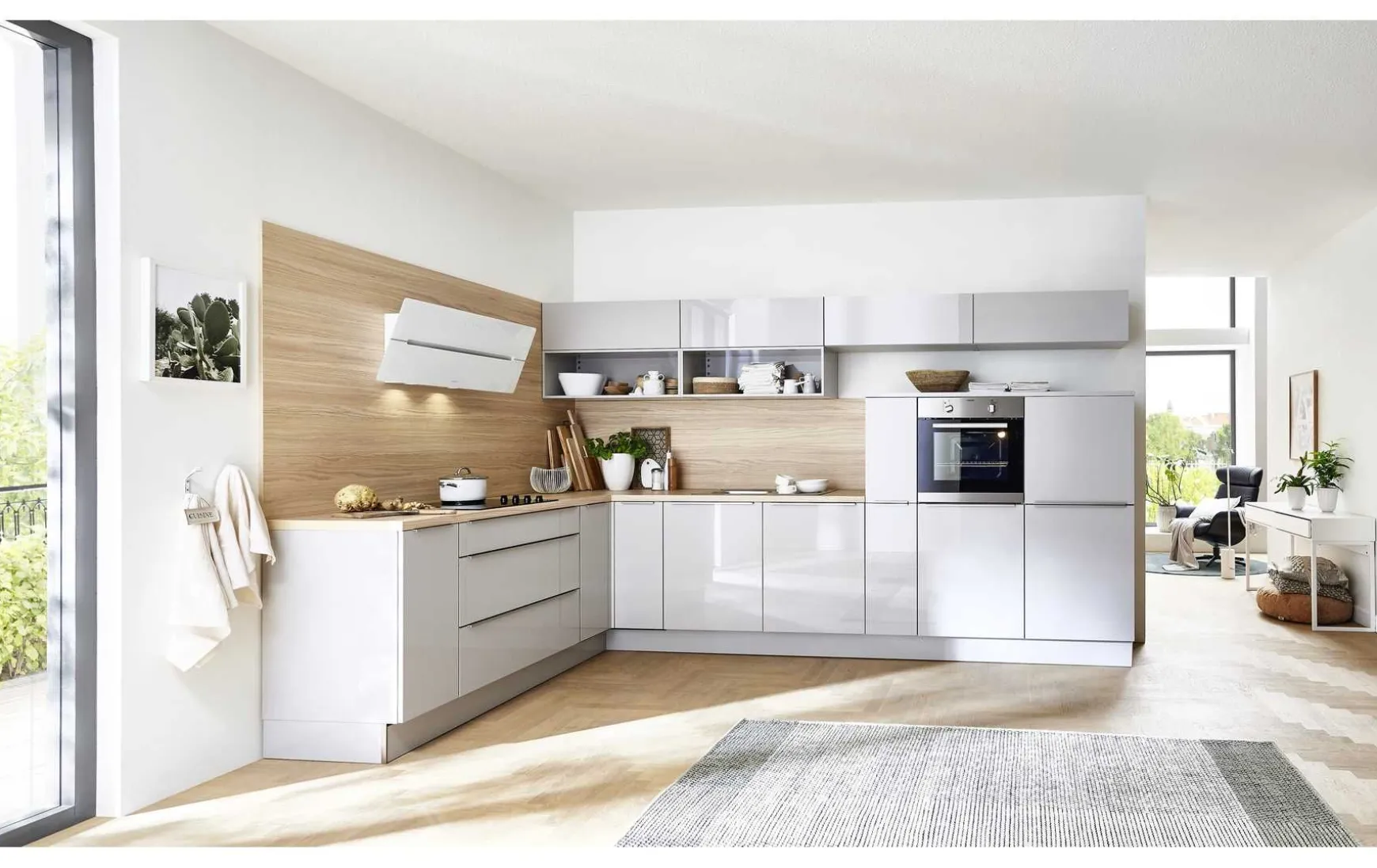 Eine sehr stylische und moderne Variante bietet Ihnen diese Winkelküche. Offene Regale und schlanke Klappen- Hängeschränke unterstreichen diesen Eindruck. Die Praktikabilität bleibt trotzdem nicht auf der Strecke. Sie dürfen sich über einen Drehkarusselschrank neben dem Kochfeld, und einen Highboard- Vorratsschrank freuen. Die aufgesetzten Metallgriffe runden die gesamte Optik ab.