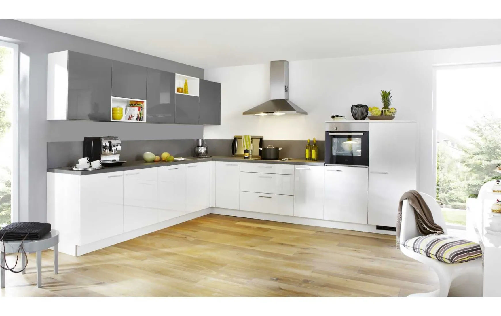 Die Front dieser L- Küche besteht aus Weiß Lack glänzend und Quarzgrau Lack glänzend. Für einen modernen Look sorgen die beiden Zwischenbauregale in Weiß Glanz. Für ein leichteres Arbeiten sorgen der hochgestellte Backofen und die gedämften Türen und Laden.