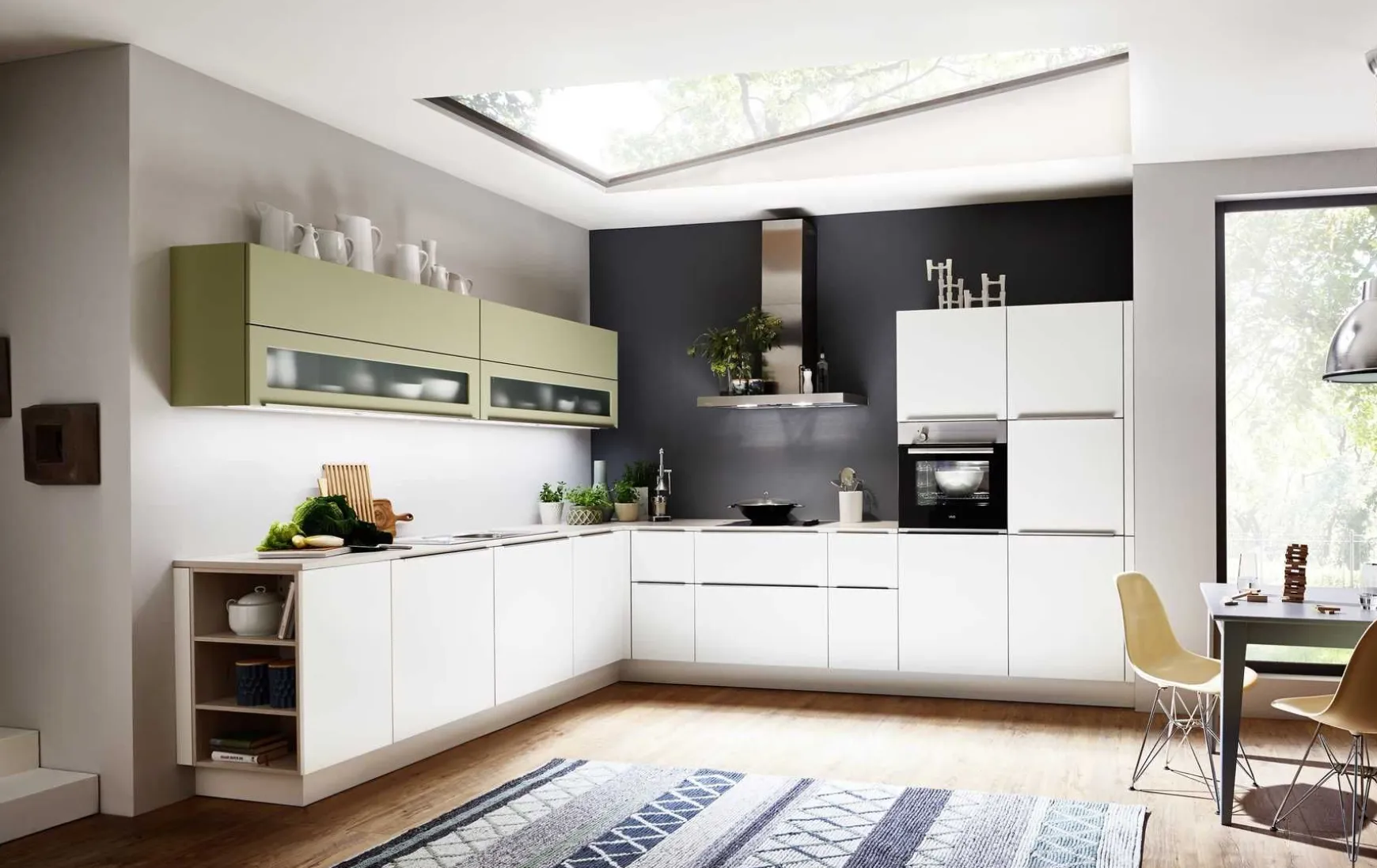 Die L-förmige Küche besteht aus mattem Weiß und Avocado. Abgerundet wird das Erscheinungsbild durch einen Metallgriff. Die Grundausstattung mit ausziehbaren und gedämpften Schubladen, sowie die Oberschränke mit Klapptüren bieten ausreichend Platz für Ihre Küchengeräte und sorgen dafür, dass Ihre neue Küche immer ordentlich und aufgeräumt ist. Darüber hinaus sind die Oberschränke mit Glasöffnungen ausgestattet, um einen besseren Überblick zu bieten. Das Bücherregal am Ende bietet Platz für Ihre Kochrezepte oder Dekoelemente. Der Backofen wurde rückenschonend in ein Highboard integriert, um Ihnen die Arbeit so weit wie möglich zu erleichtern.