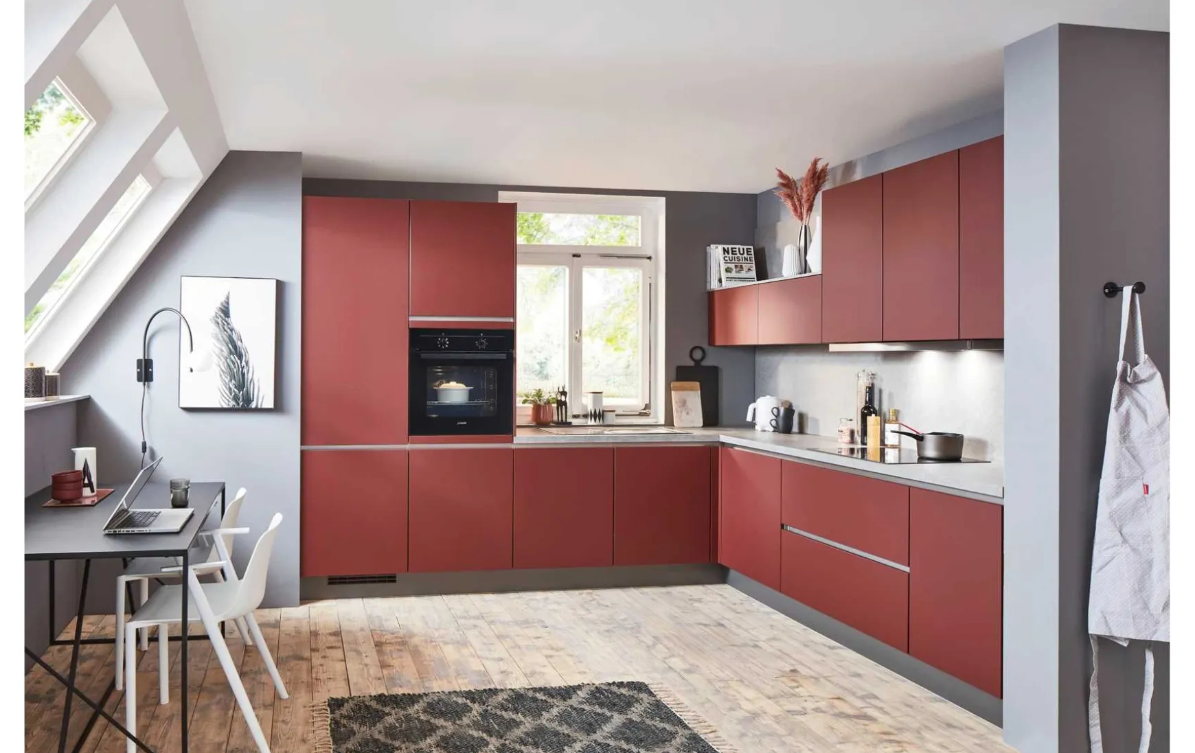 Topmoderne Winkelküche in rostrot ultramatt kombiniert mit schiefergrau und Basalt taupegrau Nachbildung, ca.300x257cm, inkl. Elektrogeräte-Set und Einbauspüle. Geschirrspüler, Beleuchtung, Bürotisch, Stühle und Armatur gegen Mehpreis erhältlich. Andere Größen und Zusammenstellungen zum individuellen Preis planbar.