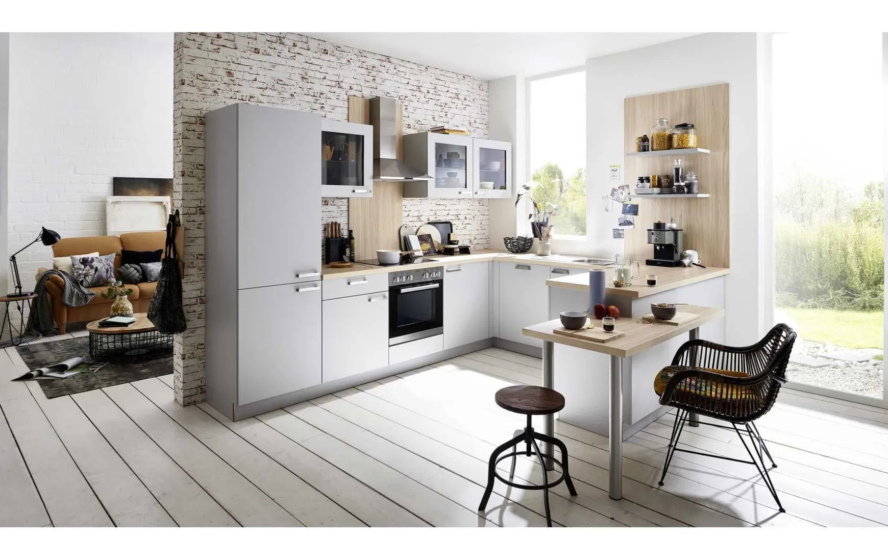 Eine kompakte, praktische Lösung bietet diese Küche. Die Farbe Platingrau wurde hier mit der Arbeitsplatte Silberesche Nachbildung kombiniert. Als Hingucker erweisen sich die Metallgriffe in Edelstahloptik und der kleine Ansatztisch. Der Essplatz lädt zum verweilen und zum Tratschen ein.