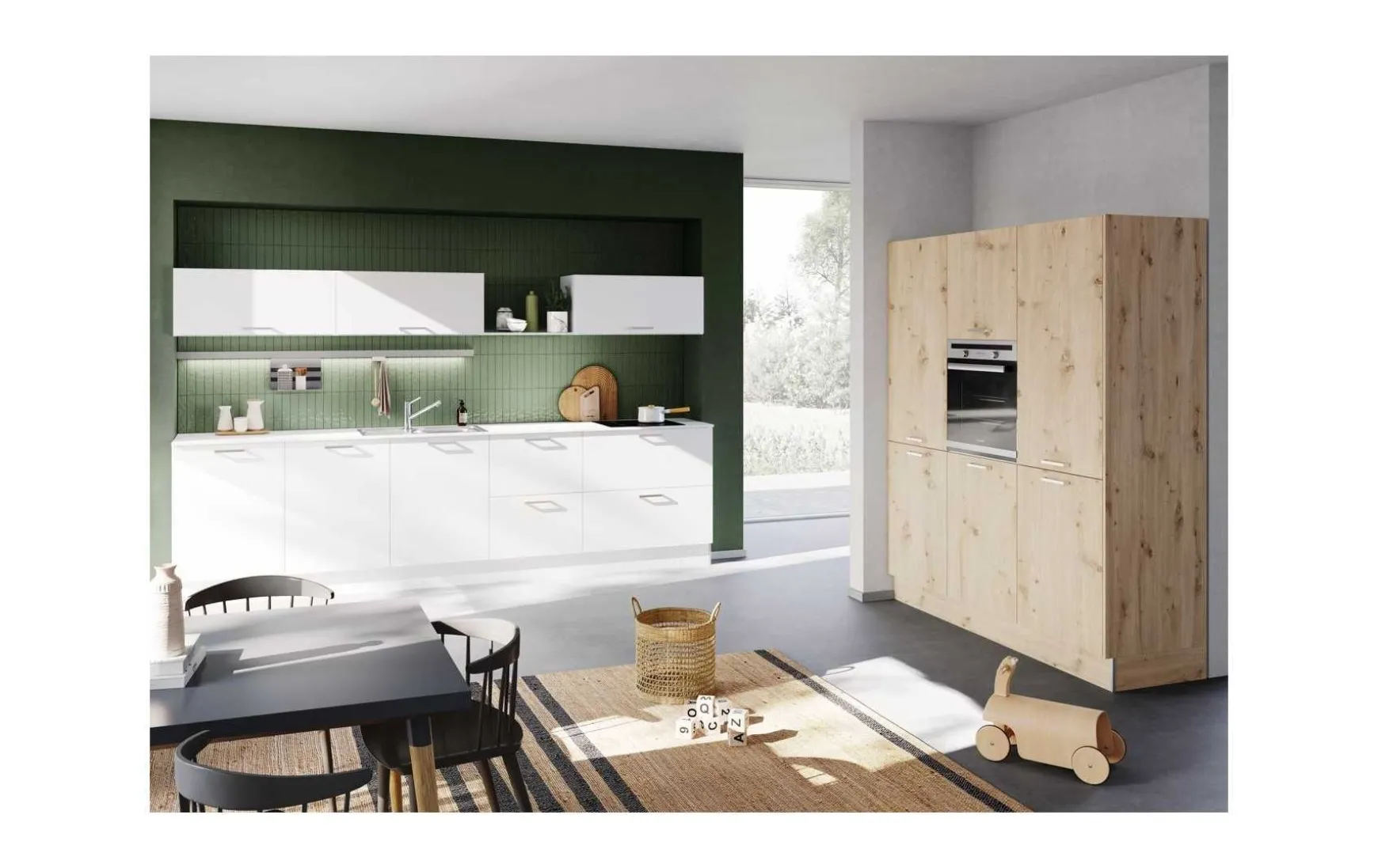 Moderne Einbauküche in Kristallweiß und Sommereiche hell, inkl. Elektrogeräte-Set. Geschirrspüler gegen Mehrpreis. Andere Größen und Zusammenstellungen zum individuellen Preis planbar.