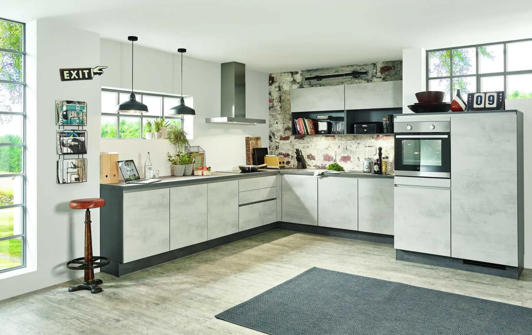 Mit der Inselküche können echte Juwelen in Ihr Zuhause gelangen. Moderne Farben und trendorientierte Formate sind ebenso selbstverständlich wie alltägliche Merkmale. Die Fronten in authentisch anmutender Betonoptik sind eine interessante und pflegeleichte Material-alternative für den Küchen- und Wohnbereich und vermitteln einen modernen urbanen Look. Der modernen Küche darf es an Funktinalität nicht fehlen, deswegen befindet sich der Backofen in ergonomischer Höhe. Die offenen Regale bieten Ihnen viel Platz für Kochbücher oder Dinge die Sie gleich griffbereit in der Küche verstauen möchten. Die Unterkästen der zeitlosen Winkelküche bieten zusätzlich viel Stauraum.