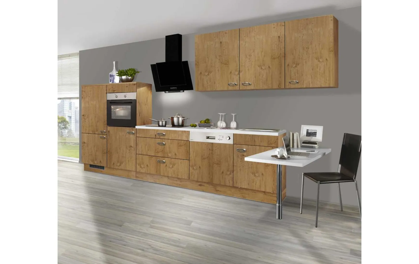 Ein modernes, aber ganz natürliches Design zeichnet die einzelnen Elemente der Küche aus. Die Fronten sowie der Korpus sind in authentischer Vintage Eiche Nachbildung gehalten. Der helle Braunton mit der harmonischen Maserung strahlt natürliche Wärme aus und dekoriert somit die Fronten der Hängeschränke. Die Arbeitsplatte hebt sich in der hellen Farbvariante Weiß gelungen ab. Glanzvolle Akzente setzen die Griffe in Edelstahl-Optik, die vor den matten Oberflächen besonders schön hervortreten. Stauraum für Ihr Zubehör oder Ihre Vorräte steht Ihnen ausreichend in den Hängeschränken sowie den geräumigen Unterschränken zur Verfügung. Diese sind mit jeweils einer Schublade und zwei Auszügen ausgestattet und bieten viel Platz. Mit einer umfassenden Elektrogeräte-Ausstattung wie einem Backofen in ergonomischer Höhe, wird die Küche zum funktionalen Zentrum in Ihrem Zuhause.
