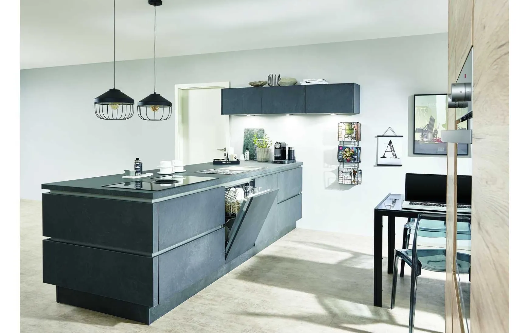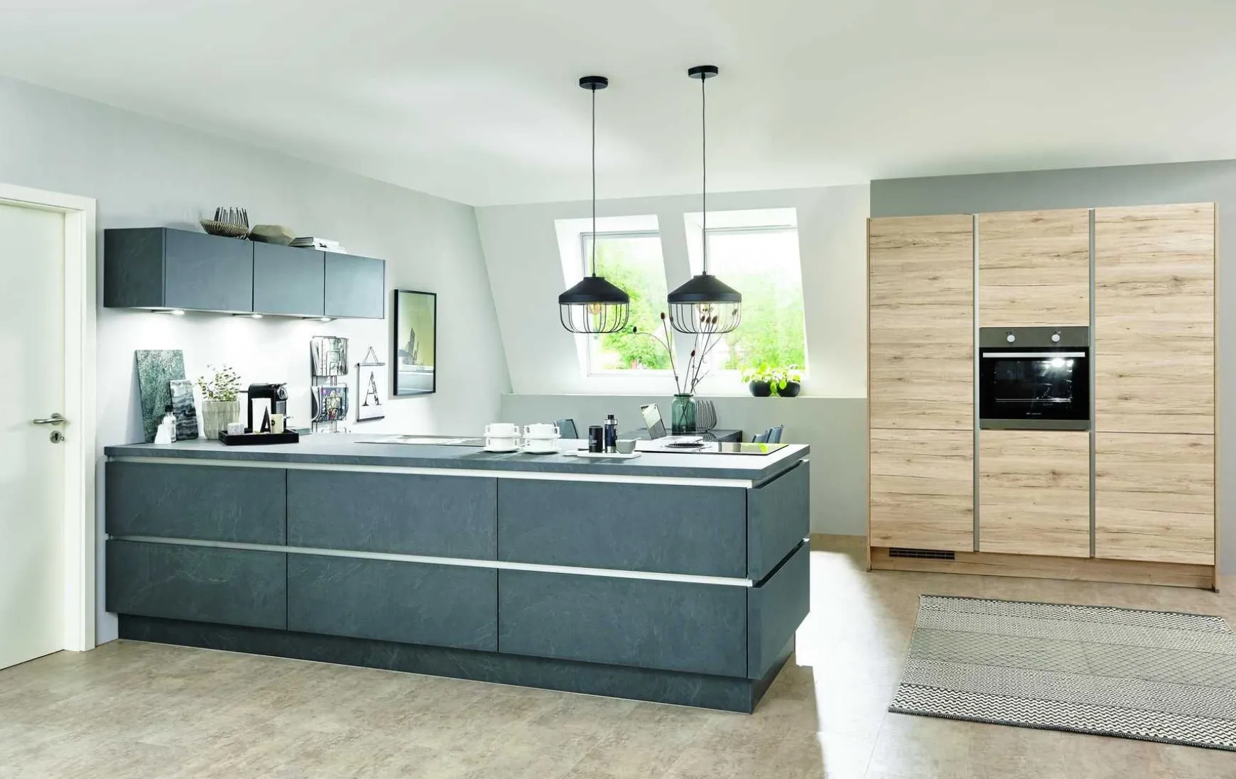 Die moderne Wohnküche setzt mit Ihrer umlaufenden Griffmulde auf modernen Komfort. Durch die Kombination Schiefergrau mit Eiche Sanremo wird ein stimmiges Gesamtbild geschaffen. Ergänzt wird dieses Zusammenspiel noch durch die praktischen Auszüge und den geräumigen Vorratsschrank. Ein weiteres Highlight ist die Kochplatte mit integriertem Muldenlüfter, dies lässt die Küche größer und offener wirken.