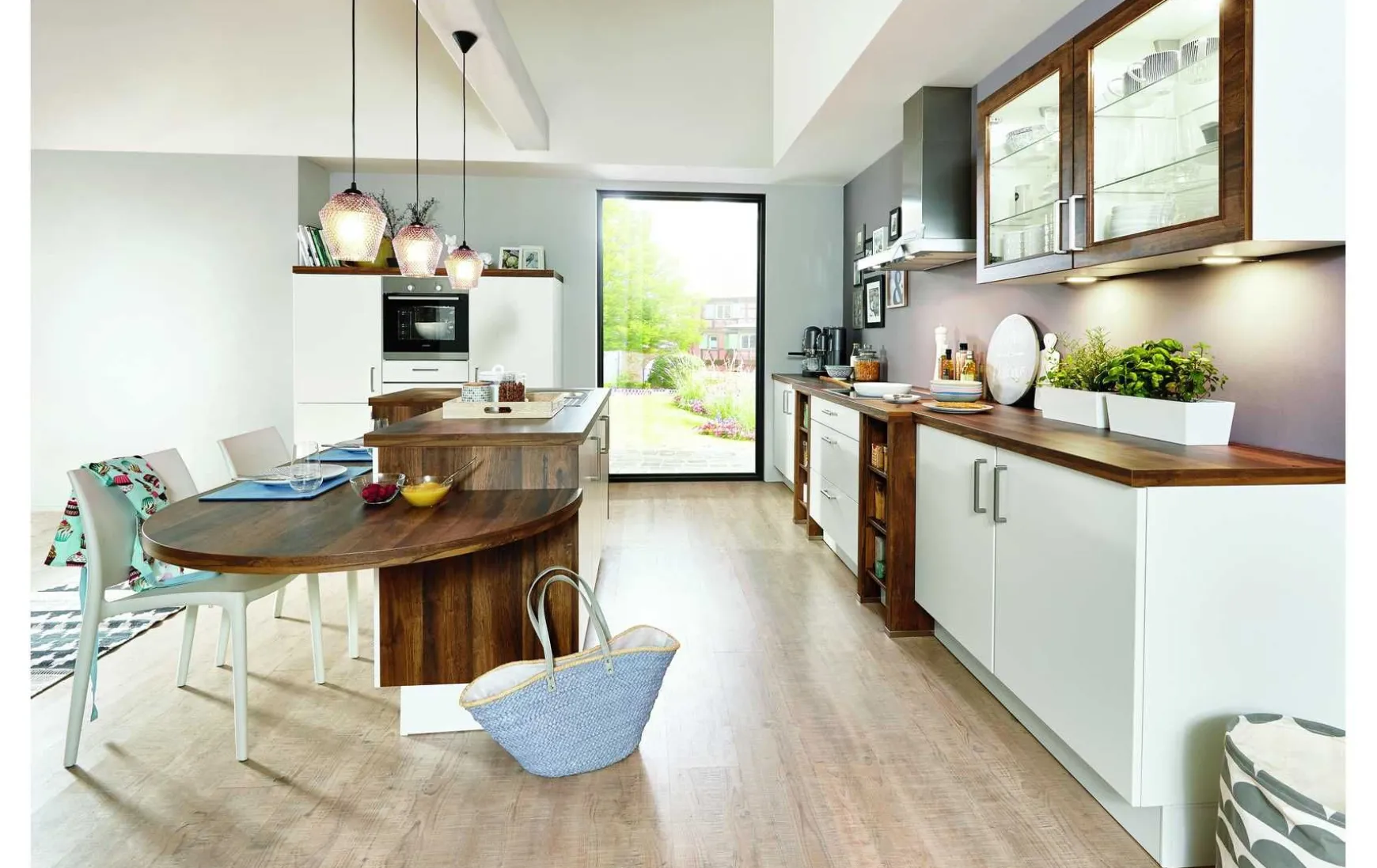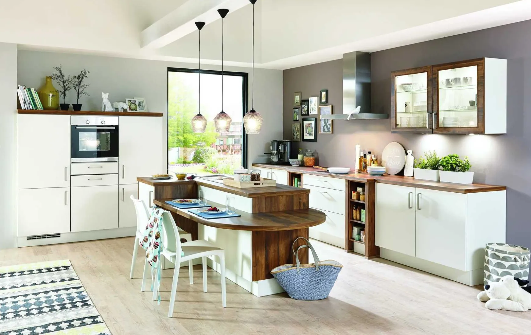 Die moderne Inselküche besticht mit einer integrierten praktischen Essplatzlösung. Das zeitlose Farbkonzept dieser Küche, kombiniert aus reinem und hochwertigem Weiß Lack und einem pflegeleichtem Balkeneichen Imitat, schafft diese Kombination eine sehr wohnliche Atmosphäre in Ihrem Zuhause. Diesen angenehmen und eleganten Gesamteindruck unterstreichen die Hängeschränke mit Glasrahmentüren. Funktionalität wird in dieser Küche großgeschrieben. Der Backofen in ergonomischer Rückenhöhe, offene Regalelemente für Ihre ganz persönliche Dekorationsnote und ein integrierter Essbereich in der Kücheninsel. Die abgerundete Tischplatte kann problemlos mit einigen Stühlen bestückt werden und bietet somit Platz für mehrere Personen. Eine umfassende Ausstattung mit Elektrogeräten rundet das Gesamtpaket ab und erleichtert Ihnen die täglichen Arbeiten in Ihrer neuen Küche.
