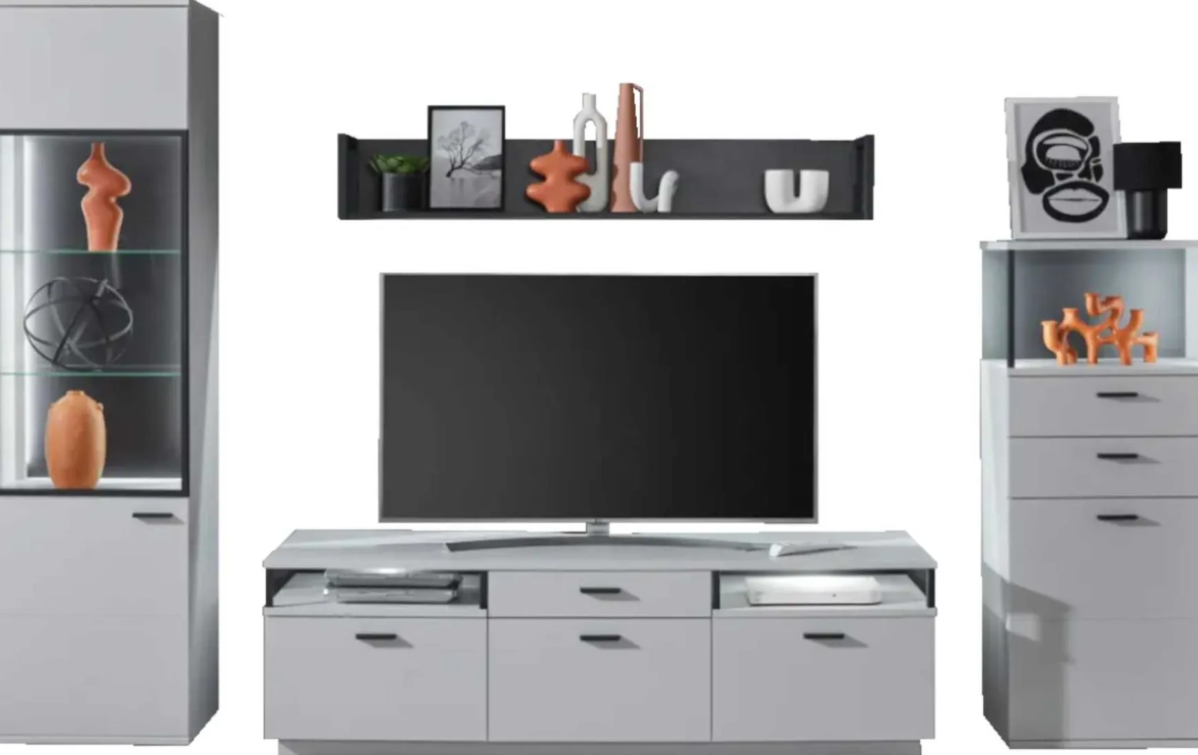 Modern und funktional zugleich? Das ist für die Wohnwand kein Problem! Ihr zeitloses Design in weiß wird durch die modernen, schwarzen Metallakzente ergänzt. Das moderne, 4-teilige Modell von Ideal besteht aus zwei Vitrinen sowie einem Lowboard mit Stauraum und wird durch das Wandboard mit Metallakzenten komplettiert.