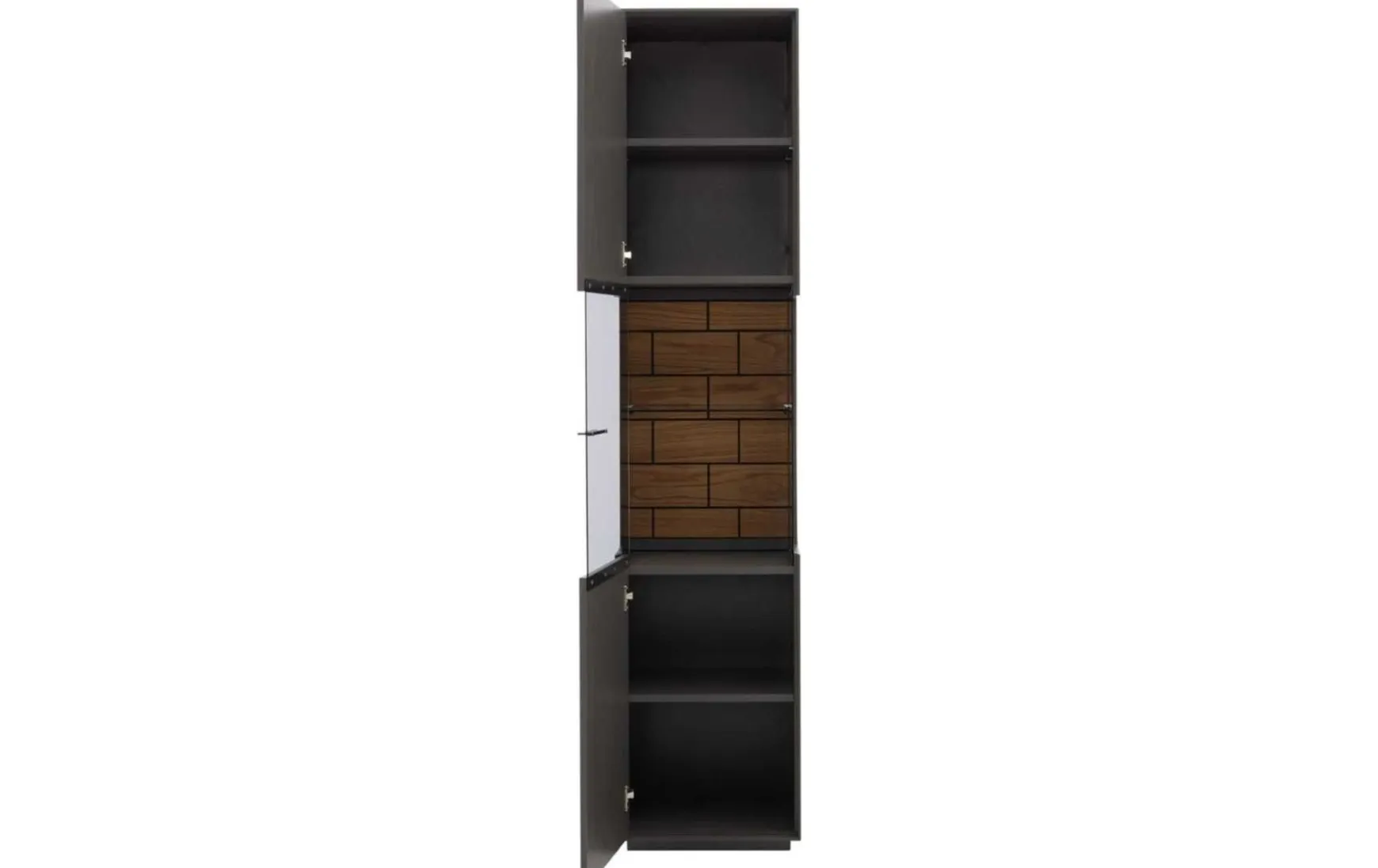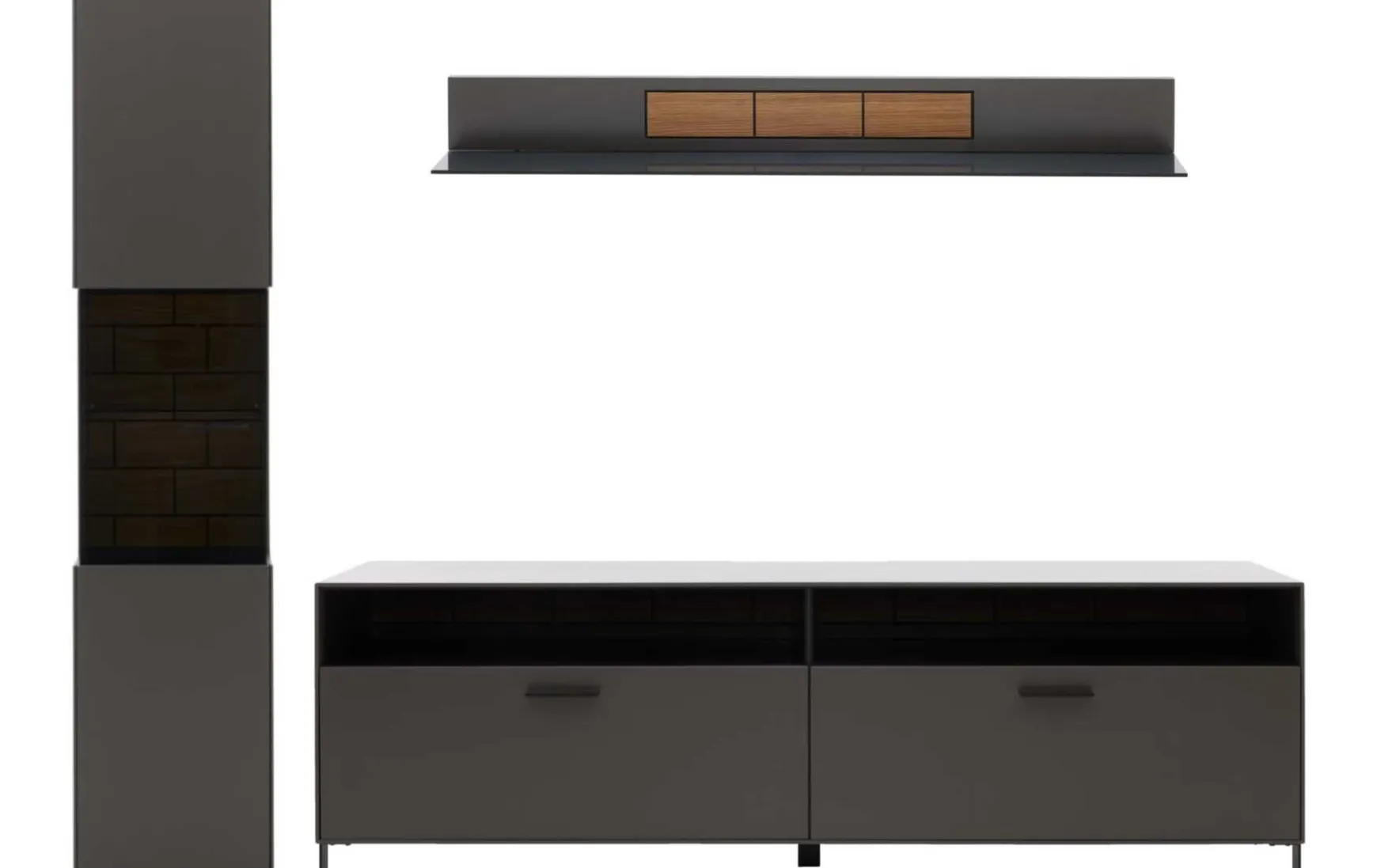 Die Wohnwand überzeugt mit ihrem stilvollen Design und der hohen Qualität. Ihre wolframgrauen Lackoberflächen strahlen moderne Eleganz aus. Für das gewisse Etwas sorgen die Einsätze aus grauem Parsolglas, die sichtbaren Rückwände mit Spaltholz auf schwarzer MDF und die Details aus schwarz lackiertem Metall mit Feinstruktur.