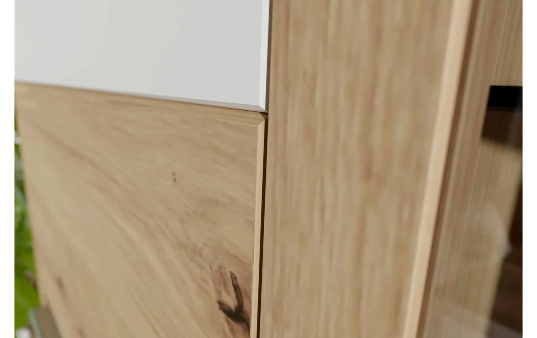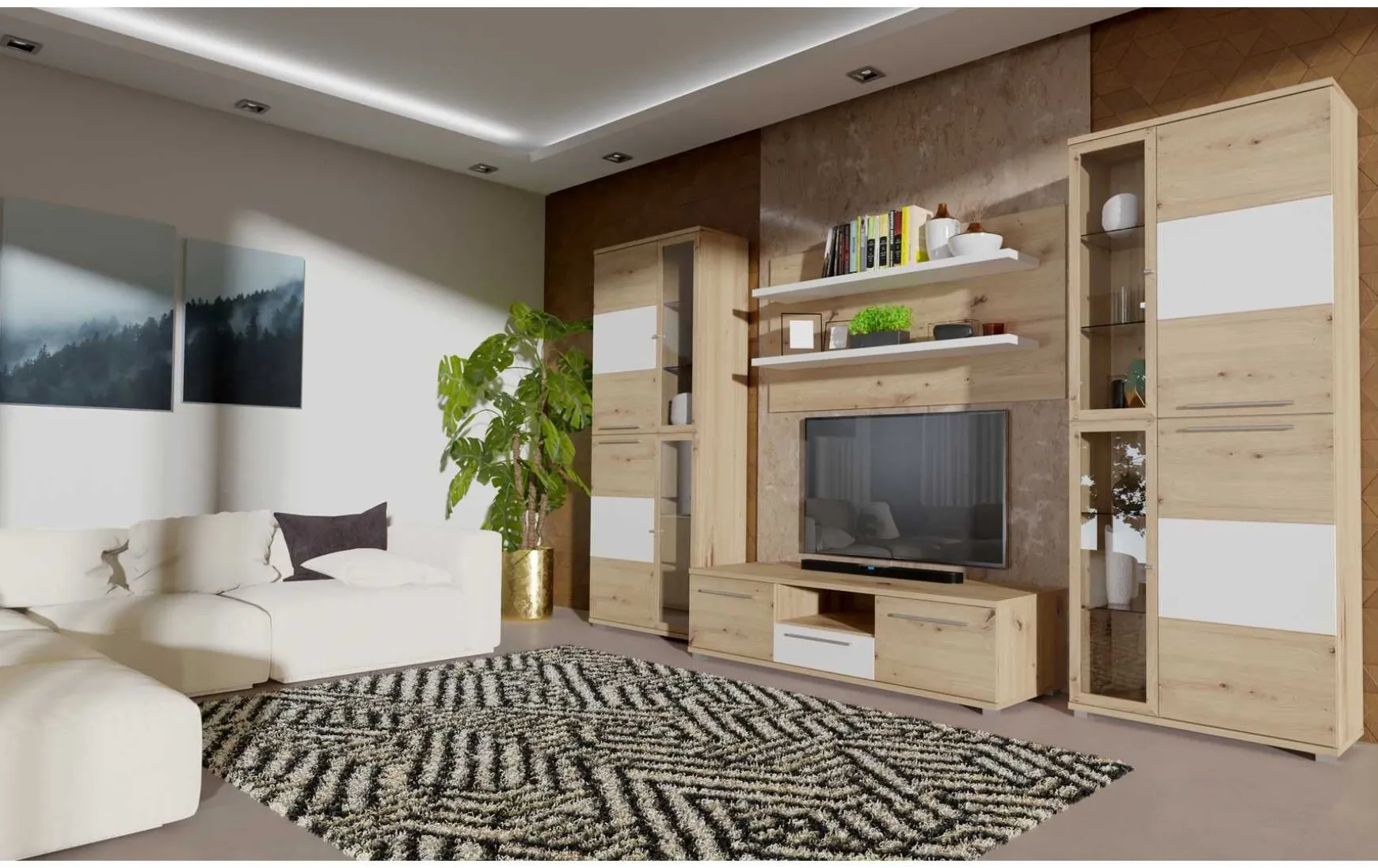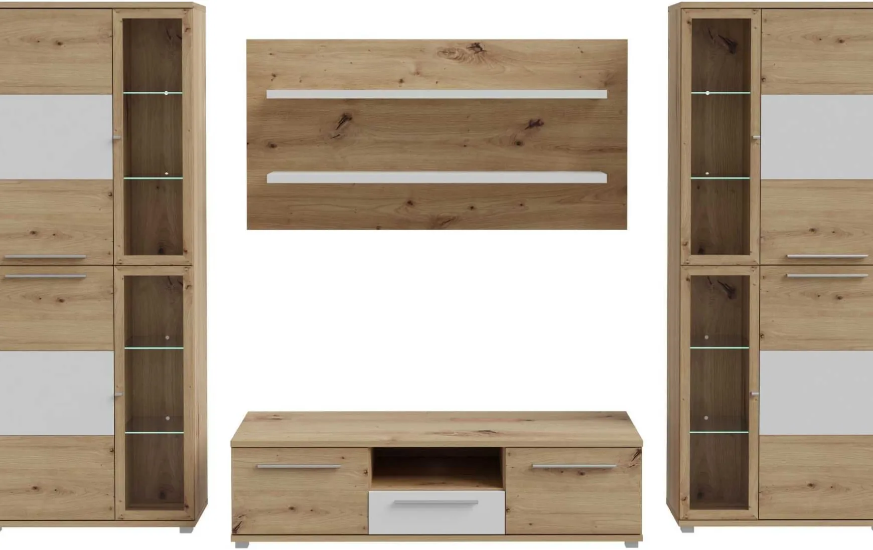 Diese moderne Wohnwand überzeugt durch ihr zeitloses Design und bietet dank sechs Türen und einer Schublade besonders viel Stauraum für Wohn- und Medienbereiche. Die integrierte Beleuchtung setzt dekorative Akzente und sorgt für eine angenehme Atmosphäre. Mit einer Breite von ca. 310 cm sowie dem warmen Dekor in Artisan Eiche mit hellen Akzenten fügt sich die Wohnwand harmonisch in moderne Einrichtungsstile ein. Die pflegeleichte Oberfläche lässt sich einfach trocken abwischen. Gefertigt aus robustem Holzwerkstoff wird die Wohnwand zerlegt geliefert und ist für Selbstabholung oder Lieferung verfügbar.