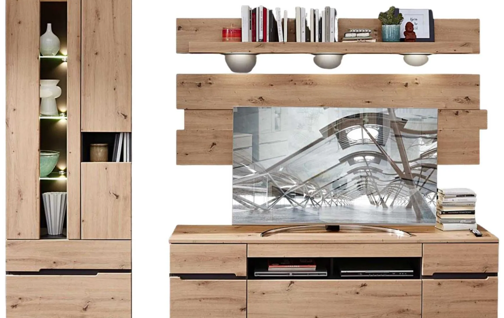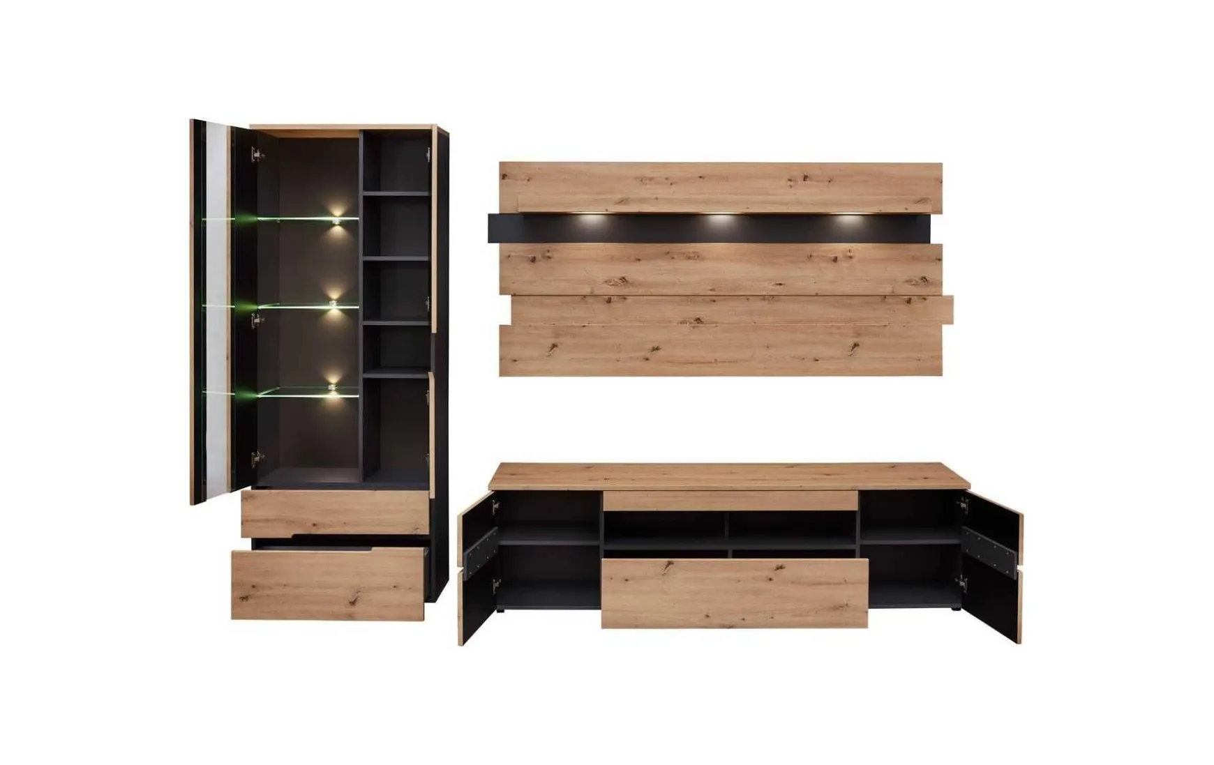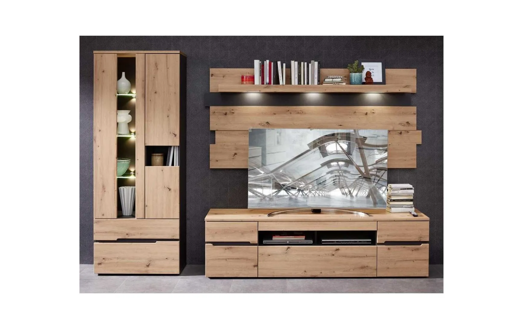 Mit seinem bezaubernden Design und der trendigen Ausführung zieht diese Wohnwand alle Blicke auf sich. Die Farben Artisan Eiche und graphit sorgen für ein modernes Ambiente, was die Wohnwand zu einem Highlight in Ihrem Wohnzimmer macht. Die stimmungsvolle LED-Beleuchtung rundet die Optik gekonnt ab. Viele Aufbewahrungsmöglichkeiten für Geräte und andere Utensilien gibt es ebenfalls.