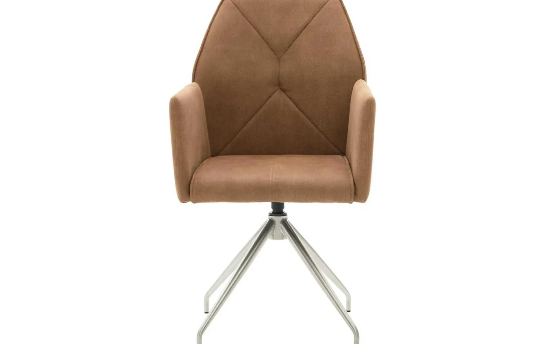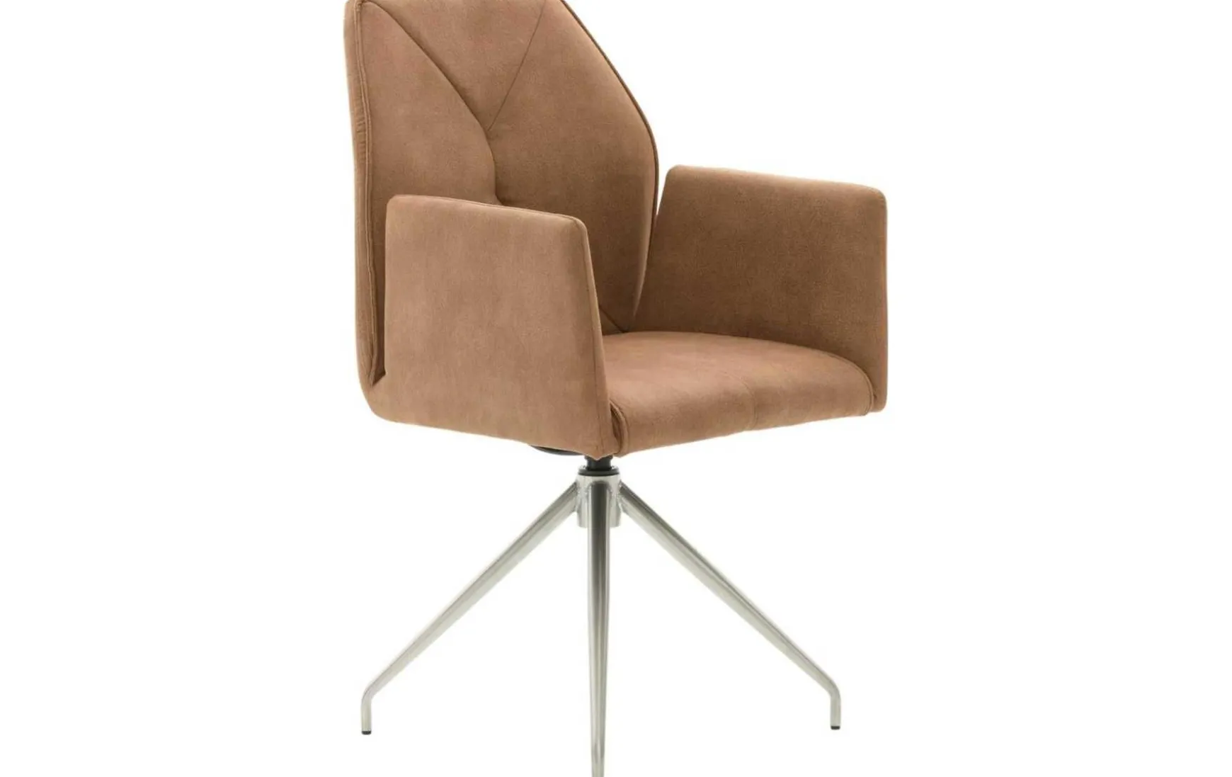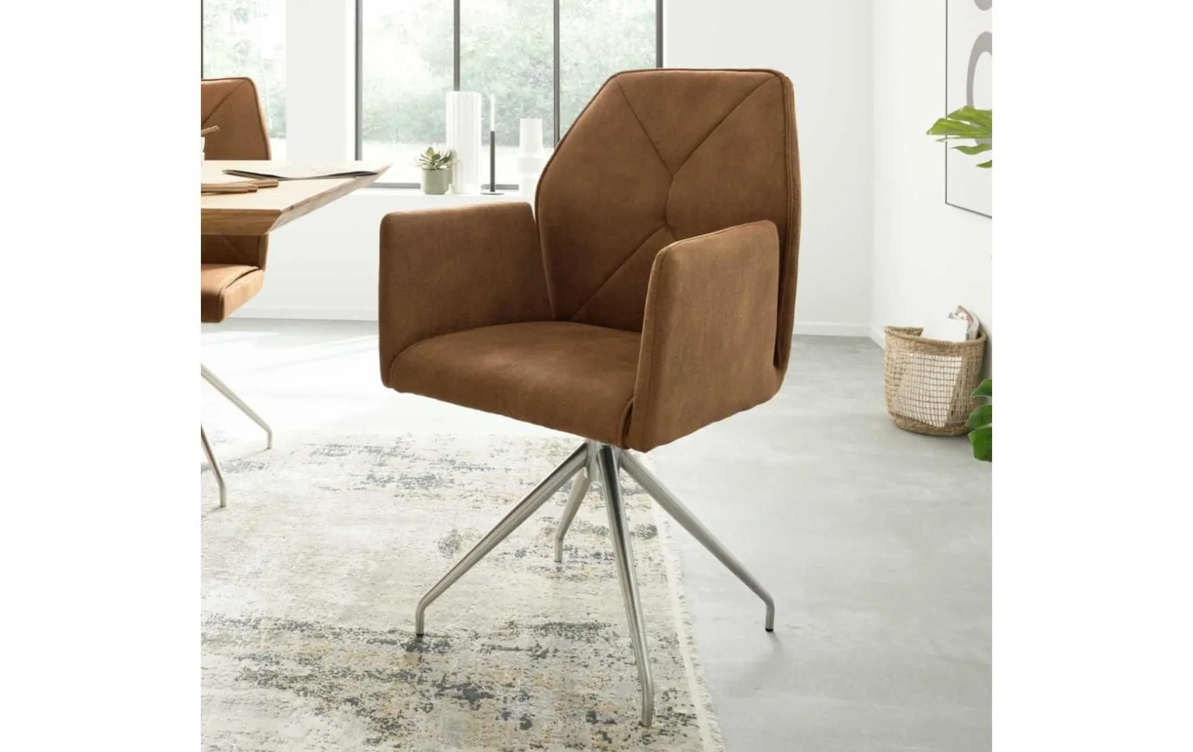 Der Armlehnstuhl mit Drehfunktion kombiniert eine mit bernsteinfarbener Mikrofaser im Wildlederlook bezogene Sitzschale mit einem robusten Stativgestell in gebürstetem Edelstahl. Durch die hochwertigen Materialien ist er stabil und langlebig. Optisch präsentiert sich der Esszimmerstuhl modern und elegant. Seine Maße belaufen sich auf ca. 61 x 98 x 51 cm (BxHxT). Dank der angenehmen Haptik der Mikrofaser, der viskoelastischen Komfortpolsterung auf einer Nosagunterfederung und der komfortabel wattierten und gesteppten Rückenlehne sitzen Sie auf dem Stuhl außerordentlich bequem. Ein weiteres Highlight bildet die Motion-Funktion für 3D-Sitzkomfort: Der Sitz ist dreidimensional in alle Richtungen beweglich und ermöglicht dadurch noch komfortableres, weil aktiv-dynamisches Sitzen. Zudem begeistert die 360-Grad-Drehbarkeit des Sitzes mit automatischer Rückstellfunktion: Nach dem Aufstehen geht der Armlehn-Drehstuhl von selbst in die Ausgangsposition zurück.
