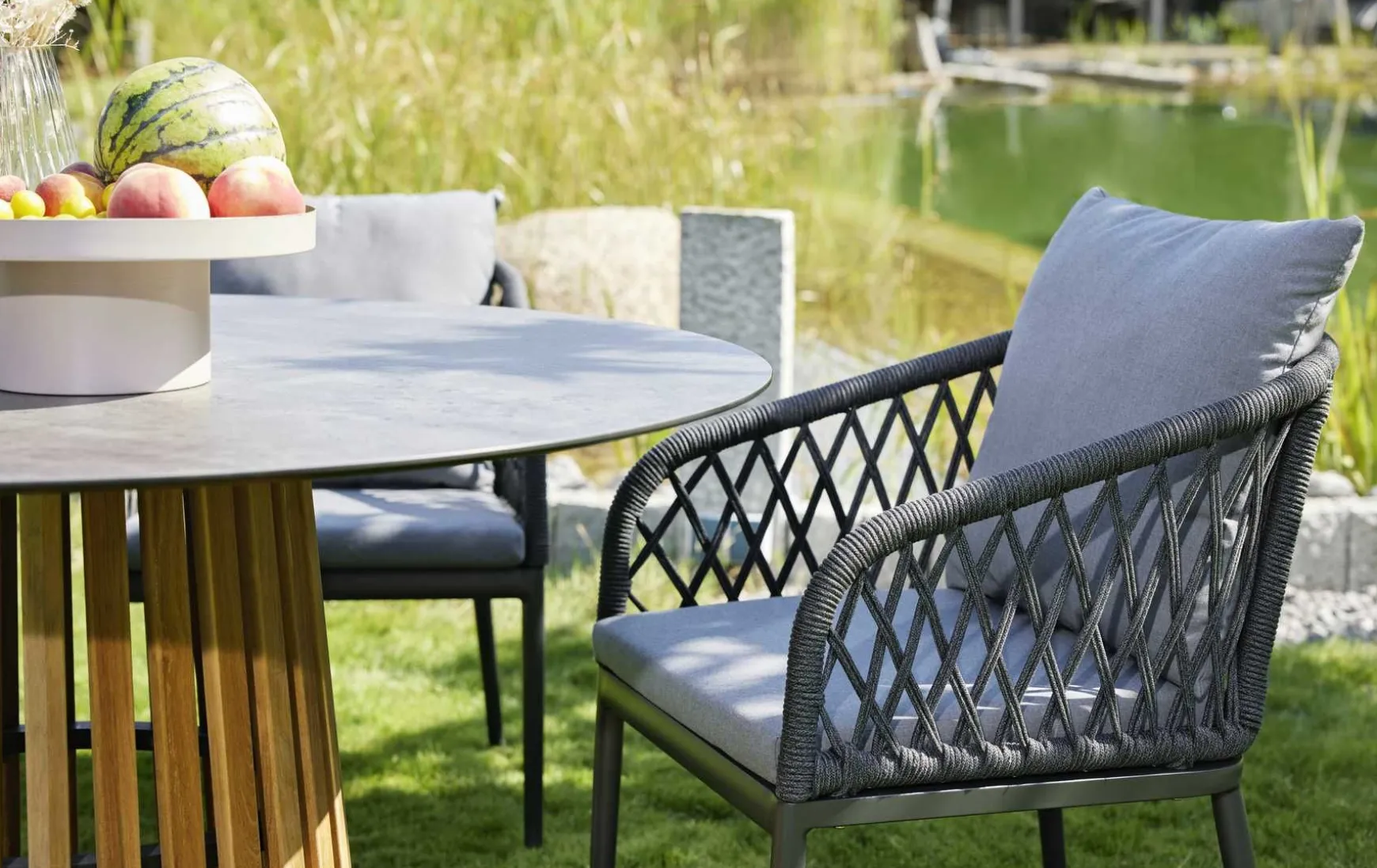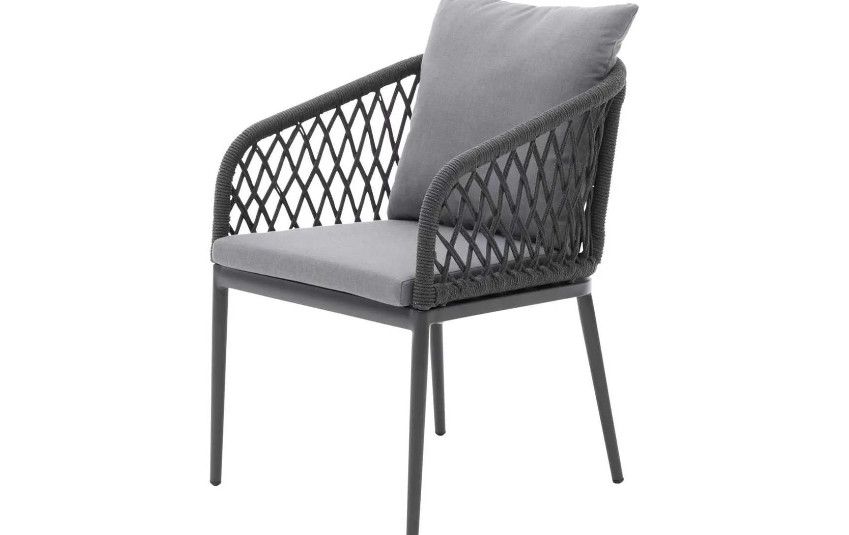 Dieser moderne Armlehnstuhl für den Garten vereint stilvolles Design mit hohem Komfort und langlebigen Materialien. Der pflegeleichte Bezug macht den Stuhl besonders alltagstauglich und ideal für den Einsatz im Outdoor-Bereich. Das stabile Gestell aus pulverbeschichtetem Aluminium in Anthrazit sorgt für eine moderne Optik sowie hohe Widerstandsfähigkeit gegenüber Witterungseinflüssen. Ein besonderes Design-Highlight ist die Kordelflechtung an Seiten und Rücken in eleganter Rautenoptik in Grau, die dem Armlehnstuhl eine hochwertige und luftige Ausstrahlung verleiht. Für maximalen Komfort sind Sitz- und Rückenkissen bereits inklusive, sodass Sie entspannte Stunden auf Terrasse, Balkon oder im Garten genießen können.