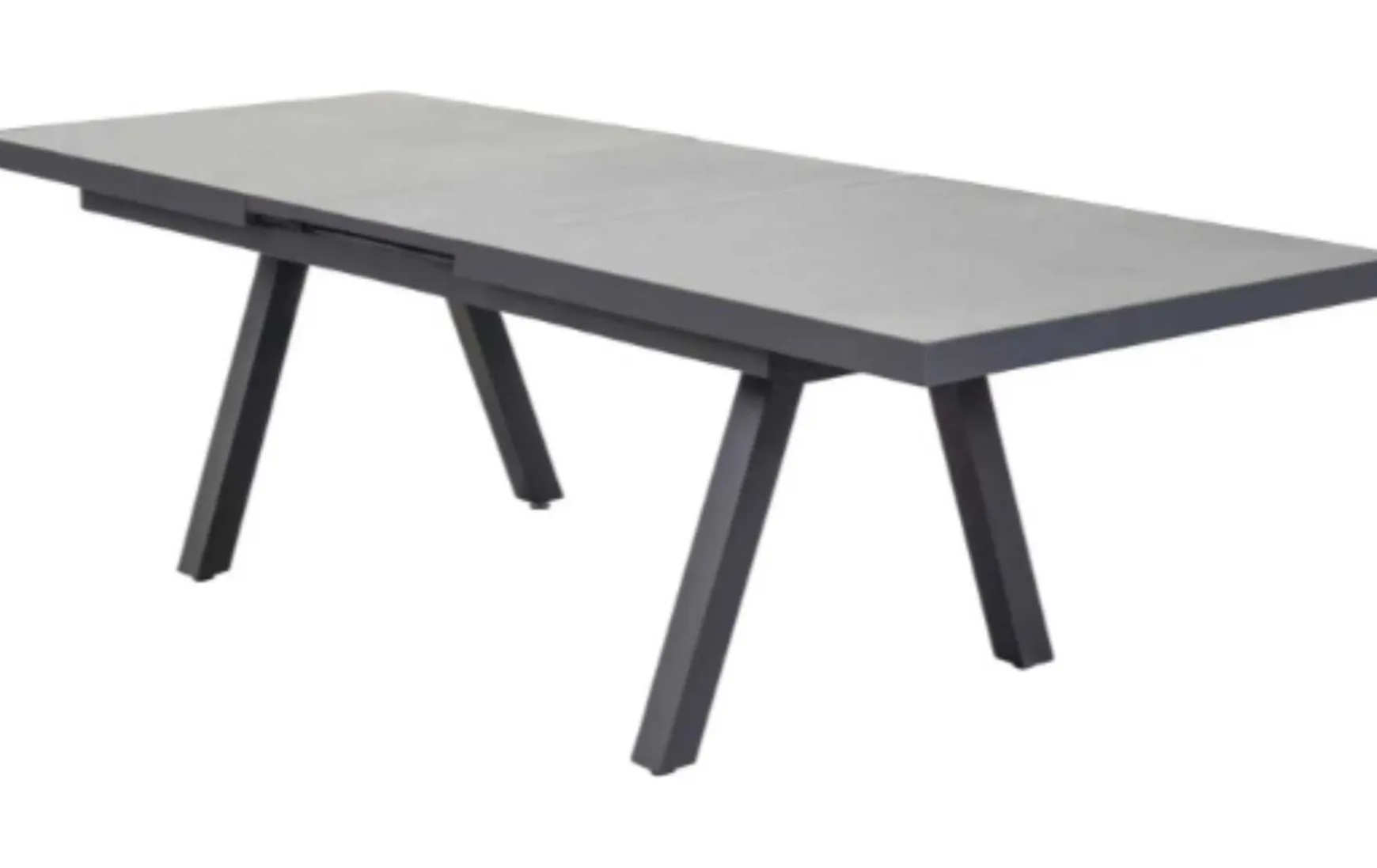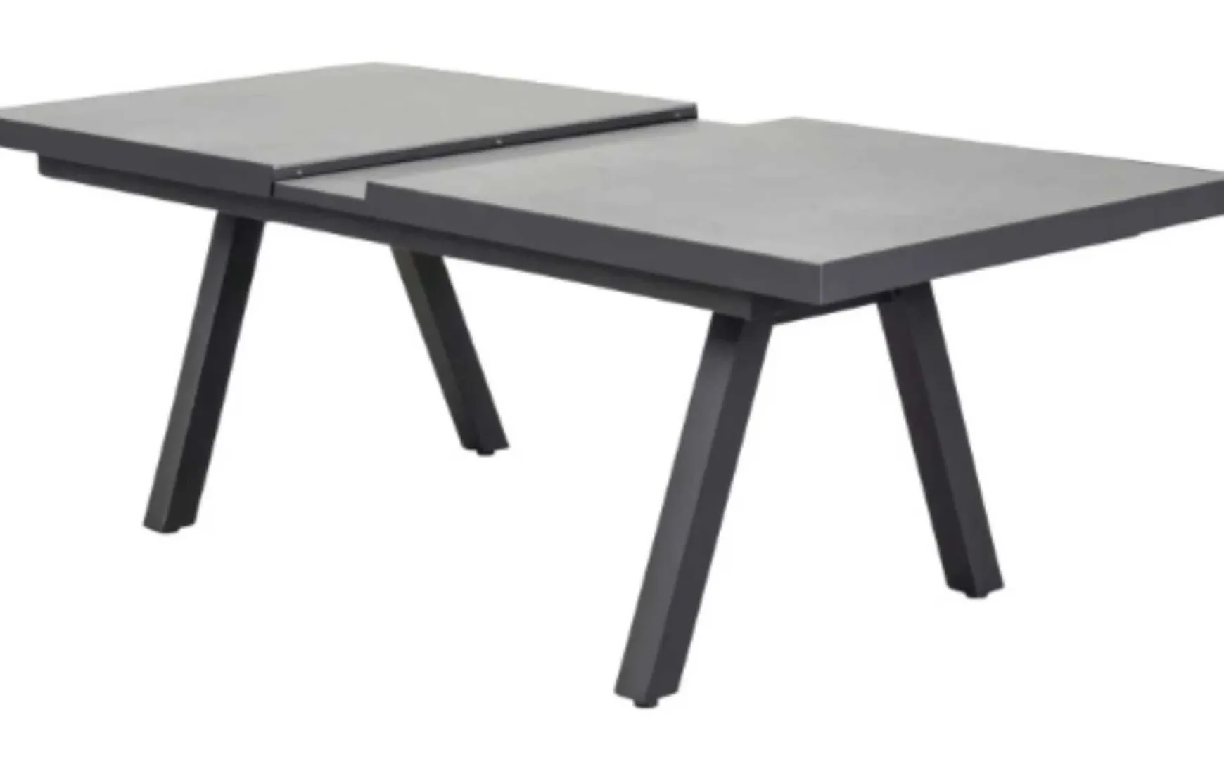 Der ausziehbare Tisch (100 x 200/260 cm) vereint modernes Design mit Funktionalität und Langlebigkeit, bietet eine stilvolle Keramik-Tischplatte im Betonlook sowie ein wetterbeständiges, anthrazitfarbenes Aluminiumgestell – ideal für den Außenbereich.