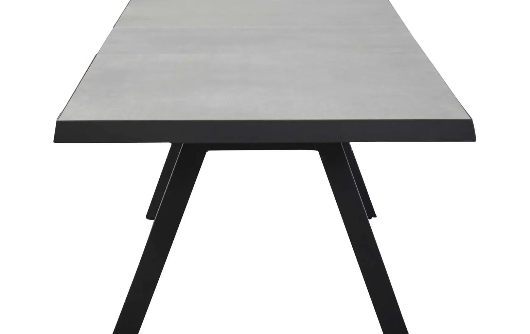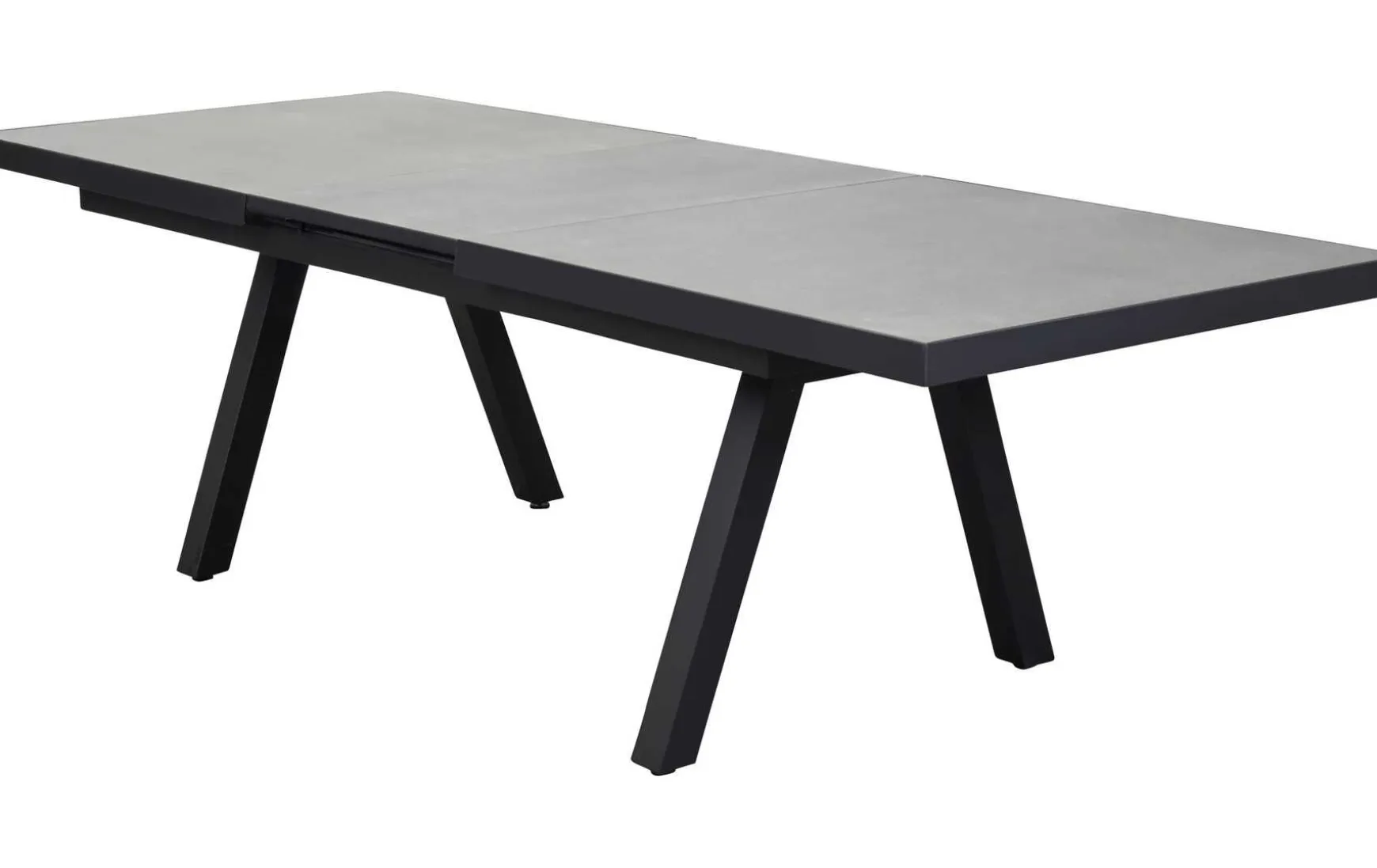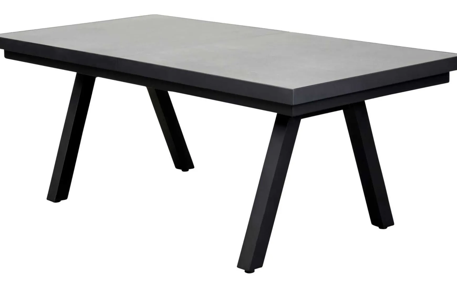 Das Gestell des leichten Tisches besteht aus Aluminium. Die Tischplatte ist aus schönem Keramik gefertigt. Im Gegensatz zu vielen anderen Tischplattenmaterialien sind Keramikplatten äußerst kälte- und hitzebeständig und zählen somit zu den robustesten Tischplatten auf dem Markt. Für ein stimmiges Gesamtbild wurde für die Platte die Farbe Anthrazit gewählt. Das Design des Ausziehtisches ist klassisch rechteckig gestaltet. Sein hohes Eigengewicht garantiert, dass der Ausziehtisch stabil und windsicher im Garten steht.