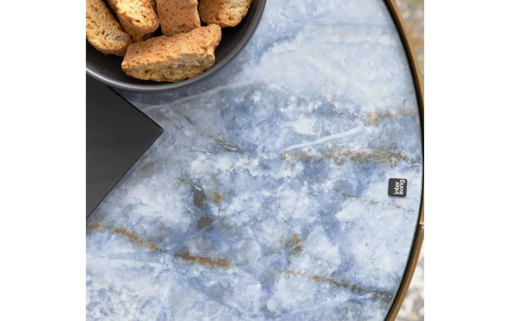 Dieser Beistelltisch kombiniert eine Keramik-Tischplatte in blau-onyxfarbener Marmoroptik mit einem matt bronzefarben lackierten Rahmen und Stahlfüßen in mattschwarzem Lack. Durch die speziellen Materialien und Farben strahlt er moderne Extravaganz aus und ist in jedem Raum ein echter Hingucker. Ob im Wohn- oder Schlafzimmer, im Flur oder im Home Office: Sie können den Tisch vielfältig einsetzen. Auch qualitativ hat der Beistelltisch einiges zu bieten: Die hochwertige Keramikplatte ist auf 6 mm starkem Glas verklebt. Dies macht die Konstruktion besonders robust und stabil. Der Durchmesser des stilvollen Tisches beträgt ca. 40 cm, bei einer Höhe von ca. 38 cm.
