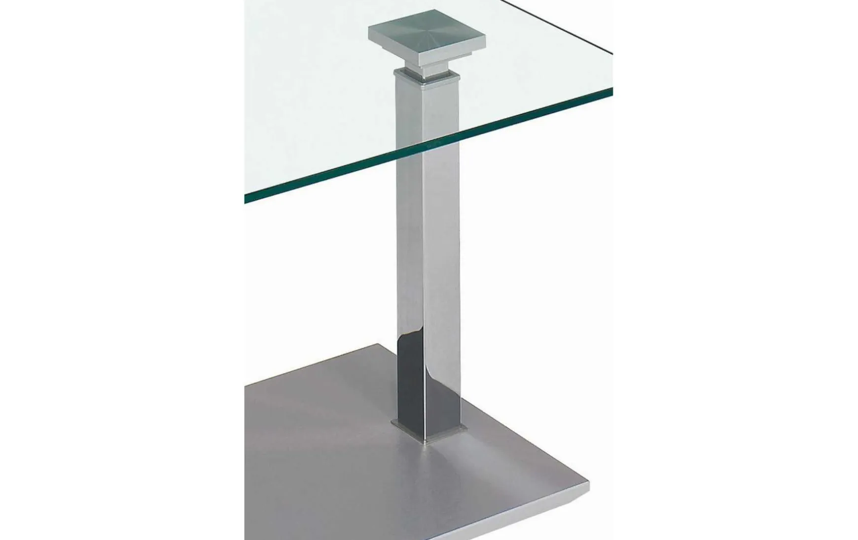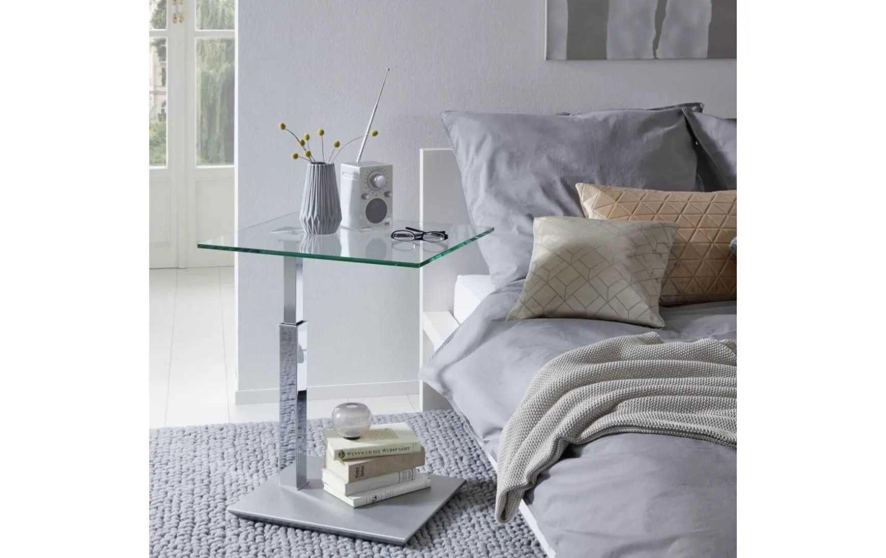 Höhenverstellbarer Beistelltisch, 55x47cm, Höhe von 47-65cm stufenlos verstellbar mit einer 10mm ESG-Glasplatte., Bodenplatte in Schliffoptik edelstahlfarbig.
