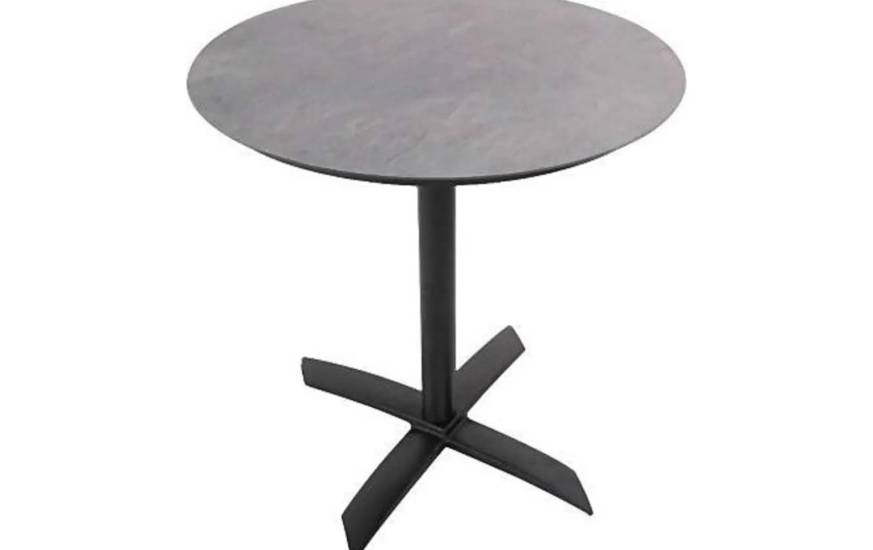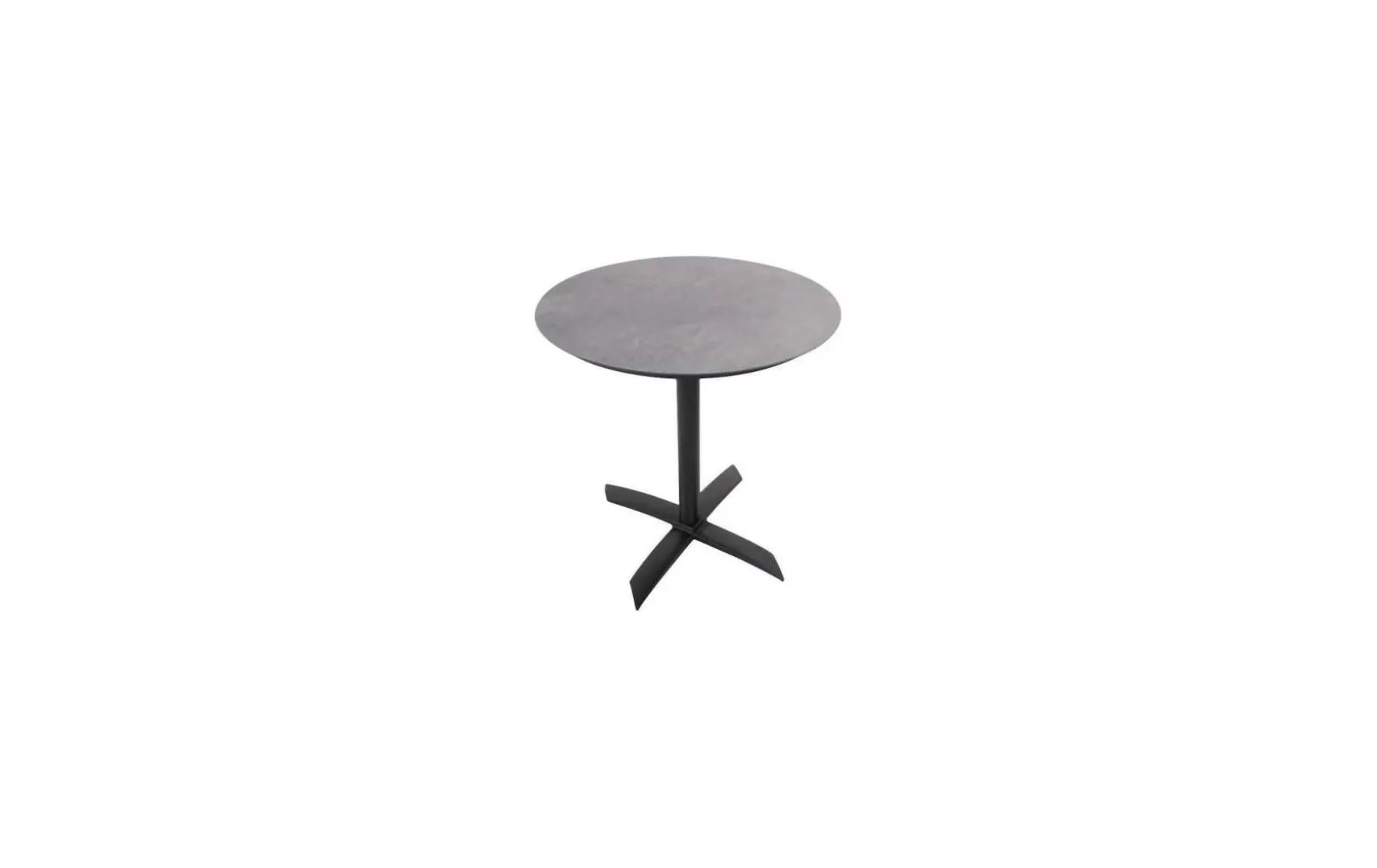 Der Bistrotisch hat eine Höhe von ca. 70 cm und gehört zur Farbgruppe Grau. Er besteht aus Metall, wobei das Gestell aus Aluminium und die Tischplatte aus Glas mit Keramik-Beschichtung gefertigt sind. Der Durchmesser des Tisches beträgt ca. 70 cm. Der Tisch ist klappbar und somit platzsparend zu verstauen. Das Material Aluminium macht den Tisch wetterfest und langlebig. Die Farbe des Gestells und der Tischplatte ist Anthrazit. Mit seiner runden Form eignet er sich ideal für den Einsatz im Garten, auf dem Balkon oder auf der Terrasse.