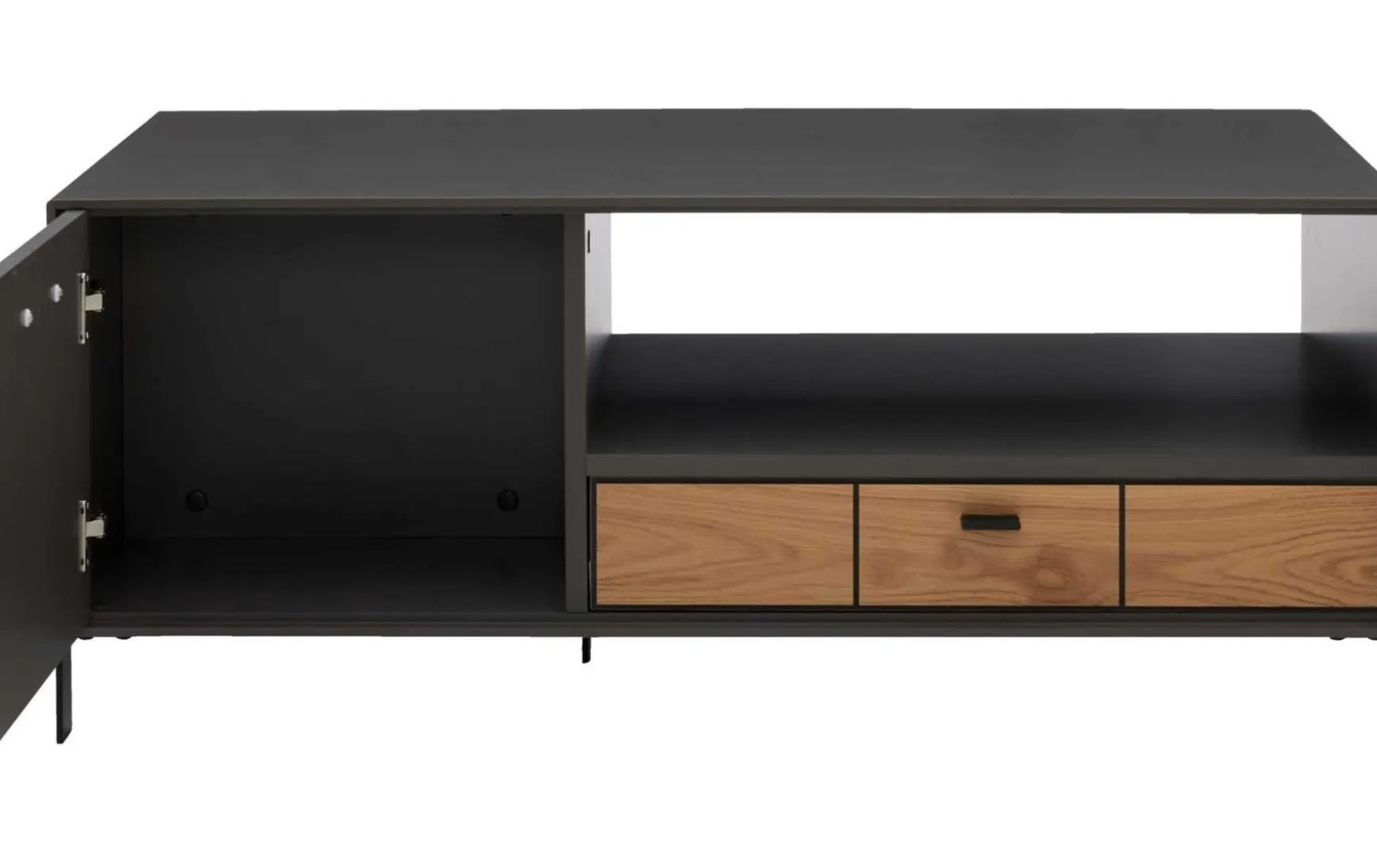 Der Couchtisch überzeugt mit seinem stilvollen Design und der hohen Qualität. Seine wolframgrauen Lackoberflächen strahlen moderne Eleganz aus. Für das gewisse Etwas sorgen die Akzente aus Spaltholz auf schwarzer MDF und die Details aus schwarz lackiertem Metall mit Feinstruktur. Jede lange Seite ist mit zwei Holztüren ausgestattet. Zusätzlich verfügt der Wohnzimmertisch über eine beidseitig zu öffnende Schublade mit Spaltholzfront und ein offenes Fach. Sie erhalten den Couchtisch mit Maßen von ca. 110 x 45 x 60 cm (B/LxHxT)