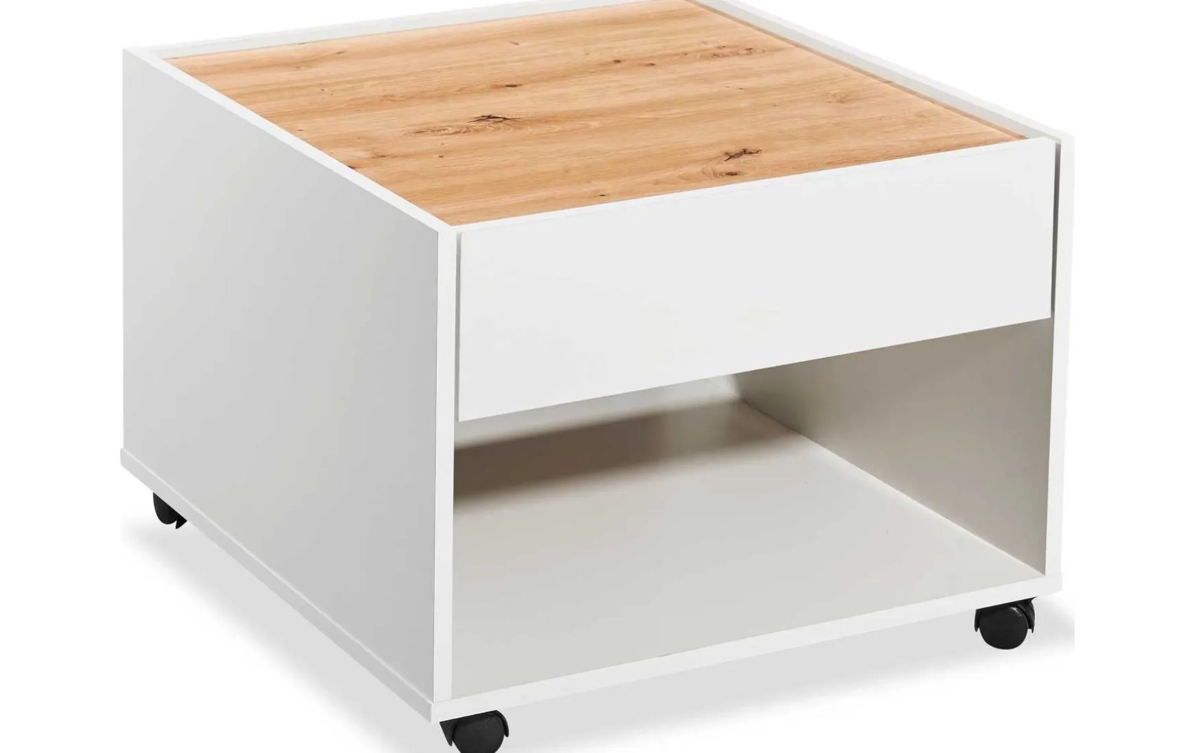 Der moderne Couchtisch überzeugt durch sein schlichtes Design und praktische Funktionalität. Ausgestattet mit einer Schublade bietet er Stauraum für kleinere Alltagsgegenstände, während die integrierten Rollen, inklusive Teppichbodenrollen, für maximale Flexibilität und leichtes Verschieben sorgen. Mit seinen kompakten Maßen von ca. 60 × 60 × 45 cm passt der Couchtisch ideal in verschiedene Wohnräume und fügt sich dank der weißen Oberfläche mit Eiche-Dekor harmonisch in ein modernes Wohnambiente ein. Der Holzwerkstoff sorgt für Stabilität, der Tisch wird zerlegt geliefert und ist einfach zu montieren.