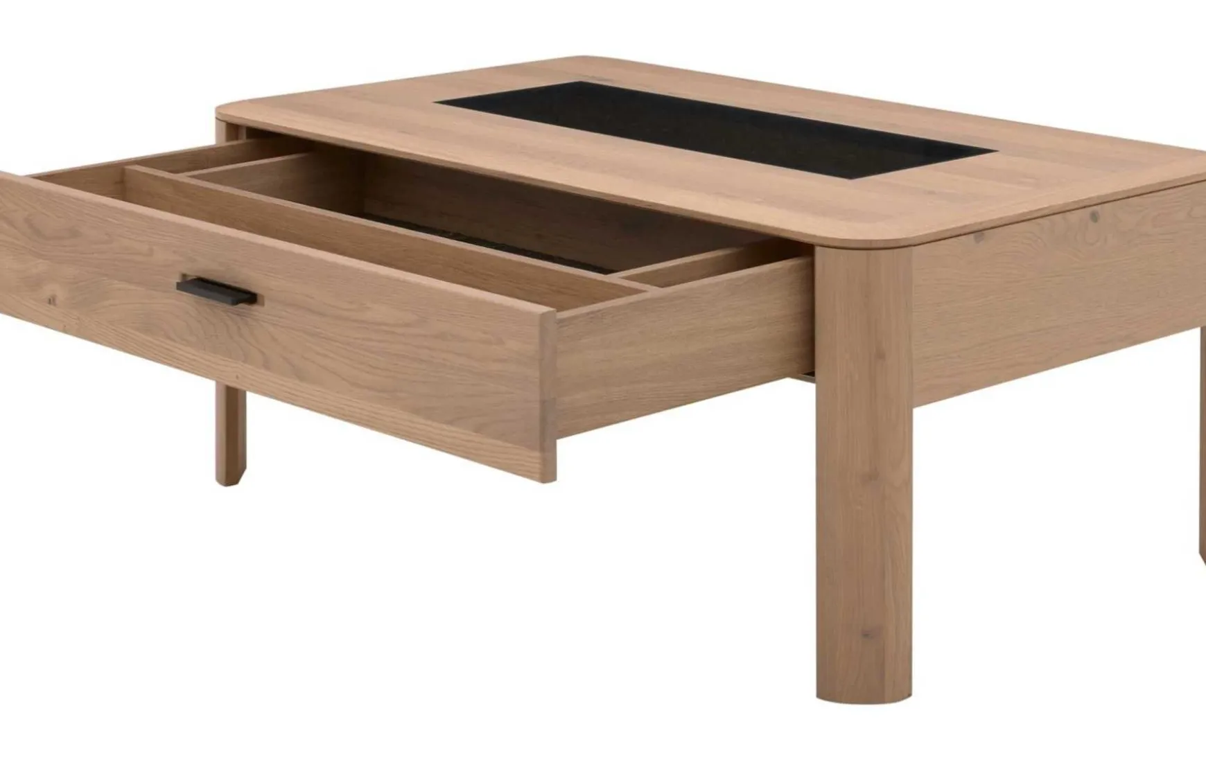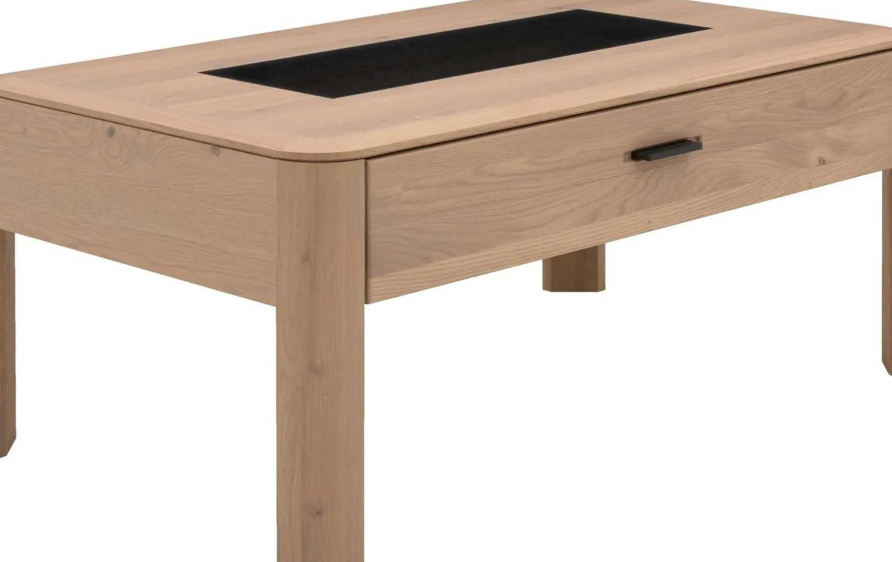 Hergestellt aus massiver Wildeiche, verkörpert der Couchtisch erstklassige Qualität. Einen gelungenen Akzent setzt die Einlage aus Parsolglas in der Mitte der Massivholz-Tischplatte. Durch die Schublade mit einem Boden in Granit-Steinoptik und einem mattschwarz lackierten Aluminiumgriff steht Ihnen Stauraum für Fernbedienungen, TV-Magazine und vieles mehr zur Verfügung. Sie erhalten den Couchtisch mit Maßen von ca. 110 x 46 x 65 cm (B/LxHxT)