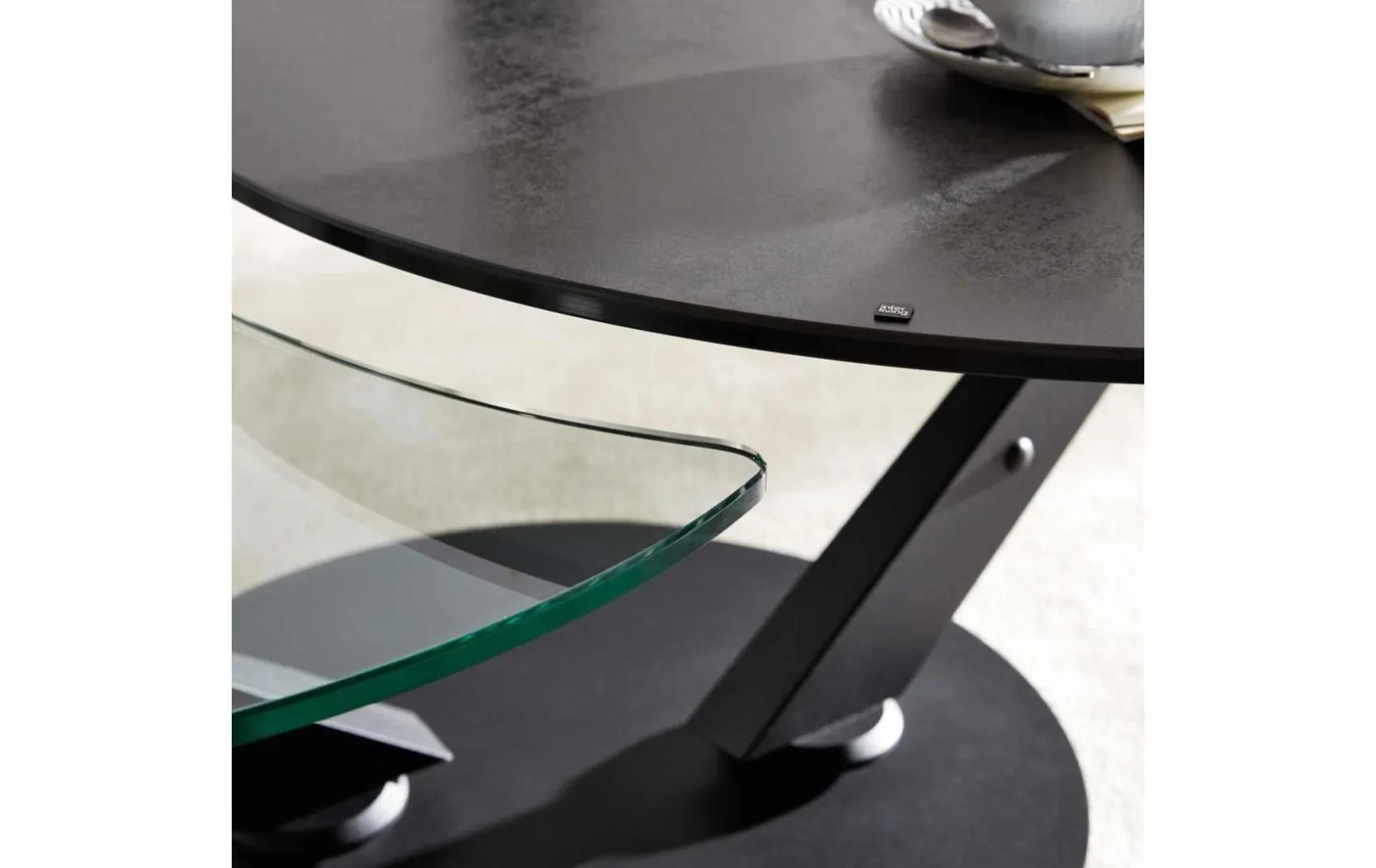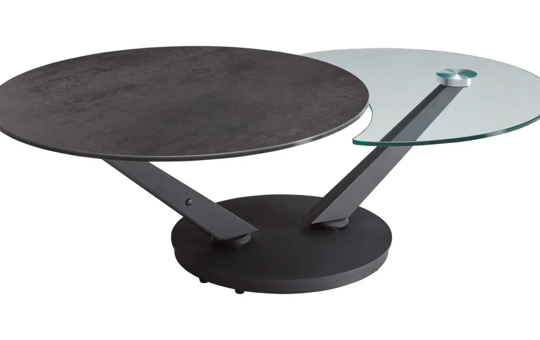 Mit der trendig titanfarbenen Keramiktischplatte, der Erweiterung in Klarglas und dem schwarz lackierten Stahlgestell verkörpert der Funktionscouchtisch moderne Eleganz. Dabei setzt die edel marmorierte Optik der Tischplatte ebenso einen attraktiven Akzent wie die spezielle Gestaltung des Gestells. Der Durchmesser der Keramiktischplatte beläuft sich auf ca. 80 cm, bei einer Höhe von ca. 40 cm. Wenn die Keramik- und die Glastischplatte synchron ausgefahren werden, beträgt der Gesamtdurchmesser bis zu ca. 125 cm. Als Highlight des Tisches fungiert der Drehmechanismus: Bei Bedarf können Sie beide Tischplatten nach außen drehen und in eine beliebige Position bringen, um mehr Abstellfläche verfügbar zu machen. Dies ist etwa praktisch, wenn Sie Gäste empfangen und gemütlich im Wohnzimmer Kaffee oder Tee servieren möchten. Funktionell begeistert die ausgeprägte Robustheit der Materialien. Dank der enormen Widerstandsfähigkeit des Stahls sowie der kratz- und schlagfesten Eigenschaften der 3 mm starken Keramik, die für besonders hohe Stabilität auf 6 mm Glas verklebt ist, bringt der Sofatisch beste Voraussetzungen mit, um Ihr Wohnzimmer jahrelang in exzellentem Zustand zu bereichern. Selbst hohe Temperaturschwankungen verträgt er. Mit einer Stärke von 10 mm präsentiert sich auch die Klarglasplatte äußerst stabil.