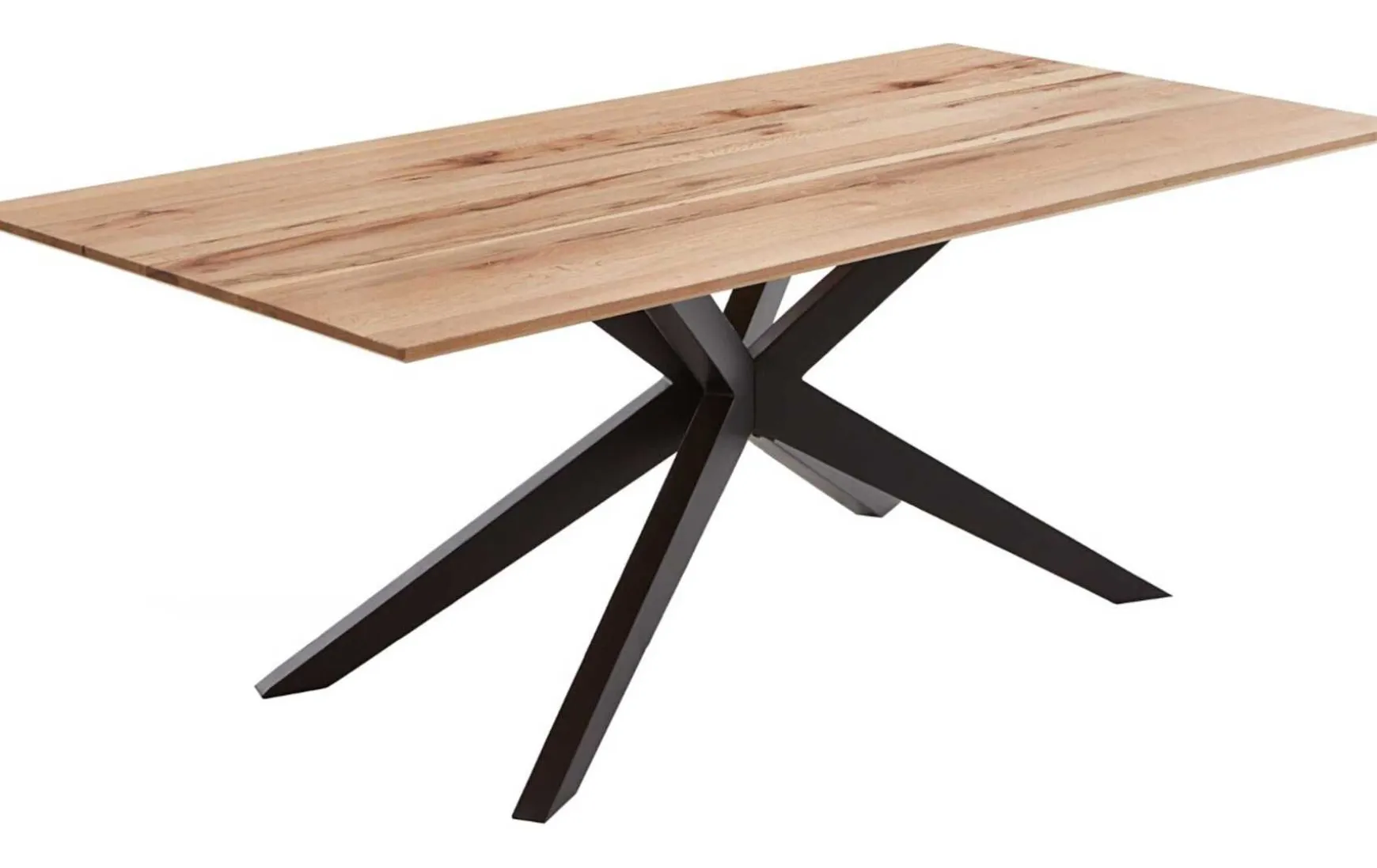 Dieser Esstisch wird angefertigt aus Balkeneiche – eine Massivholzvariante für Kenner und Liebhaber, mehr Natürlichkeit geht nicht! Der Tisch verfügt über eine Platte aus Natur-Balkeneiche und ein Facetten-Tischprofil. In Kombination mit dem exklusiven Sterngestell aus schwarzem Eisen ergibt sich ein einzigartiger Look, der ein absoluter Blickfang ist. Das Gestell sorgt zudem für optimale Beinfreiheit.