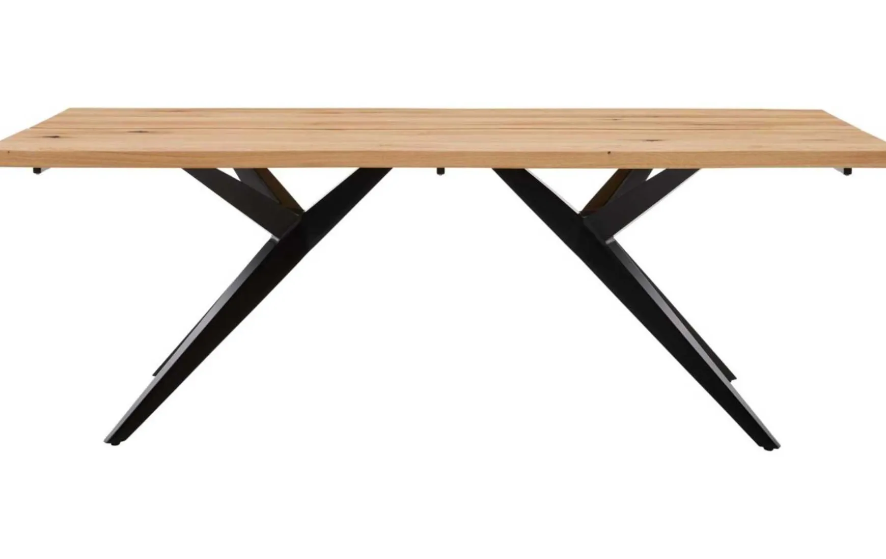 Mit der hochwertigen Massivholzplatte in geölter Charakter-Eiche und dem kreativ designten, stabilen Y-Gestell aus mattschwarzem Eisen zieht der Esstisch die Blicke auf sich. Dabei begeistert die Platte auch mit der Innenfuge und den Kanten im Live-Edge-Look (Baumkante). Auf ca. 180 x 75 x 100 cm (L/BxHxT) belaufen sich die Maße der modernen Speisetafel.