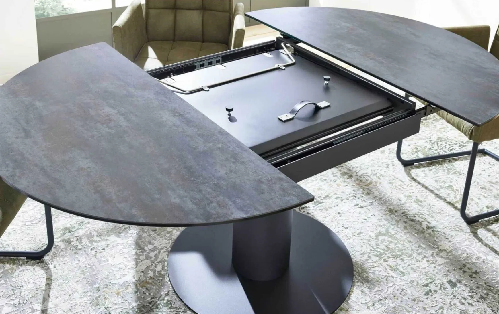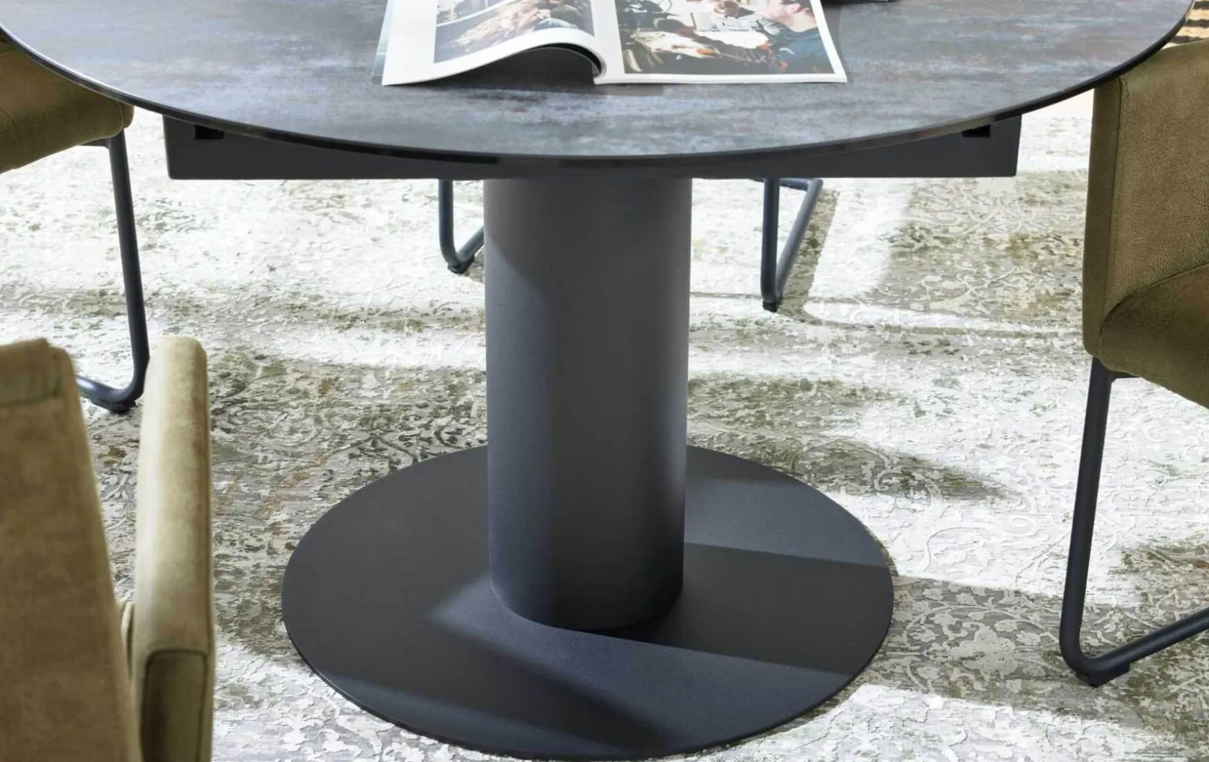Beim diesem Auszugtisch handelt es sich um ein innovativ designtes Möbel, das optisch begeistert, funktional überzeugt und darüber hinaus das Potenzial hat, Ihrer Räumlichkeit eine neue, sehr extravagant-markante Ausstrahlung zu verleihen. Er besteht aus einem schwarz pulverbeschichteten Säulengestell aus Metall sowie einer elegant-dunkelgrau gehaltenen Tischplatte aus hochwertiger Glaskeramik. Praktischerweise können Sie den Tisch im angesagten Industrial-Stil mit verschiedenen Wohnstilen von klassisch bis modern wunderbar in Einklang bringen. Dank der ca. 60 cm breiten Einlegeplatte lässt sich der rund geformte Ausziehtisch der Interliving Esszimmer Serie 5104 bei Bedarf verlängern. Mit einem Durchmesser von ca. 120-180 cm ist das Möbel variabel an die jeweilige Situation anpassbar. Die Tischhöhe beträgt ca. 77 cm. Auf Wunsch können Sie den Auszugtisch in anderen Farben bestellen. Auch in Bezug auf die Formgebung sind Sie nicht festgelegt, der Tisch ist nämlich auch rechteckig erhältlich.