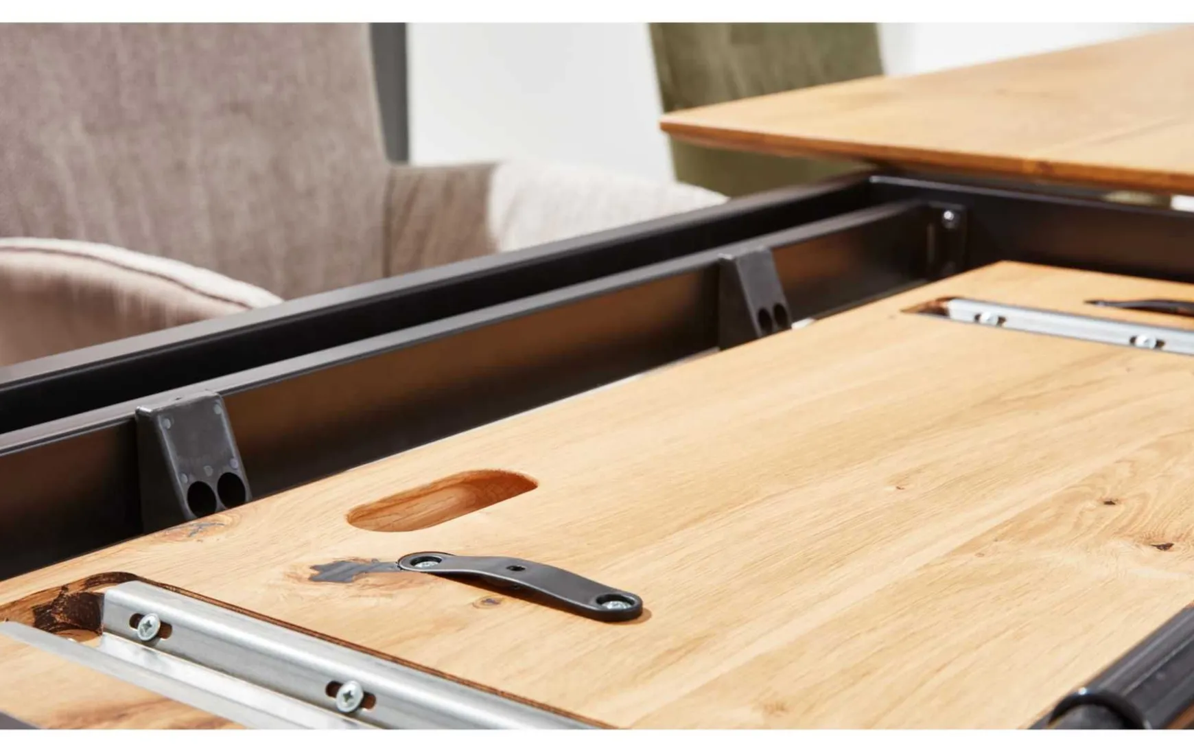 Dieser Esstisch ist ein Schmuckstück für dein Esszimmer. Mit seinem schwarzen Eisengestell und der filigranen Tischplatte aus massiver Charakter-Eiche verleiht er deinem Raum einen zeitlosen und natürlichen Charme. Die Kombination aus Holzfarben und Schwarz verleiht dem Tisch eine edle und moderne Optik, die in nahezu jedes Einrichtungskonzept passt. Das robuste und langlebige Material macht den Tisch zu einem zuverlässigen Begleiter für viele Jahre. Besonders praktisch ist die Ausziehfunktion des Tisches. Mit Hilfe von Frontslide und Falteinlage kann der Tisch um ca. 80 cm verlängert werden, perfekt, um Gäste zu empfangen und zusätzlichen Platz zu schaffen. Die integrierten Rollen machen das Ausziehen des Tisches besonders einfach und komfortabel. Mit einer Läange von 200 cm und einer Tiefe von 100 cm bietet der Esstisch ausreichend Platz für deine Familie und Freunde, um gemeinsam schöne Stunden zu verbringen. Erlebe zeitlose Eleganz und praktische Funktionalität vereint in einem Tisch