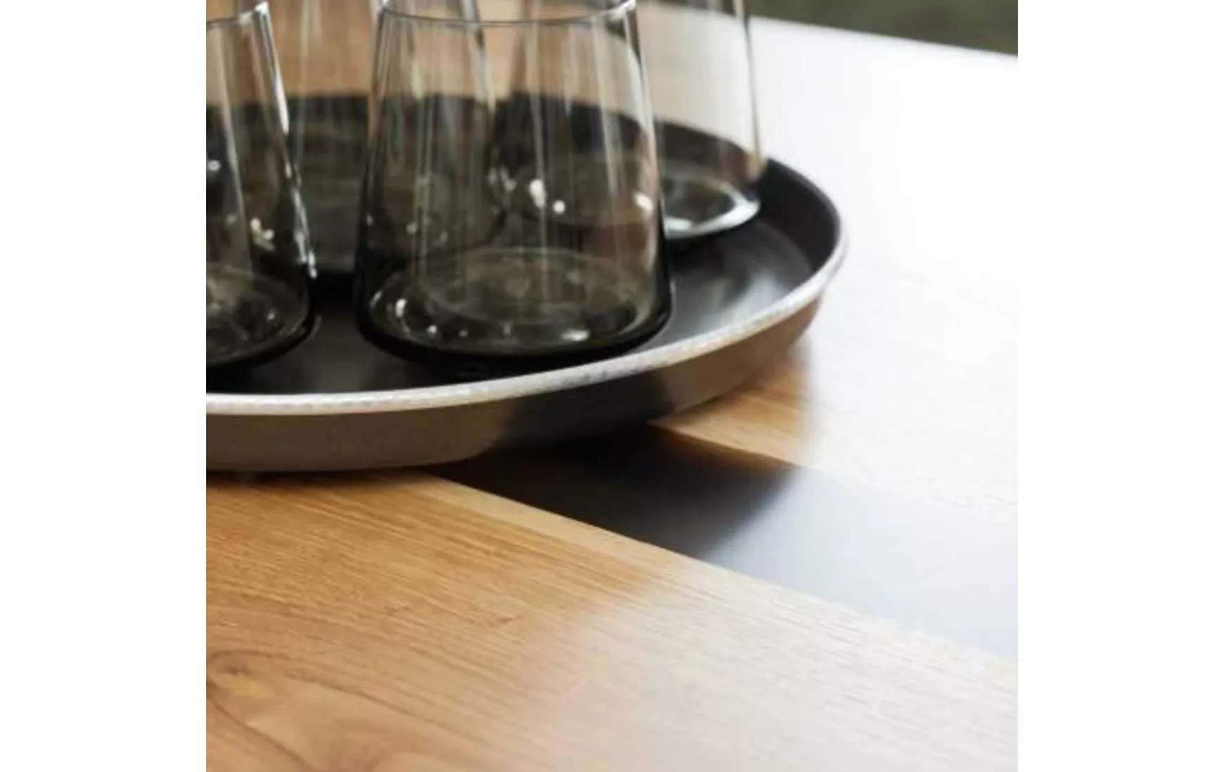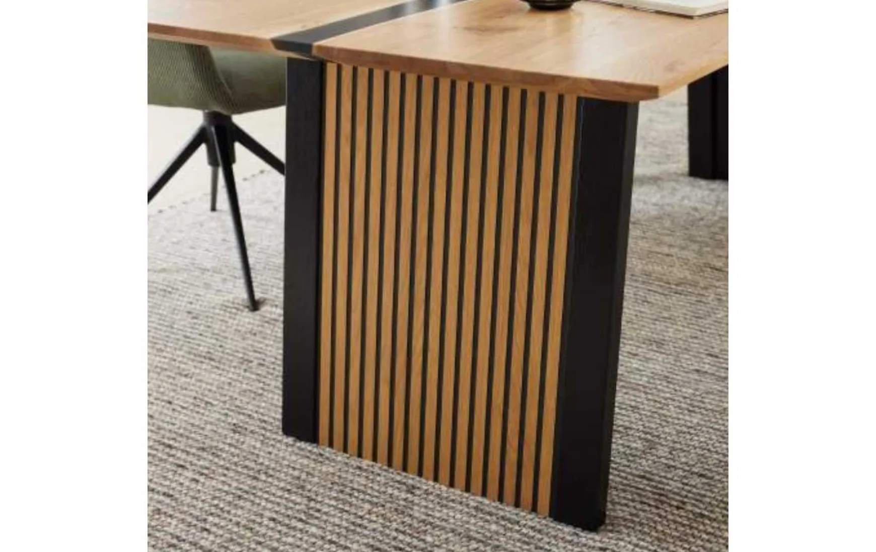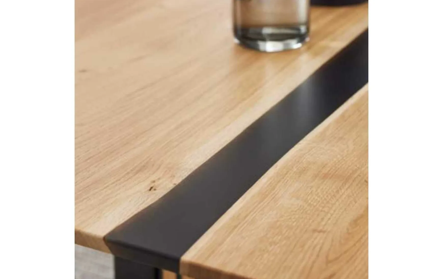 Der moderne Esstisch beeindruckt mit seiner edlen Tischplatte in Charakter-Eiche. Akzente setzen zum einen die umlaufende abgeschrägte Schweizer Kante und zum anderen die fein geschliffene und lackierte Einlage aus schwarz transparentem Epoxidharz in der Plattenmitte. Das markante Wangengestell in Lamellenoptik rundet die ca. 220 x 75 x 100 cm (L/BxHxT) große Speisetafel perfekt ab.