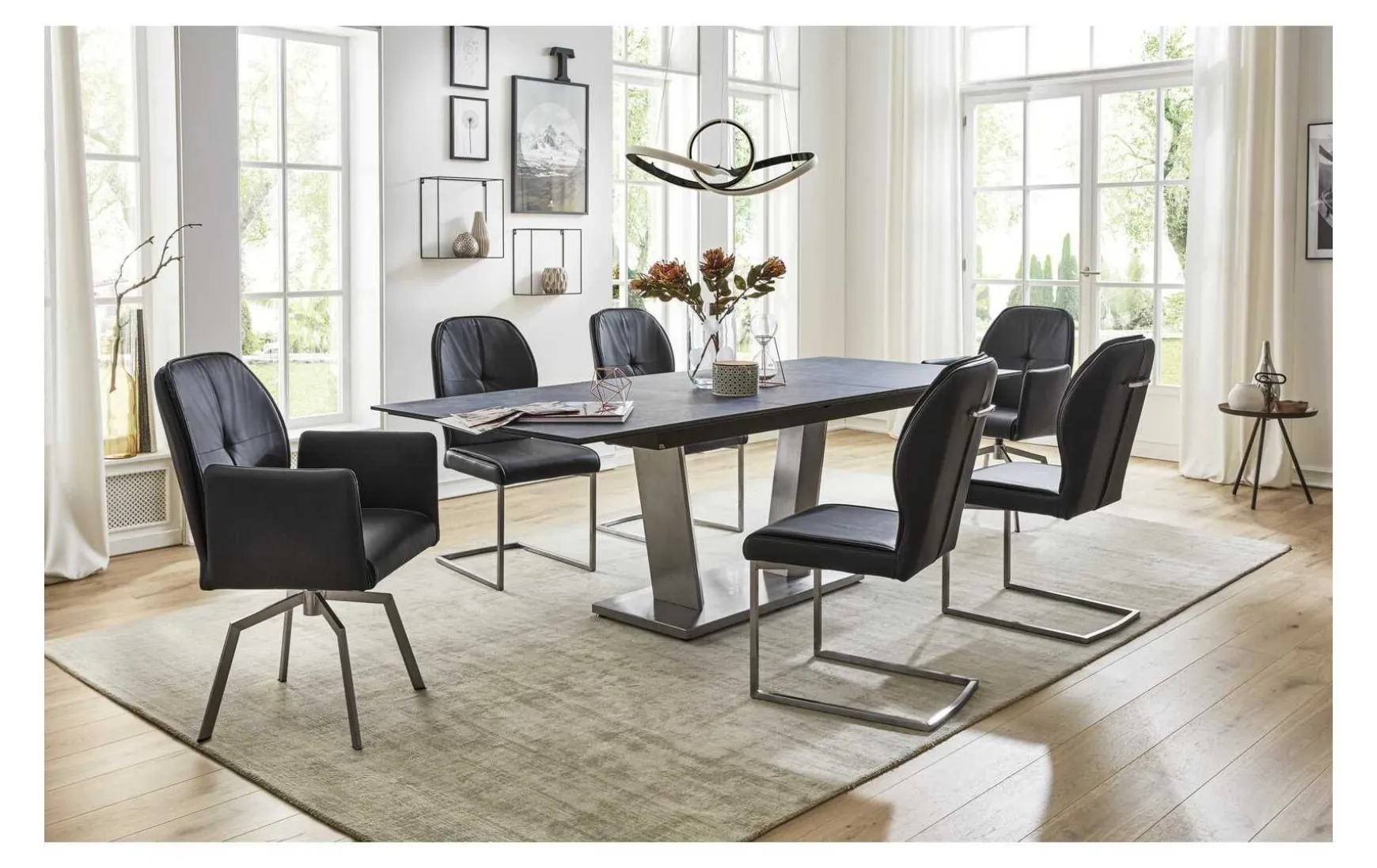 Die erstklassig verarbeiteten Elemente dieser Esszimmerserie bieten Ihnen die Gelegenheit, ein Esszimmer zu gestalten, das Ihren Vorstellungen in puncto Optik und Funktion zu 100 Prozent entspricht. Sie lassen sich individuell an Ihre Anforderungen und Wünsche anpassen – dank eines umfangreichen Stuhl- und Tischsystems. Für hohen Genuss beim Essen und geselligen Zusammensitzen mit Ihrer Familie oder mit Freunden und Bekannten ist ausgeprägter Sitzkomfort eine wesentliche Voraussetzung. Deshalb sind die Stühle dieser Esszimmerserie standardmäßig mit einer viskoelastischen Polsterung und Wattierung in Sitz und Rücken ausgestattet. Die beiden Armlehnstühle sind außerdem mit einer Nosagfederung in Sitz und Rücken ausgestattet – für eine extrem hohe Formstabilität, die den Sitzkomfort maximiert und konstant auf dieser Stufe hält. Sie haben die Wahl zwischen mehreren Stuhlgestellen. Jene, die hier in den Armlehnstühlen verwendet werden, erscheinen als formschöne und besonders leichte Vierfußausführungen mit praktischer Drehfunktion, ergänzt um eine automatische Rückstellfunktion. Des Weiteren stehen die Sitzschalen in diversen Ausprägungen zur Verfügung: Jene, die hier in den vier Schwingstühlen enthalten sind, kombinieren modern-ansprechende Designs mit einem Höchstmaß an Sitzkomfort. Durch die beliebige Verknüpfbarkeit aller Gestelle und Sitzschalen sind überaus beeindruckende 560 verschiedene Stühle wählbar. Für absolute Harmonie der Stühle mit dem Tisch lässt sich Letzterer perfekt auf Erstere abstimmen. Das hier dargestellte Tischgestell verfügt über abgeschrägte Tischsäulen für eine elegante Trapezform. Hinsichtlich der Tischplatten wählen Sie zwischen runder und rechteckiger Formgebung. Die rechteckige Platte ist im angesagten Industrial Design gestaltet und bringt damit eine ganz eigene Note in Ihr Esszimmer – eine Menge Modernität gepaart mit einem Hauch Klassik. Der standardmäßig ca. 180 x 100 cm große Tisch kann bei Bedarf auf ca. 240 cm ausgezogen werden.
