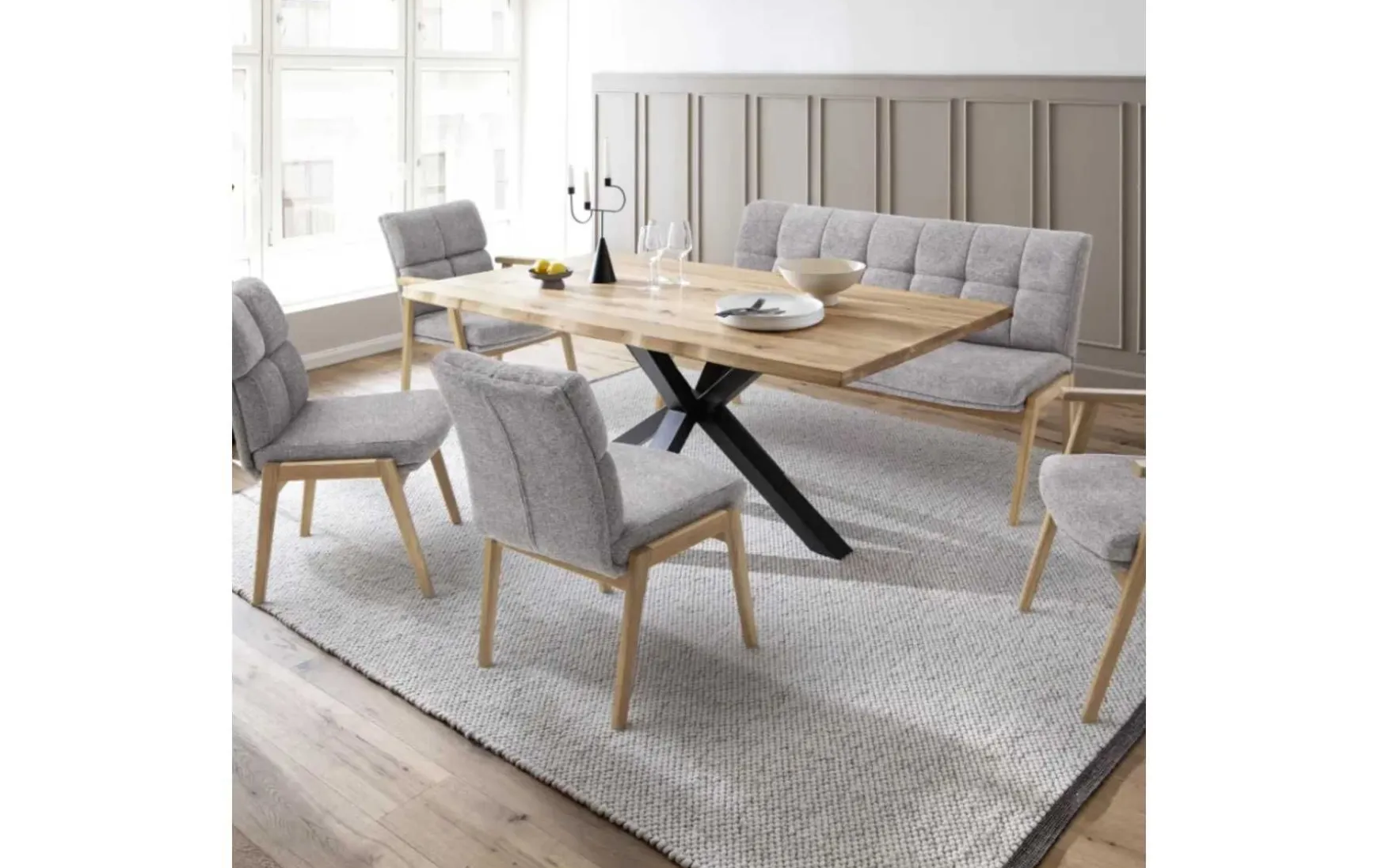 Dieser moderne Esstisch in Wildeiche massiv wird garantiert zum Blickfang in Ihrem Esszimmer! Perfekt, um die ganze Familie bei einem gemütlichen Abendessen oder Spieleabend zusammen zu bringen.