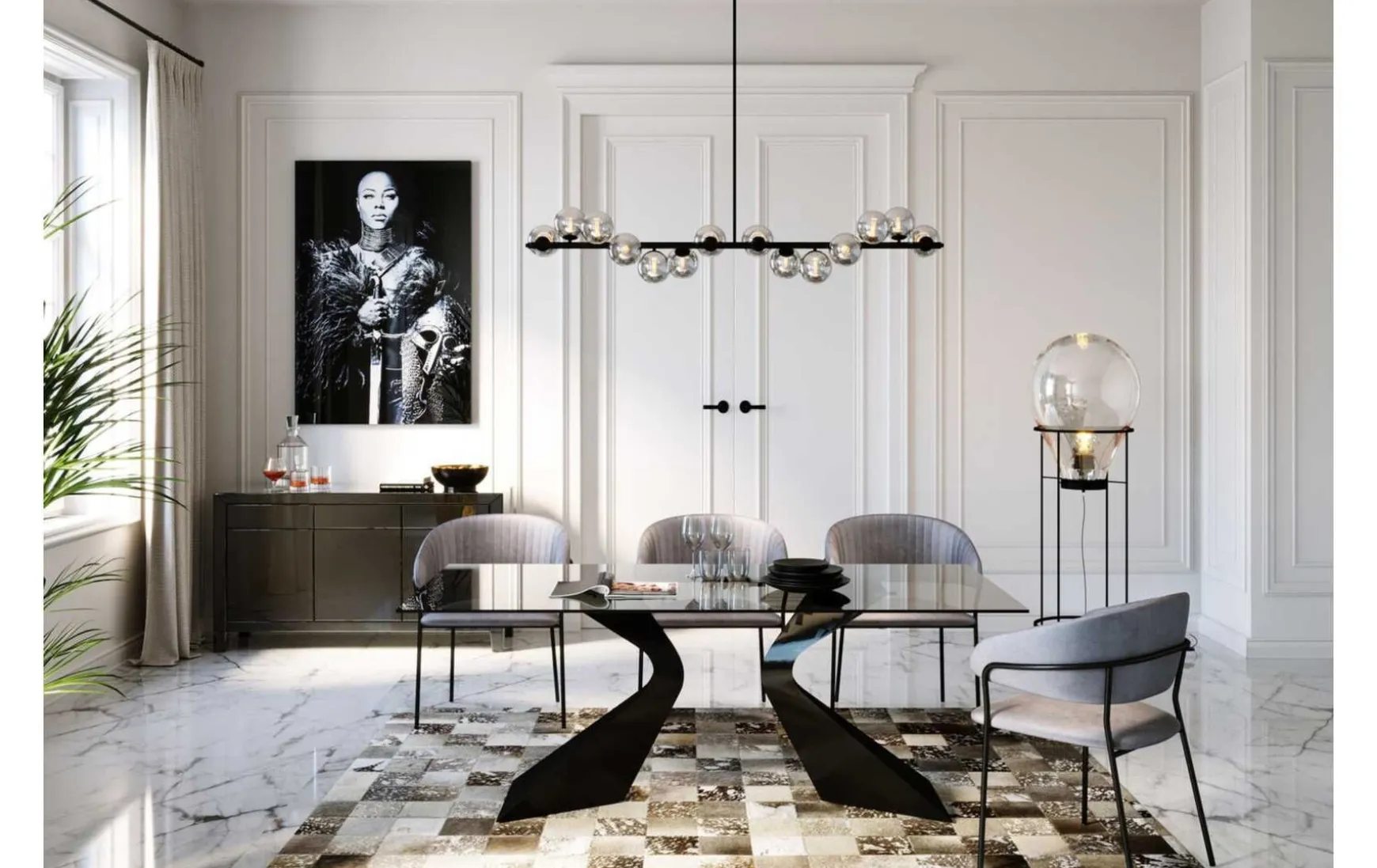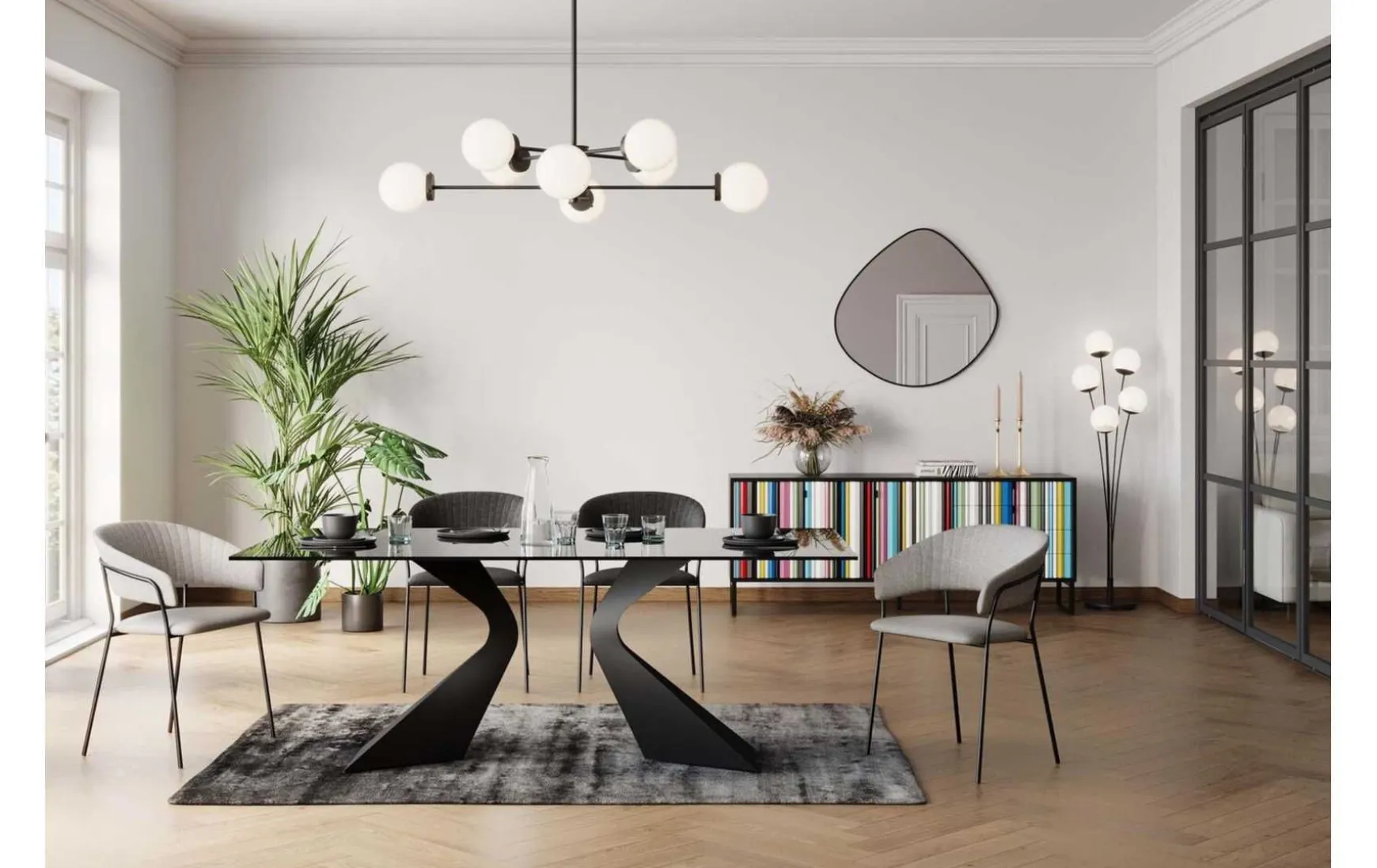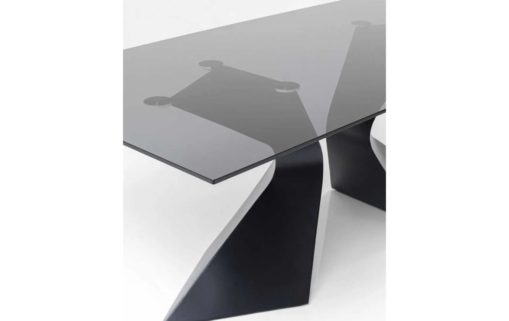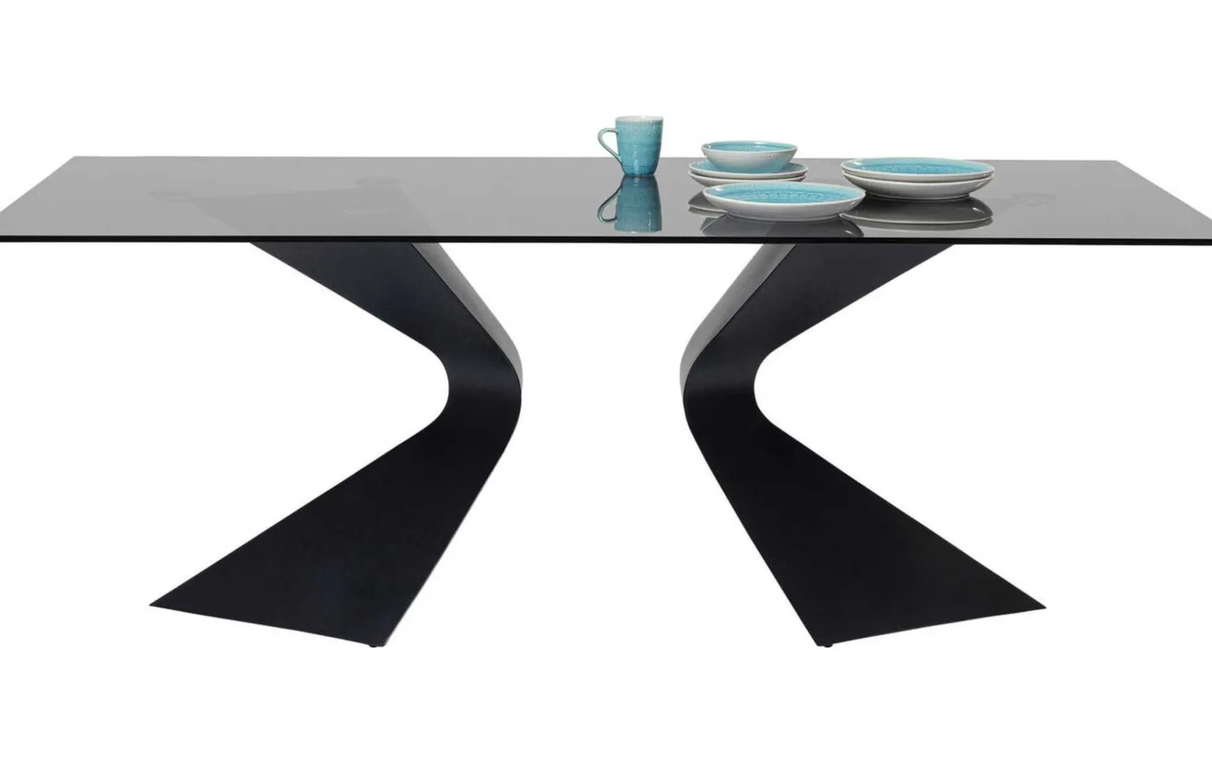 Dieser rechteckige Glastisch mit dekorativ geschwungenen schwarzen Stahlbeinen ist mehr als nur ein Esstisch – er ist ein echtes Showpiece für Ihr Zuhause. Mit Platz für bis zu acht Personen eignet er sich perfekt für gesellige Dinnerabende, Meetings oder als großzügiger Design-Schreibtisch. Die 13 mm starke Tischplatte aus gefärbtem Sicherheitsglas (ESG, smoked glass) verleiht dem Tisch eine luxuriöse, moderne Ausstrahlung. Getragen wird sie von zwei kunstvoll geformten, schwarz lackierten Stahlbeinen, die dem Möbelstück eine elegante, fast skulpturale Leichtigkeit verleihen. Trotz seiner Größe wirkt der Tisch fein und stilvoll im Raum – ideal für klassisch elegante Einrichtungen, monochrome Wohnkonzepte oder spannende Stilbrüche im modernen Interior. Mit einer maximalen Belastbarkeit von 150 kg überzeugt der Tisch nicht nur optisch, sondern auch funktional. Ob glamourös inszeniert oder minimalistisch gestylt – dieser Design-Esstisch setzt ein kraftvolles Statement und könnte ebenso gut als moderne Möbelskulptur in einer Galerie stehen.
