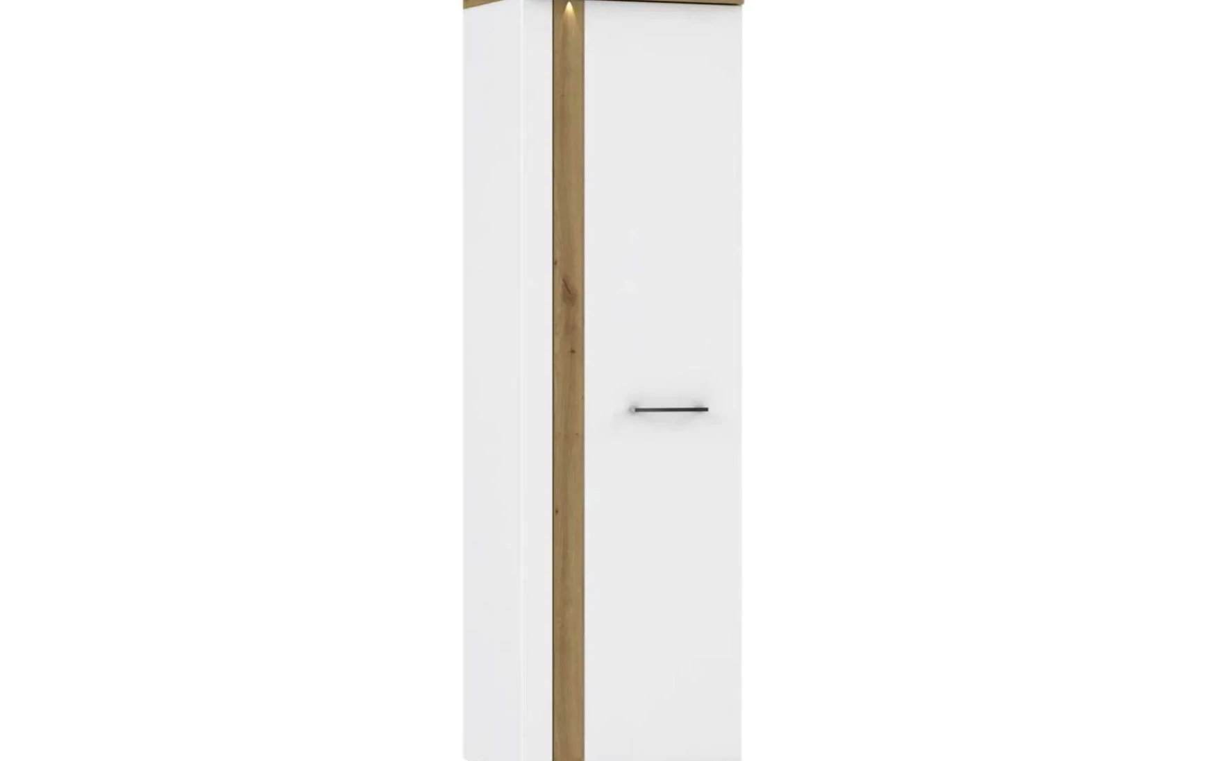 Dieser moderne Garderobenschrank in Weiß-Glanz und Artisan-Eiche vereint stilvolles Design mit praktischer Funktionalität für Flur, Diele oder Eingangsbereich. Die Kombination aus hochglänzendem Weiß und warmem Artisan-Eiche-Dekor verleiht dem Schrank eine elegante, zeitgemäße Optik und passt zu verschiedenen Einrichtungsstilen. Mit den Maßen von ca. 60,3 × 196 × 43,4 cm (B/T/H) bietet der Schrank ausreichend Platz für Jacken, Mäntel, Schuhe oder Accessoires. Das hochwertige Holzwerkstoff-Material sorgt für Stabilität und Langlebigkeit, während die pflegeleichte Oberfläche sich einfach trocken abwischen lässt. Im Preis ist bereits das Leuchtmittel enthalten, was den Schrank zusätzlich funktional und modern macht. Der Schrank wird zerlegt geliefert und lässt sich unkompliziert montieren.